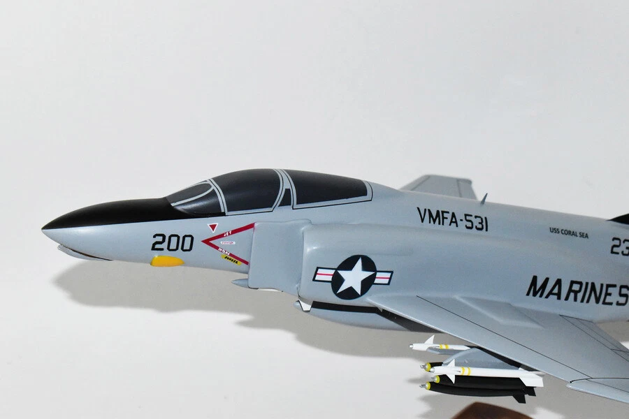 VMFA-531 GREY GHOSTS (1979) F-4N Model Fly with the VMFA-531 GREY GHOSTS (1979) F-4N Model in this hand crafted F-4 model. Each piece is carved from wood and hand painted to provide a piece you'll love. Length - 18 inches Made from Mahogany US Veteran Owned Business The product is not intended to be used by children 12 years and younger. Marine Fighter Attack Squadron 531 (VMFA-531) was a United States Marine Corps fighter squadron consisting of F/A-18 Hornets. Known as the "Grey Ghosts", the squadron participated in action during World War II and the Vietnam War. They were decommissioned on March 27, 1992. History World War II Marine Night Fighter Squadron 531 (VMF(N)-531) was activated on November 16, 1942 at Marine Corps Air Station Cherry Point, North Carolina.[1] On January 9, 1943 the squadron became part of the Fleet Marine Force and on April 1 was absorbed by Marine Aircraft Group 53 (MAG-53). The squadron took delivery of its first non-trainer aircraft, the Lockheed PV-1 Ventura on February 15. Due to the uniqueness of their night fight mission, VMF(N)-531 was placed under the direction of the Commandant of the Marine Corps until it was ready to deploy to combat. Responding to Japanese night attacks on Guadalcanal, MAG-53 was reassigned to the 3rd Marine Aircraft Wing on April 15, 1943 and was quickly ordered to deploy to the South Pacific as soon as possible. VMF(N)-531 was the first combat squadron to leave MCAS Cherry Point. After layovers in Hawaii and Espiritu Santo, the squadron finally arrived at Renard Field on Banika in the Russell Islands on September 11. Joining Marine Aircraft Group 21, 1st Marine Aircraft Wing, the Grey Ghosts flew their first combat patrol on September 16 making them the first naval aviation night-fighter squadron to operate in the South Pacific.[2] The squadron's first kill was made by Captain Duane Jenkins, who happened upon a Betty bomber on the evening of November 13, 1943. The first kill aided by GCI did not come until December 6.[3] During their tour in the Pacific, the squadron operated out of fields in the Russell Islands, Vella Lavella and Bougainville. They accounted for 12 enemy planes shot down by 5 different crews, all at night, with a loss of 6 of their own aircraft and 17 crew members, none of them a result of enemy fire. The squadron returned to MCAS Cherry Point on September 1, 1944 and was quickly deactivated only to be reactivated a short time later on October 13 at Marine Corps Auxiliary Airfield Kinston (MCAAF Kinston), North Carolina and reassigned to MAG-53, 9th Marine Aircraft Wing. A short time later the squadron moved to Marine Corps Air Station Eagle Mountain Lake near Fort Worth, Texas to operate as a training squadron for replacement pilots and ground control intercept operators being sent overseas. Following the conclusion of World War II, the squadron was relocated back to MCAS Cherry Point and in March 1947 reassigned to the 2nd Marine Aircraft Wing (2nd MAW). 1950s The Vietnam War On April 10, 1965, 15 F-4Bs from the squadron arrived at Da Nang Air Base, South Vietnam becoming the first land-based Marine Corps jets during the Vietnam War. They immediately began flying bombing missions under radar guidance and standard close air support missions in support of Marines on the ground.[4][5][6] The 1980s to 1992 On May 29, 1984, 531 received its first F/A-18 Hornet, becoming the 3rd fleet squadron to receive the new fighter. LtCol Keith J. Stalder was the commanding officer from December 1990 to the time the squadron was decommissioned March 21, 1992.