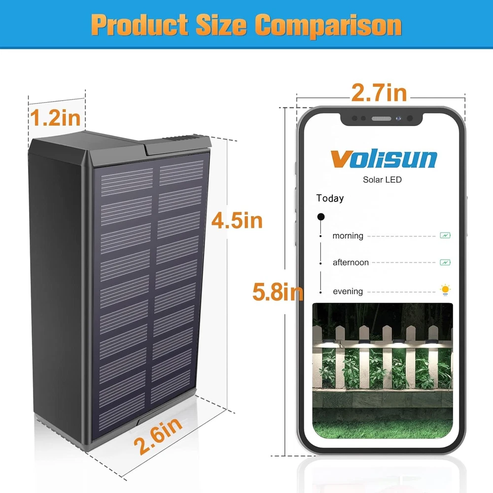 VOLISUN Solar Deck Lights Outdoor Fence 12-Pack, Cool White+Warm White Product Details Brand: VOLISUN Color: Cool White+Warm White Material: Acrylonitrile Butadiene Styrene Style: Modern Light fixture form: Wall Room Type: Outdoor Fence, Deck Railing Product Dimensions: 1"L x 1"W x 1"H Specific Uses For Product: Fence Lighting, Wall Lighting, Deck, Railing Lighting, Step Lighting Indoor/Outdoor Usage: Outdoor Power Source: Solar Powered Installation Type: Wall Mount Special Feature: Adjustable Color Temperature, Waterproof, Color Changing Control Method: Remote Light Source Type: LED Shade Material: Shell Number of Light Sources: 12 Light Color: 3000K Warm White, 5000K Cool White Included Components: 12 pack LED lights, 1*User manual, 24 sets of screws Embellishment: Fence Lighting, Wall Lighting, Deck Lighting, Railing Lighting, Step Lighting Lighting Method: Up/Down Light Item Weight: 1.81 Kilograms Number of Items: 12 Controller Type: Push Button Switch Type: Push Button Unit Count: 12.0 Count Water Resistance Level: Waterproof Mounting Type: Wall Mount Shade Color: White Fixture Type: Non Removable Assembly Required: No Size: 12-Pack Recommended Uses For Product: Outdoor Lighting Model Name: 21135ZM Part Number: 21135ZM Item Weight: 3.98 pounds Country of Origin: USA Item model number: 21135ZM Special Features: Adjustable Color Temperature, Waterproof, Color Changing Plug Format: A- US style Batteries Included?: No Batteries Required?: No Product Dimensions : 1 x 1 x 1 inches; 3.99 Pounds Item model number : 21135ZM Country of Origin : USA Brand: VOLISUN Color: Cool White+Warm White Material: Acrylonitrile Butadiene Styrene Style: Modern Light fixture form: Wall 【Highest Industry Standards】Aiming at the problems of solar steps light on the market,we have upgraded the size of the solar panel, the battery capacity and the waterproof level,which means that the lighting time and service life of the solar deck lights will be greatly improved. What's more, we provide lifetime item Technical Support and do our best to minimize your losses. 【2 Colors Available】3000K Warm White and 5000K Cool White, meet your daily lighting. The color adjustment button is external, you can easily adjust your fence light at any time, very suitable for your deck, fence, Railing and Stairs. 【Waterproof & Long Lighting time 】With hard ABS shell, the solar deck light is designed to withstand rain, wind, or small snowy days . 4-6 hours solar charging time, solar deck lights enough to supply the leds up to 12 hours, maybe they're still there when you wake up the next morning. 【2 installation methods】The exclusive product design creates more installation possibilities for solar deck lights, no need to worry about whether the size of the solar step lights matches your stairs perfectly, or whether it can win your fence lighting, they are definitely the best choice for outdoor lighting. 【Installs in Minutes】Out-of-the-box, No wiring, this solar deck lights can be installed in anywhere the sunshine with screws. VOLISUN deck lights set contains screws which can be easily solved even by the elderly, and it’s safer for the whole family to go downstairs at night. The set includes screw fittings,out of the box.
