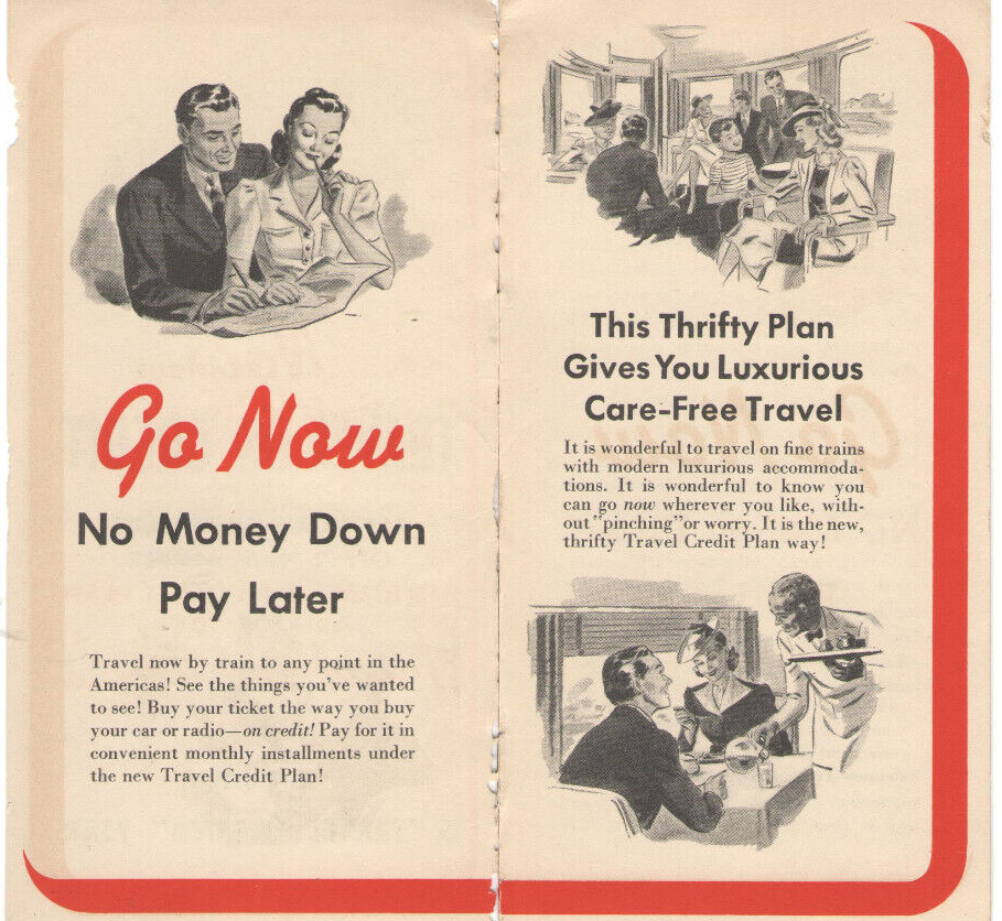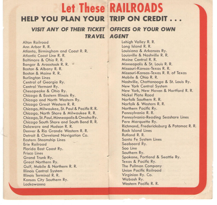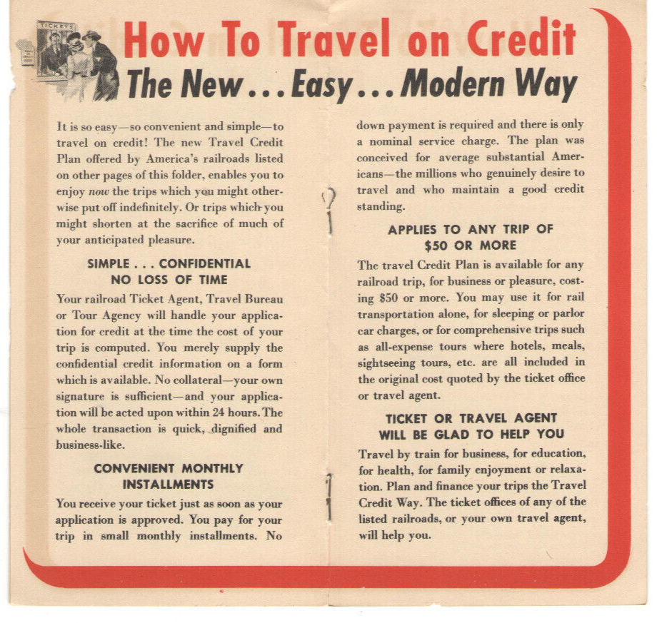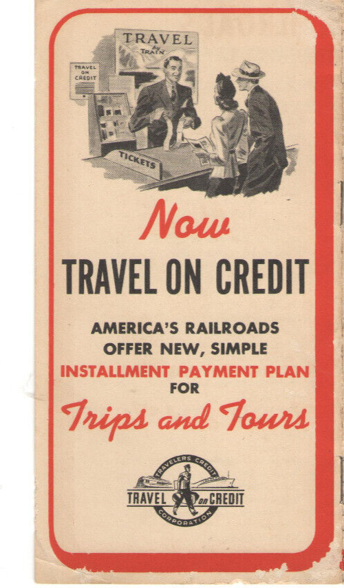 VINTAGE 1940 BROCHURE! TRAVEL AMERICA'S RAILROADS/TRAINS ON CREDIT! INSTALLMENT PLANS A terrific collectible - A 1940 TRAVEL BY RAILROAD ON CREDIT BROCHURE! 8 PAGES INCLUDING COVERS, 3 1/4" x 6 1/4" AMERICA'S RAILROADS OFFER NEW, SIMPLE INSTALLMENT PALNS FOR TRIPS & TOURS! NO MONEY DOWN, PAY LATER IT HAS A LIST OF ALL THE RAILROAD LINES YOU CAN USE WORN EDGES, SIGNS OF USE & AGE ORIGINAL, NOT A REPRODUCTION ADD TO YOUR COLLECTION!!! A RARE FIND!!! Shipping US Mail PAYPAL Welcome!!!