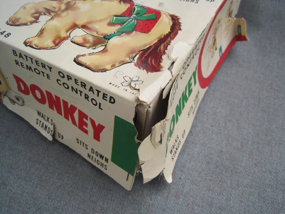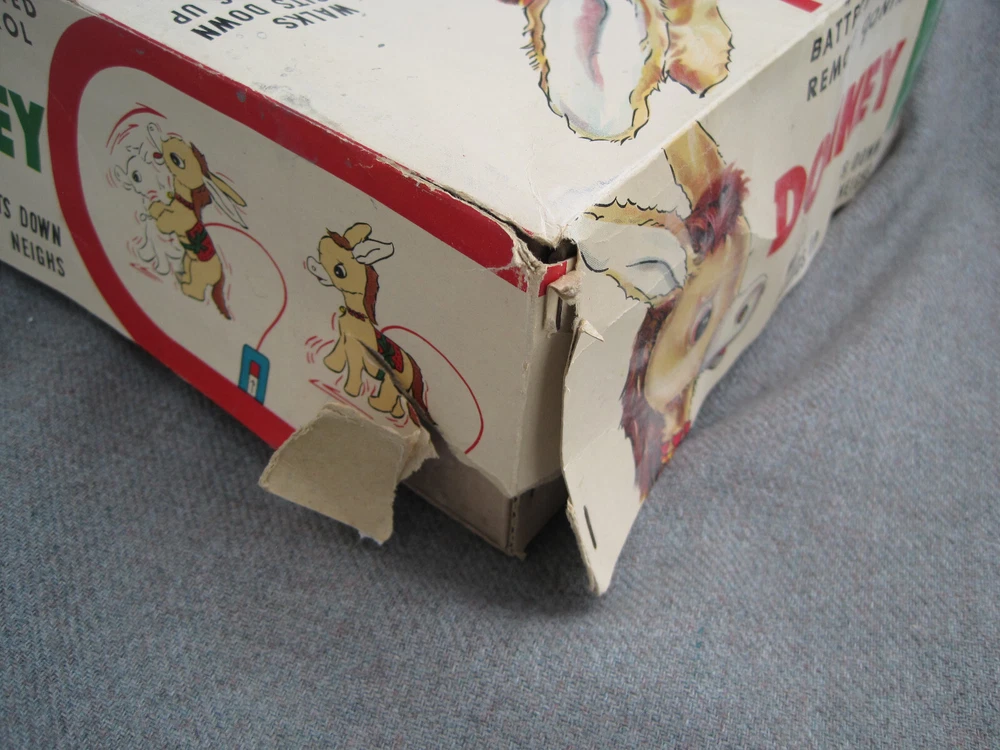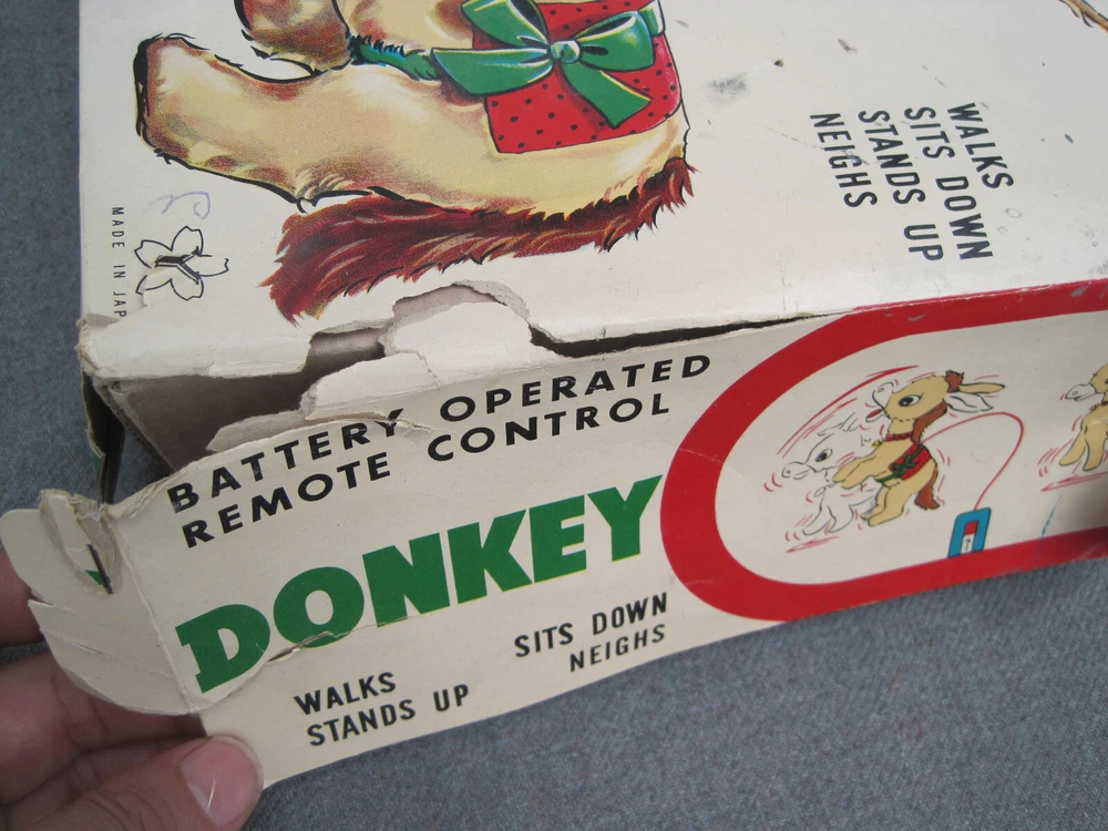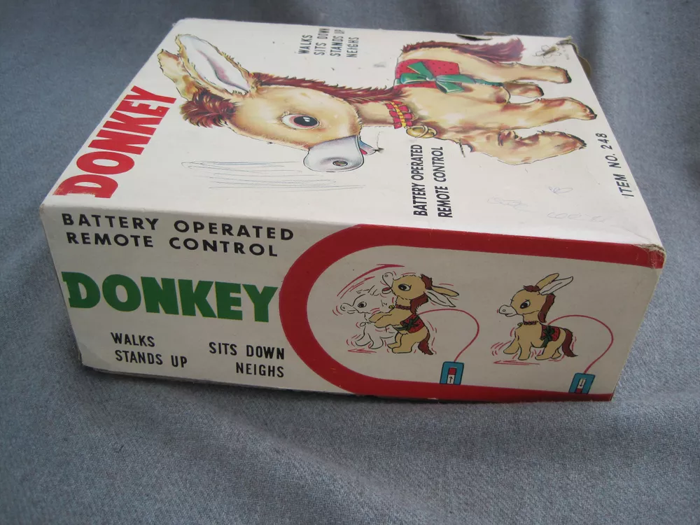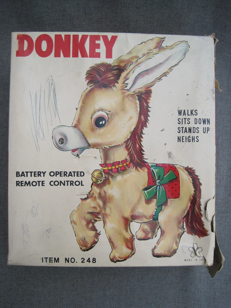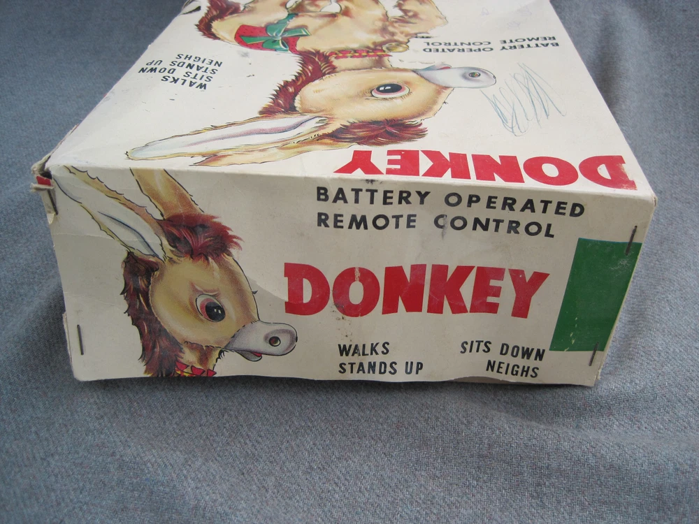 THIS TOY DOES NOT WORK AND IS OFFERED FOR PARTS or REPAIR. This listing is for a vintage 1950's or early 1960's toy. The box reads, "DONKEY...BATTERY OPERATED REMOTE CONTROL...ITEM NO. 248...MADE IN JAPAN." It has the Yone / Yonezawa trademark. (The letter "Y" inside a flower with 5 petals.) The toy and battery compartment are both clean and I'm "GUESSING" that this is an easy fix - IF you know what to do. (I haven't a clue.) While toy displays nicely, the BOX is in POOR condition. Two corners and one side of the box are SPLIT and TORN. The box top has some ink scribbles. This item is guaranteed to be old & original or your money back. I am here to help you with any questions!!! WE stand behind all of our merchandise and we believe in treating our customers like we want to be treated! If for any reason you are not happy with your purchase, send it back and we will be happy to refund your money ! High bidder pays $9.00 for Ground Advantage Mail USPS shipping and delivery confirmation in the U.S. U.S. SHIPPING ONLY Payments must be received within 3 days of auctions ending date. MONEY BACK GUARANTEE !! HAVE A GREAT DAY !!