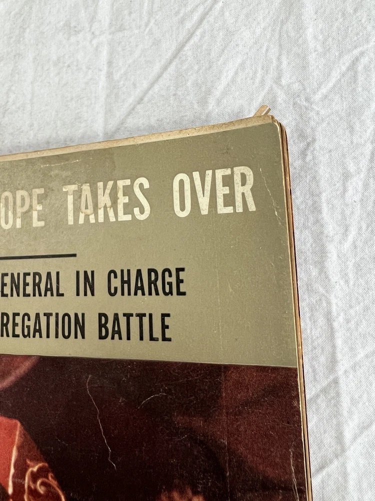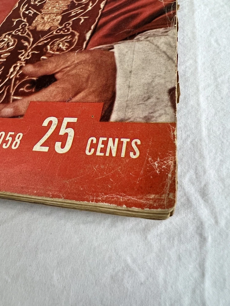 This vintage Life Magazine from 1958 features Pope John XXIII receiving homage while wearing his papal robes. The magazine is a collector's edition and a rare find for history enthusiasts. The publication is in English and has not been personalized. It is an original print and not a facsimile, with a hardcover binding and special attributes that make it a valuable addition to any collection. The magazine was published by Life and printed in the United States, with a focus on historical topics related to North America. See photos for more details.