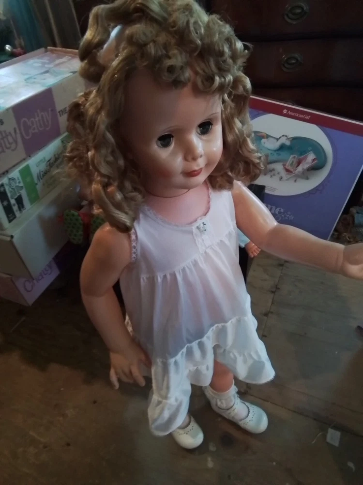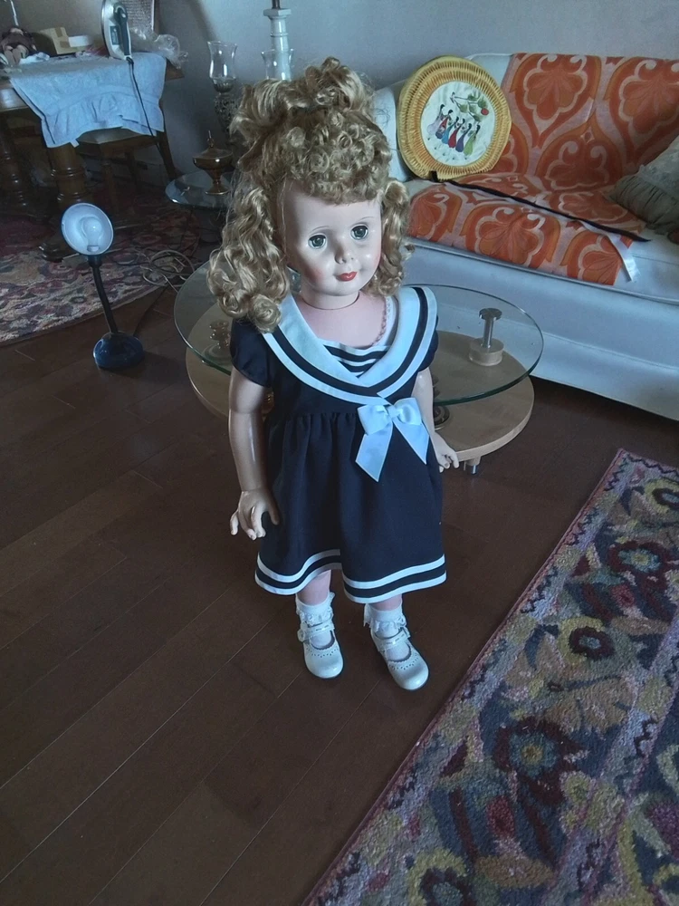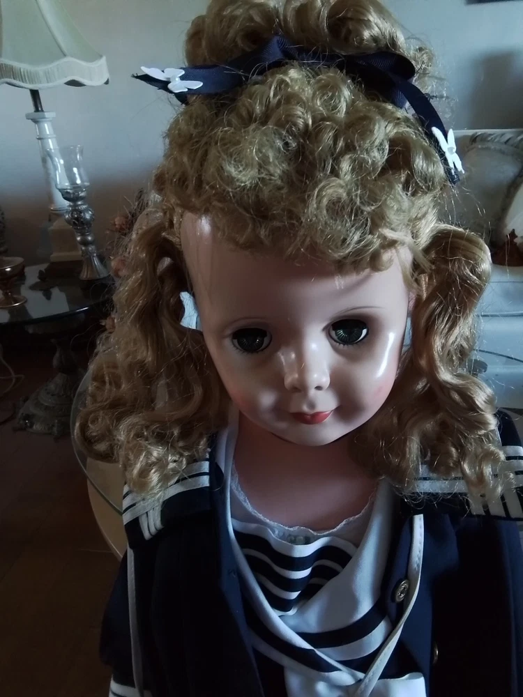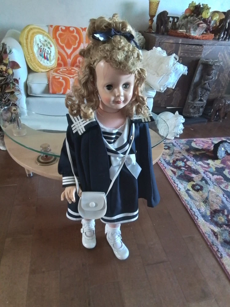 Vintage 1960s 30" Patti Playpal Companion Style of doll. She is a unmarked doll. She is a walker doll Doll normally stands alone. I say normally because after I put the shoes on her. I had to apply more effort to have her stand alone. Her blonde hair is freshly washed and set. Blue Sleep Eyes with full lashes...Working open/shut...she has circular spiral rotted blonde hair ( see pic) .She is wearing a navy blue and white sailor dress and coat ( not a set), navy panties, white ruffle socks, white slip, white patten leather shoes ( scuffs on the toes) . I added white butterflies on the tips on the navy ribbon. She looks adorable. Plastic Body and legs. Hard Vinyl arms &Vinyl Head. She is not perfect, yet in great vintage condition. Please look very closely before bidding. Selling as is. Comes from a smoke and pet free home. Any questions please email. Thank you for looking GREAT Doll!!!