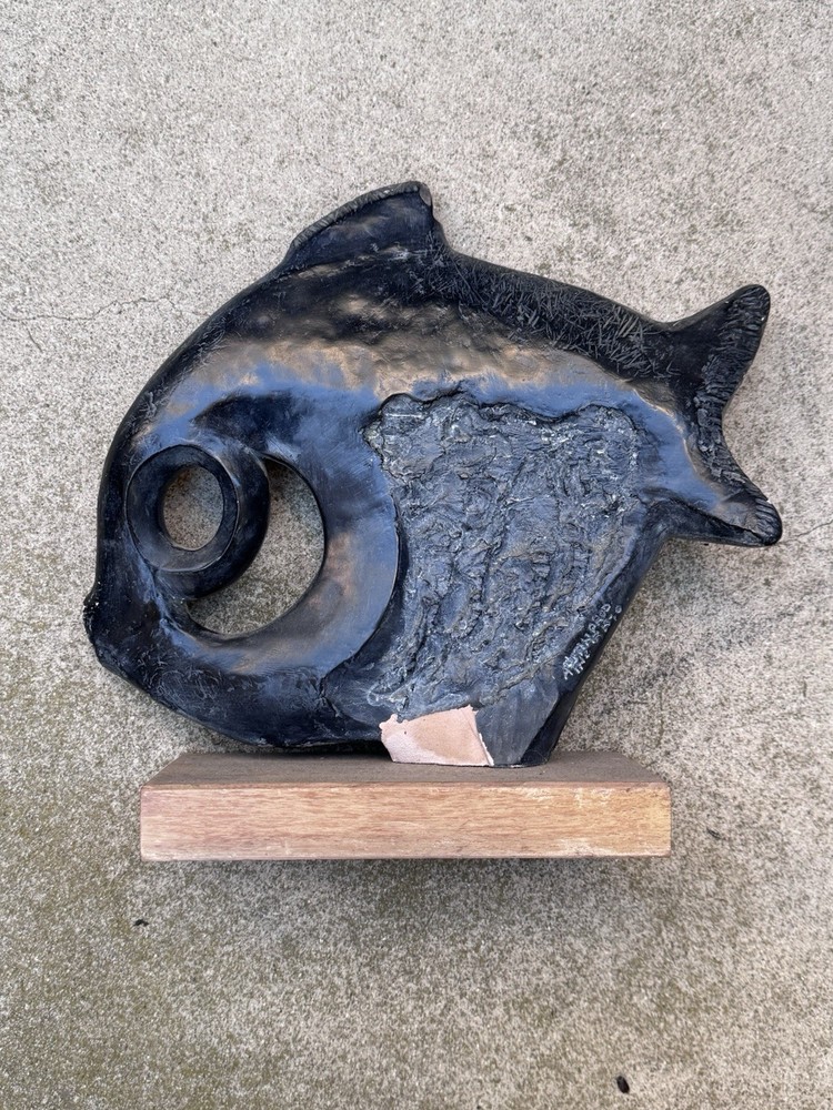 This stunning vintage clay sculpture adds a unique artistic flair to any room. The abstract fish design is beautifully crafted with clean modernist lines, giving it a timeless yet bold presence. The quality and detail make it a standout piece—perfect for art lovers who appreciate mid-century style. A true conversation starter!