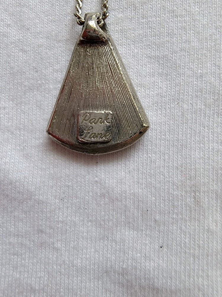 This VTG 1980s Park Lane silver tone Mother of Pearl necklace features an asymmetrical pendant with an oval-shaped main stone. The necklace is signed, made with natural materials, and has a lobster closure. The modernist style and vintage charm make it a unique piece of jewelry, perfect for adding a touch of sophistication to any outfit. The multicolor Mother of Pearl shell material adds texture and interest to the chain design, making it a standout accessory for any jewelry collection.