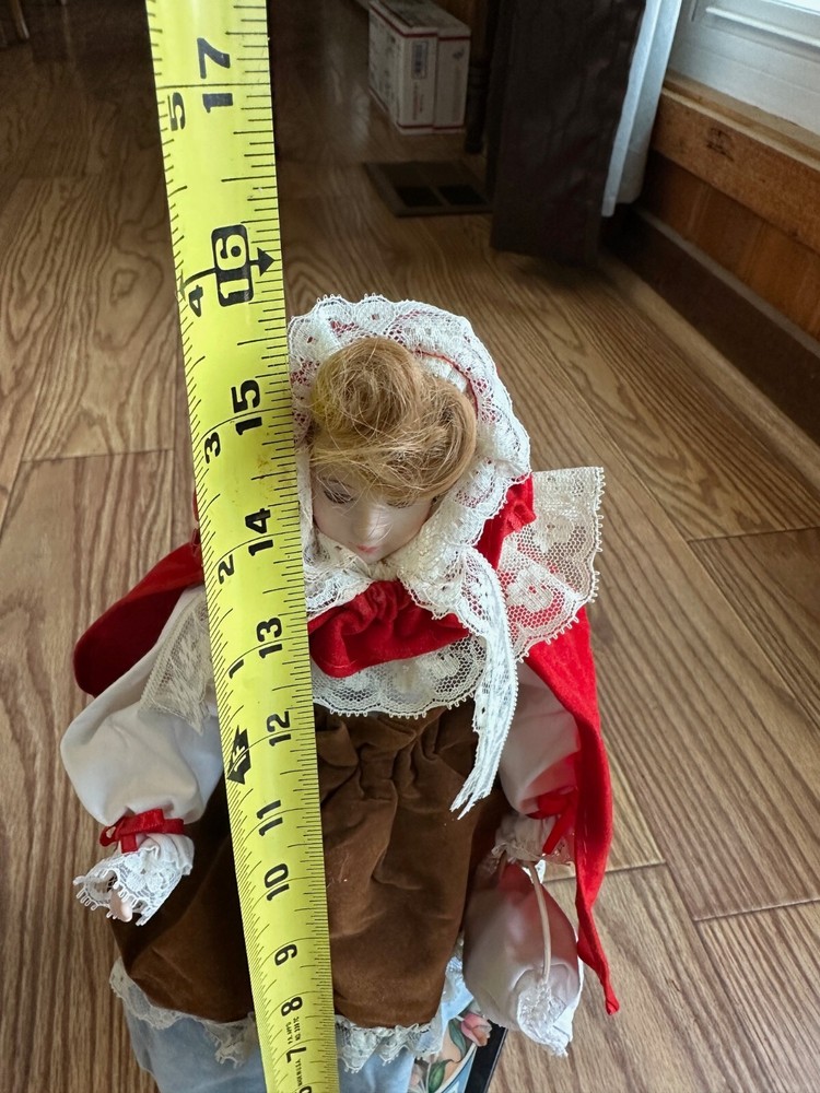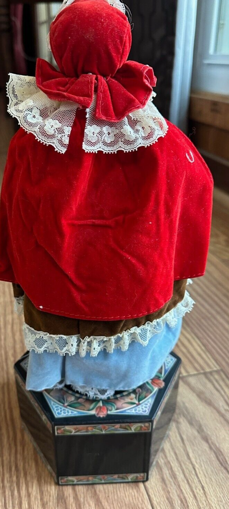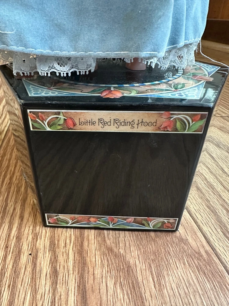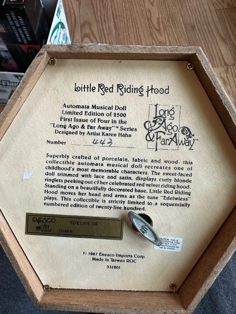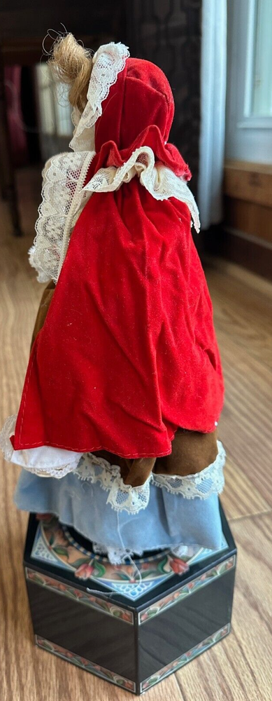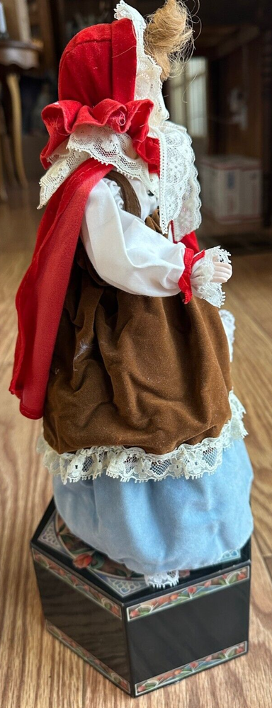 This vintage 1987 Enesco automated musical doll features the character "Little Red Riding Hood" designed by artist Karen Hahn. The doll plays the tune "Edelweiss" and is part of the Red Riding Hood franchise. Made of mixed materials, this collector's edition doll is a girl doll with animated features and was manufactured in Taiwan during the 1980s. The set includes the doll as the central piece, making it suitable for all occasions and a unique addition to any doll collection.