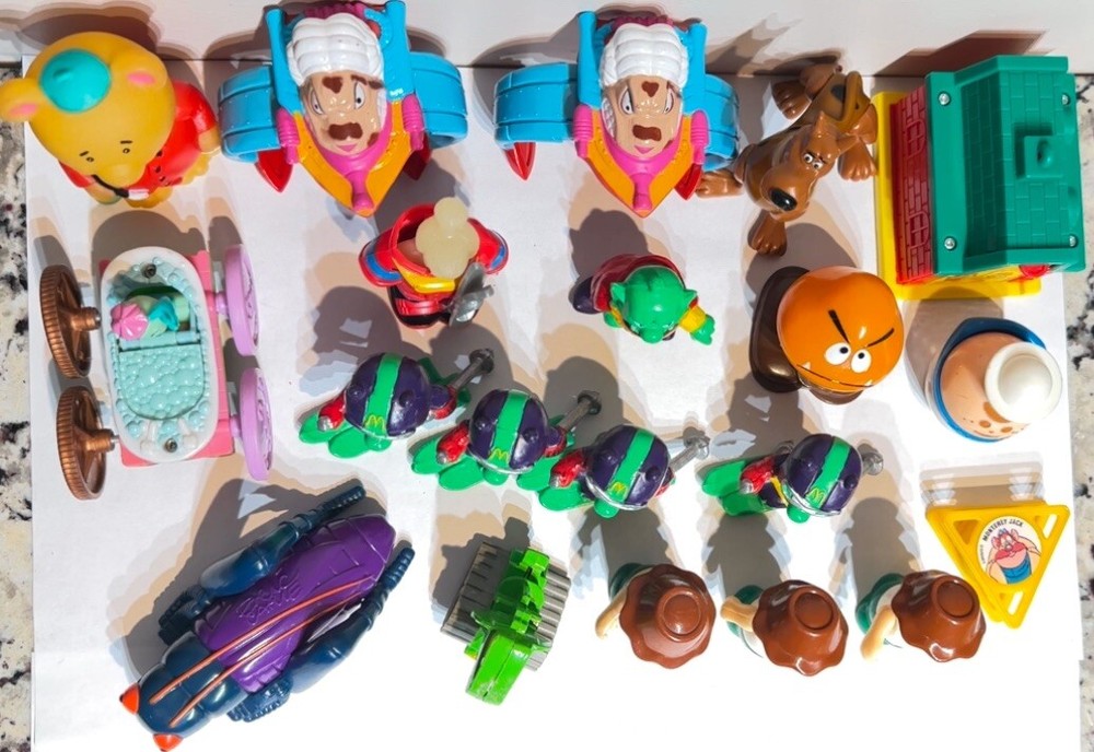 Please message me if you would like additional information or photos. Everything pictured comes as is. This vintage lot includes 21 Happy Meal toys from the 1980s and 1990s, featuring a mix of toys from McDonald's and Burger King. The toys are from the years 1984 to 1996, offering a nostalgic collection that spans over a decade of fast food promotions. The character family included in the lot is described as mixed, appealing to a wide range of tastes and preferences for children aged 4-7. With brands such as Disney+ represented, this lot offers a diverse selection of collectible toys from popular fast-food chains of the past.