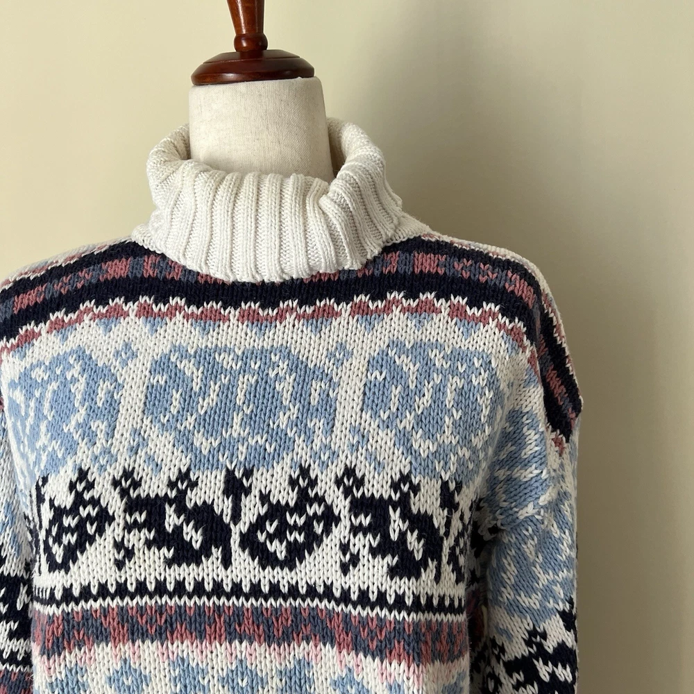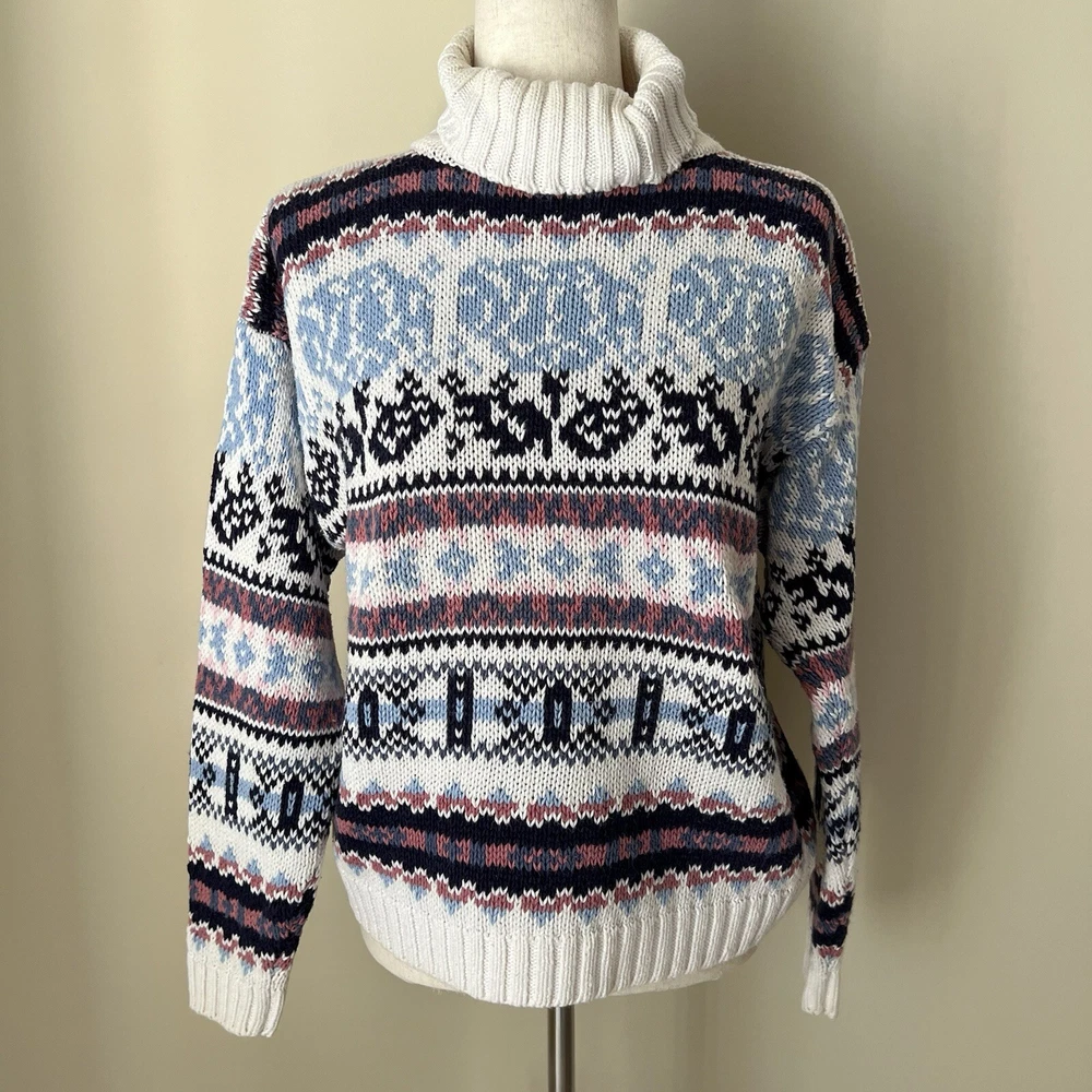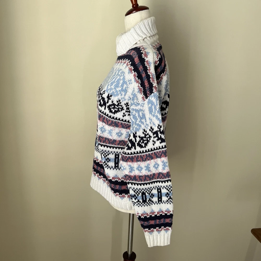 Please note hole shown in pictures cannot be seen when wearing sweater due to the location on the turtleneck. This vintage Grandma sweater from Paris Sports Club is a must-have for any stylish woman. The chunky-knit sweater features a colorful floral pattern and a turtleneck neckline. The long sleeves and heavyweight fabric make it perfect for the colder seasons, whether you're hitting the slopes or just running errands. The sweater is made from a cotton-ramie blend and is breathable, making it comfortable to wear for extended periods. The pullover style and regular fit make it a versatile addition to any wardrobe. This sweater is perfect for travel, parties, or even casual outings. It's easy to care for with hand wash only instructions.