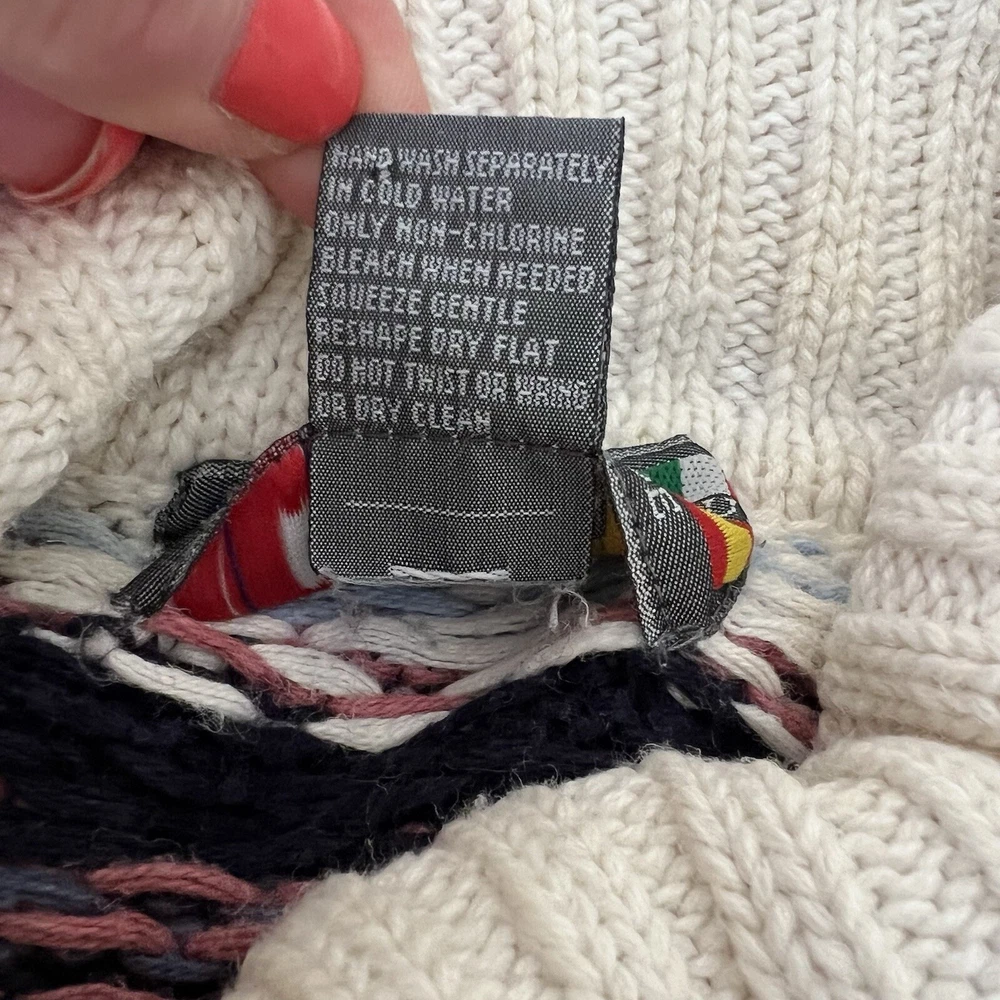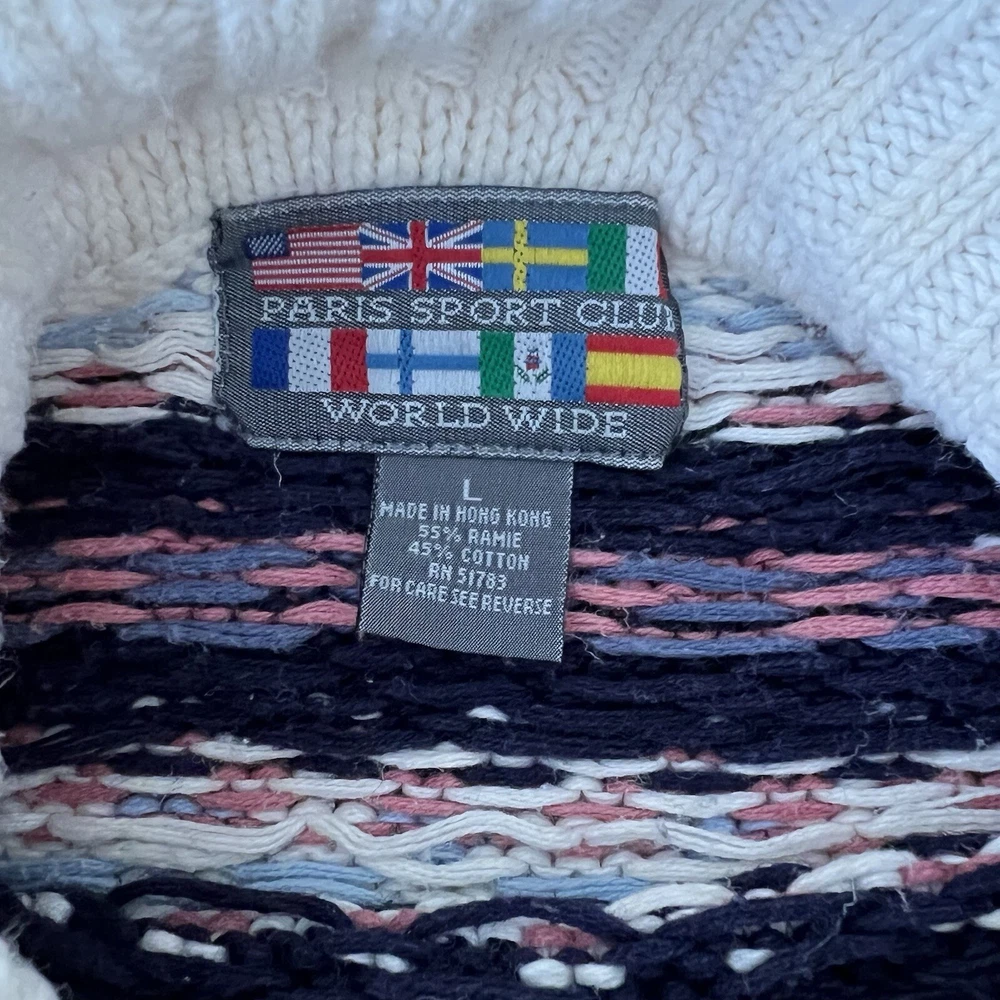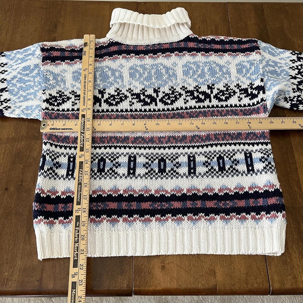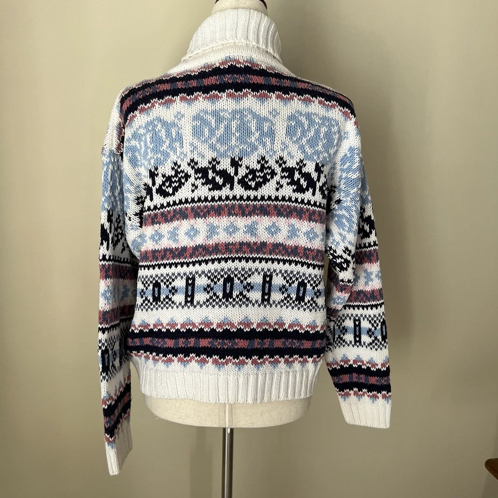 Please note hole shown in pictures cannot be seen when wearing sweater due to the location on the turtleneck. This vintage Grandma sweater from Paris Sports Club is a must-have for any stylish woman. The chunky-knit sweater features a colorful floral pattern and a turtleneck neckline. The long sleeves and heavyweight fabric make it perfect for the colder seasons, whether you're hitting the slopes or just running errands. The sweater is made from a cotton-ramie blend and is breathable, making it comfortable to wear for extended periods. The pullover style and regular fit make it a versatile addition to any wardrobe. This sweater is perfect for travel, parties, or even casual outings. It's easy to care for with hand wash only instructions.