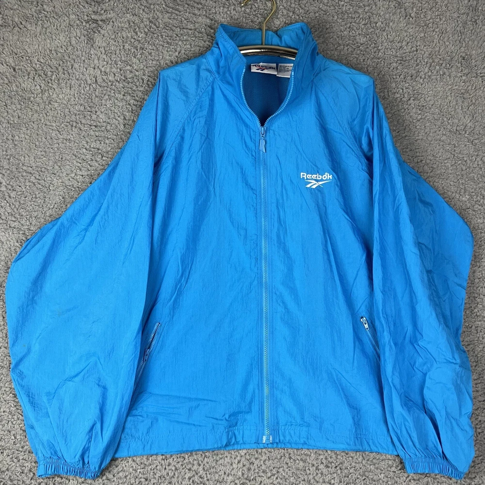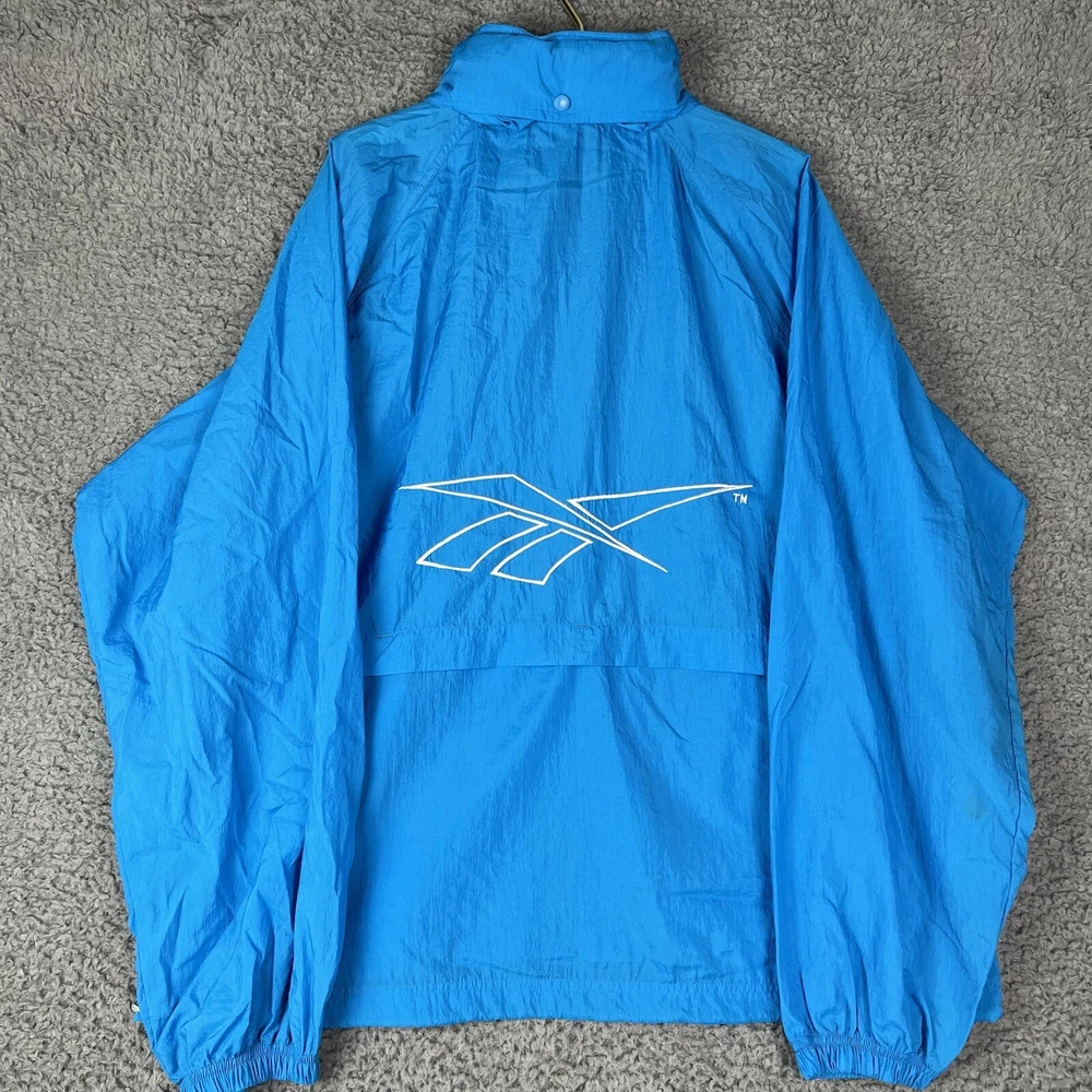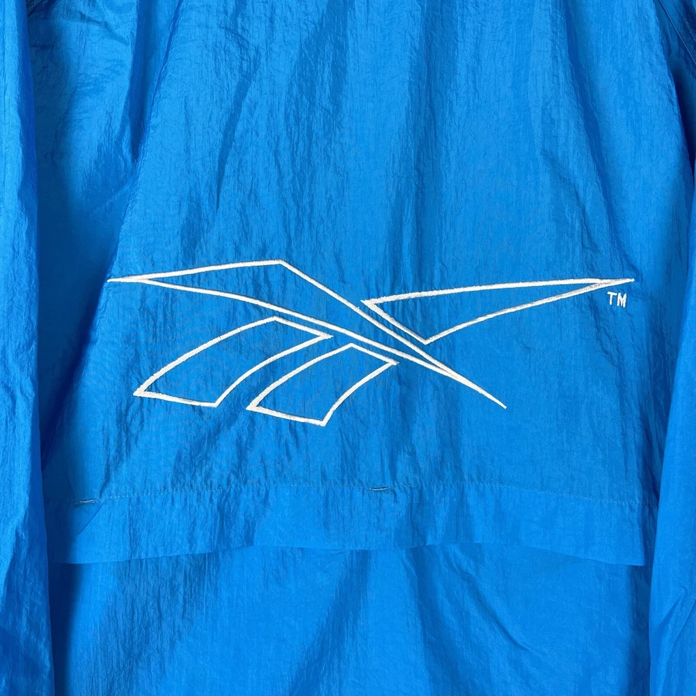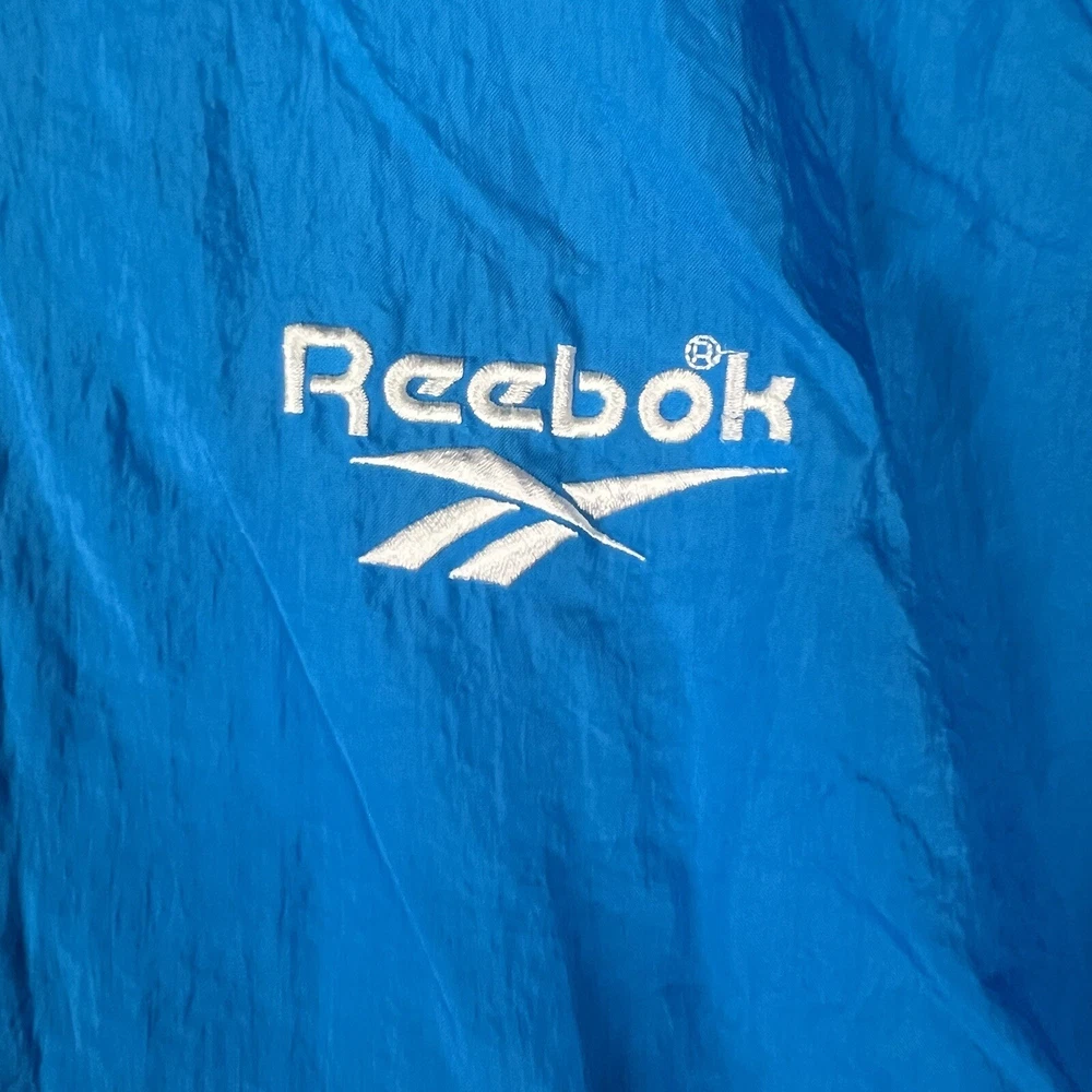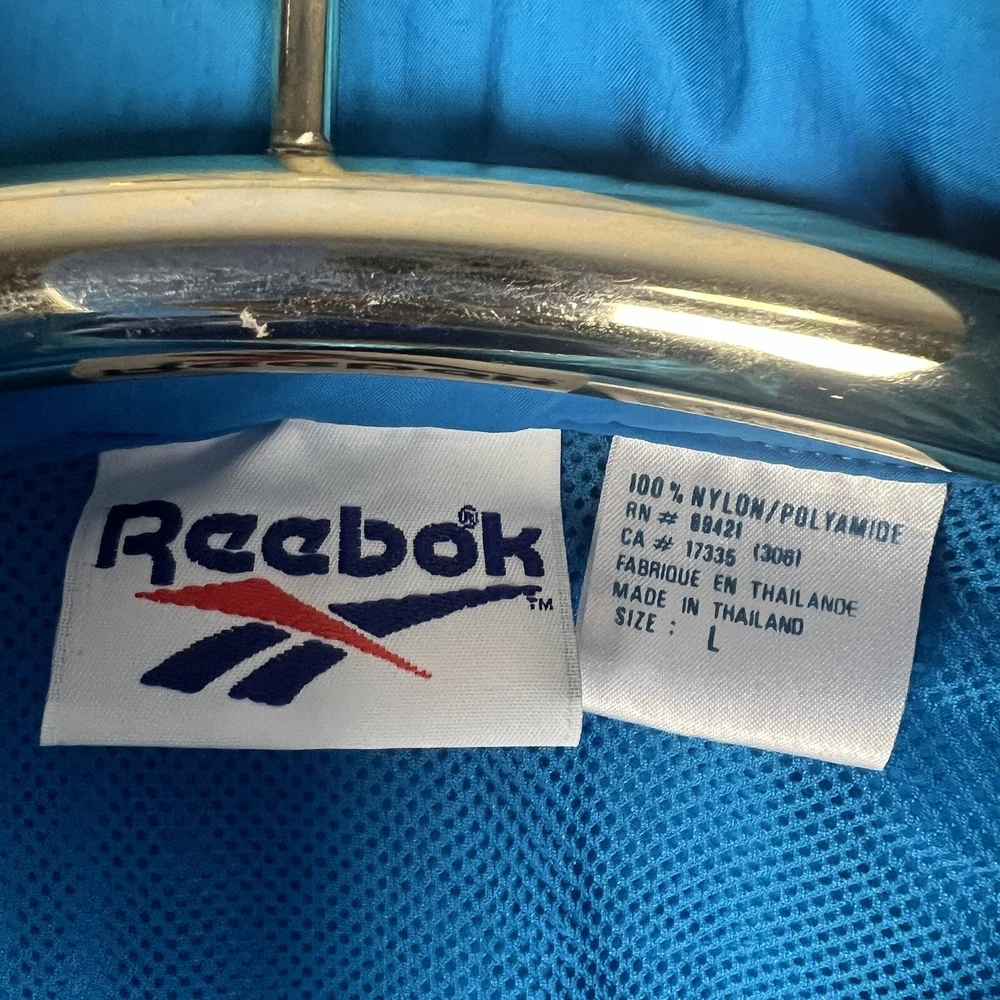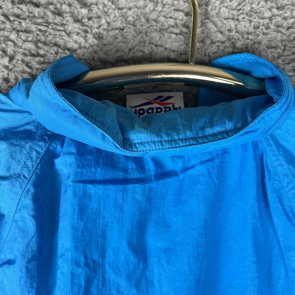 This vintage Reebok windbreaker is the perfect addition to any casual sportswear or beach outfit. The blue nylon material and full zip design give it a classic 90s look. The loose fit and hood included provide comfort and protection against the wind. This original piece was made in Thailand and is sized for men's regular fit. The Reebok brand is known for quality and style, making this windbreaker a great find for any vintage clothing enthusiast. Don't miss out on the chance to add this unique piece to your collection. ** Note: vintage Reebok includes the hood inside of a “secret pocket” in the collar as seen in pics 15, 16 & 17.