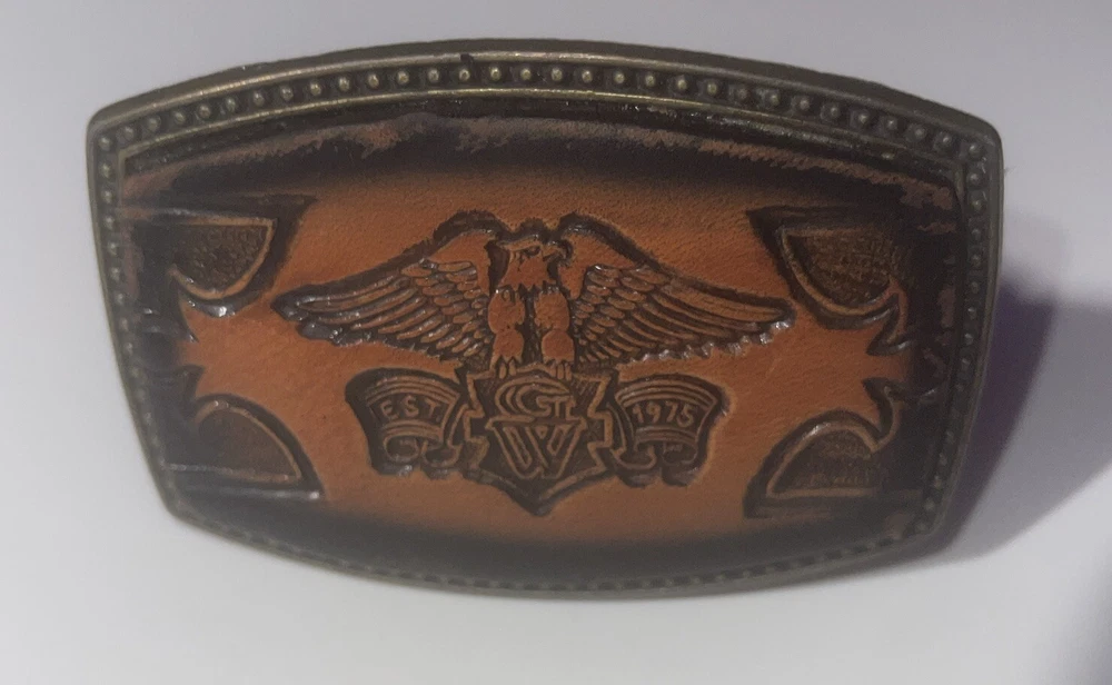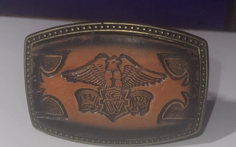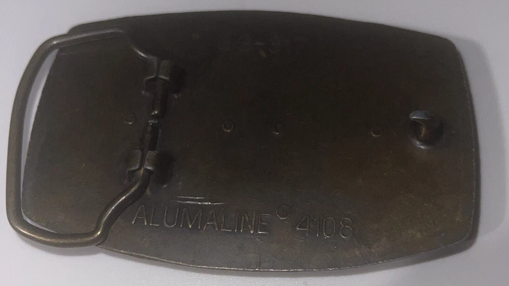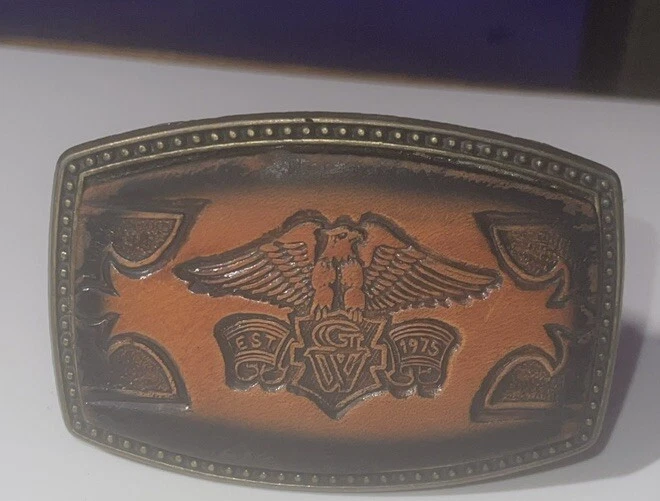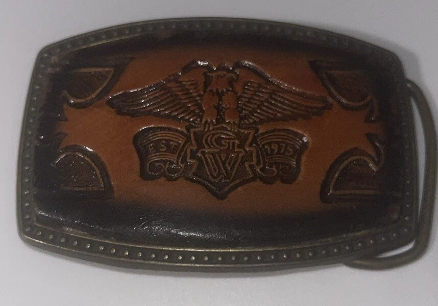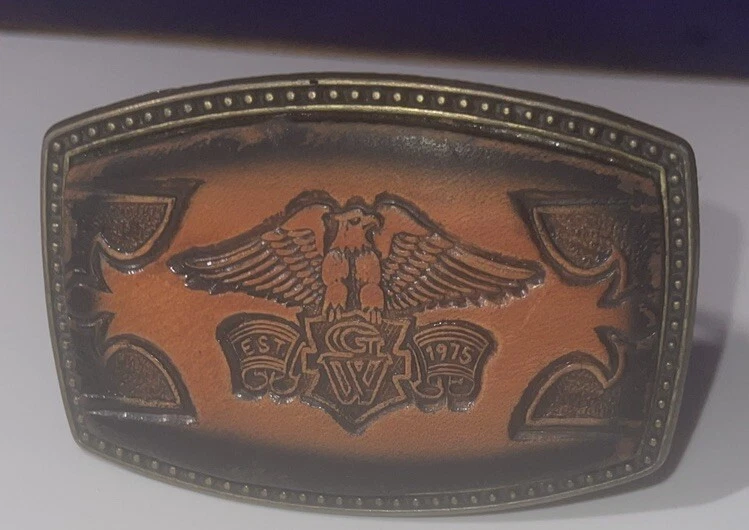 This vintage Alumaline belt buckle features a Honda Goldwing logo on a leather background, embodying a 1980s rockabilly motorcycle theme. The bronze metal buckle was made in the United States, showcasing an original design perfect for motorcycle enthusiasts.