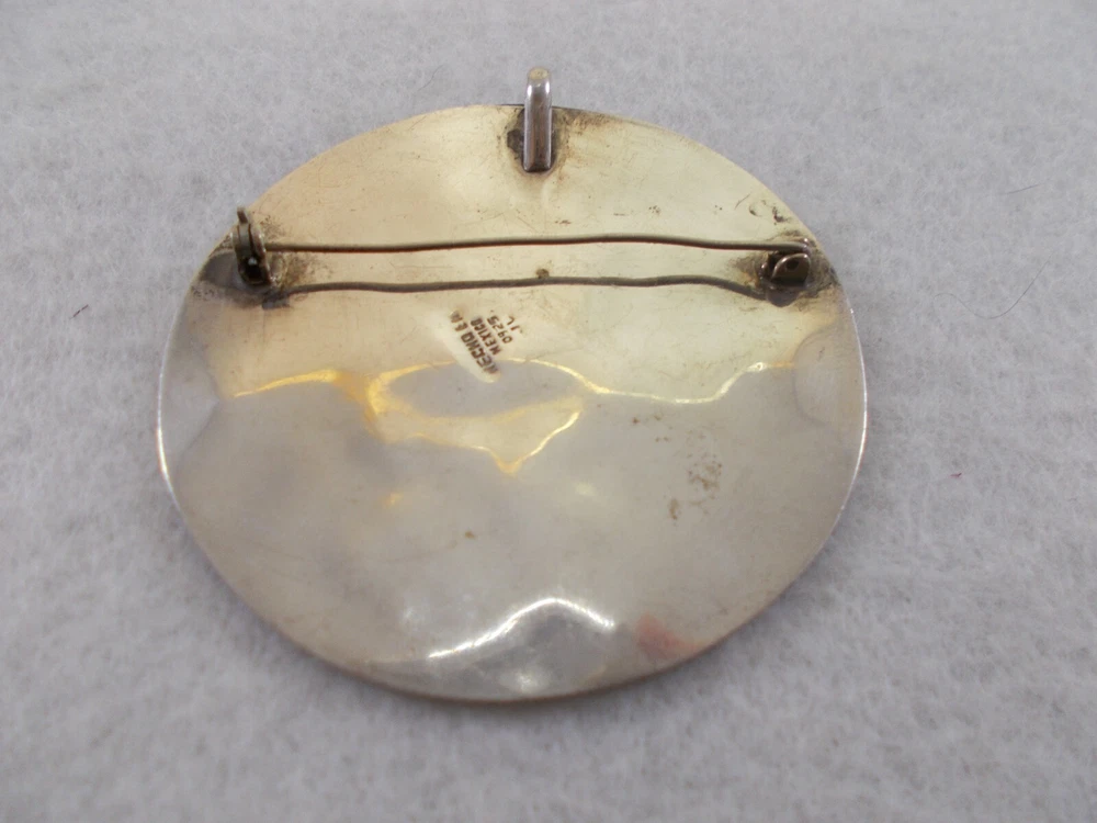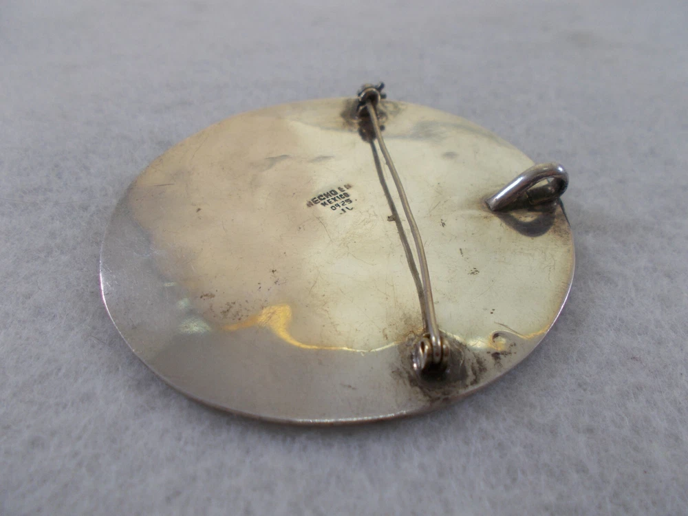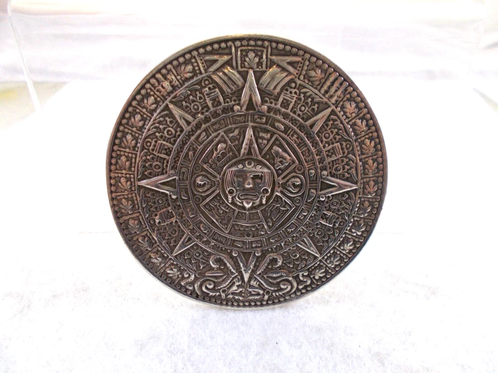 This sterling silver brooch has a bale so it can worn as a pendant. It is 2 1/2" in diameter and is a reproduction of the Aztec calendar with the Sun God in the center. It is beautifully detailed. It was purchased in Mexico in the late 1970's and is signed on the back "Hecho en Mexico" 0925 JL Gift boxed. Combined shipping is available. $4.75 for first item purchased with USPS Ground Advantage. Plus $.75 for each additional item purchased at the same time. To combine shipping on items that have different shipping cost methods (flat rate, shipping included, calculated shipping), exact weight of package will calculated and excess shipping will be refunded.