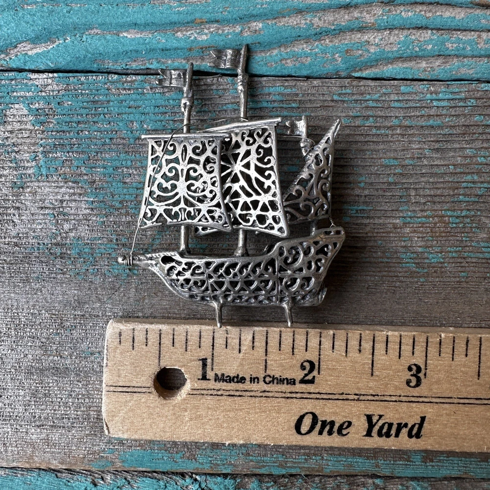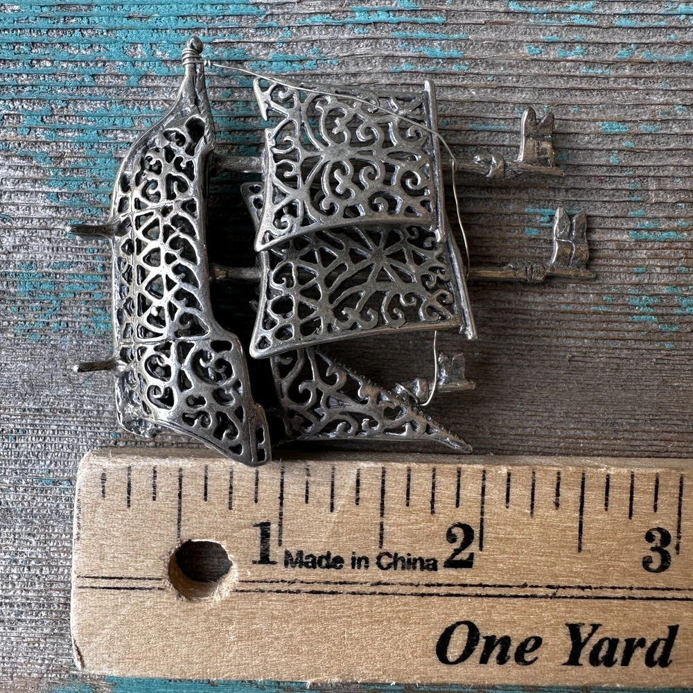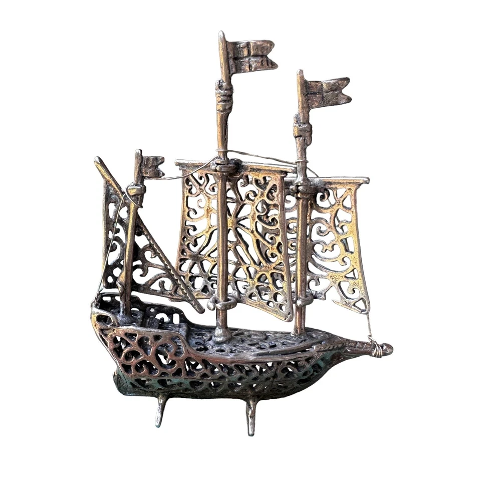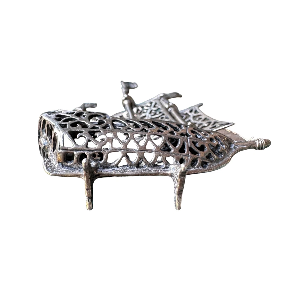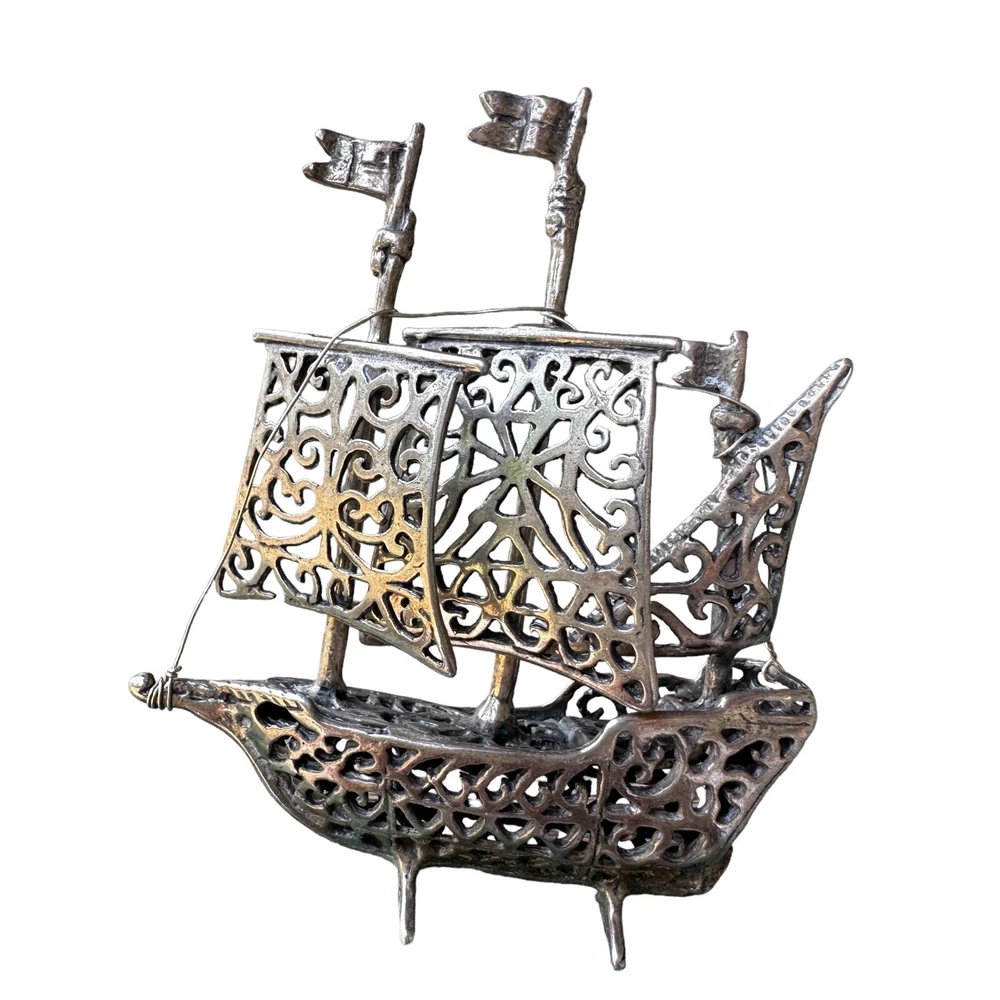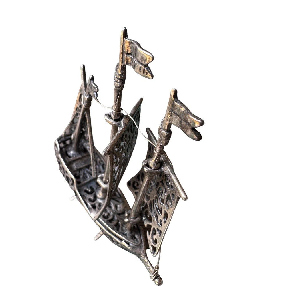 This vintage boat ship sculpture is a beautiful piece of art deco style. Crafted from solid stamped 925 sterling silver, it features intricate ornate filigree details that are sure to catch the eye. Made in Italy, this sculpture weighs 24.2 grams and is a stunning addition to any nautical or antique collection. Stamped 1547 AR has movable sails along with a pair of stands allowing this item to stand upright.