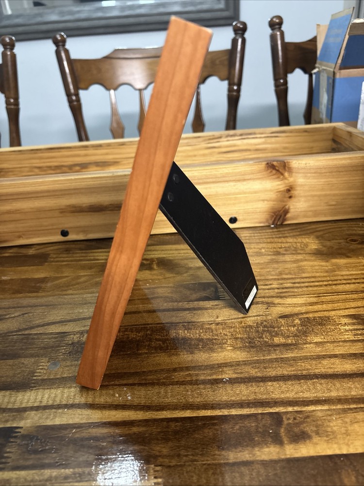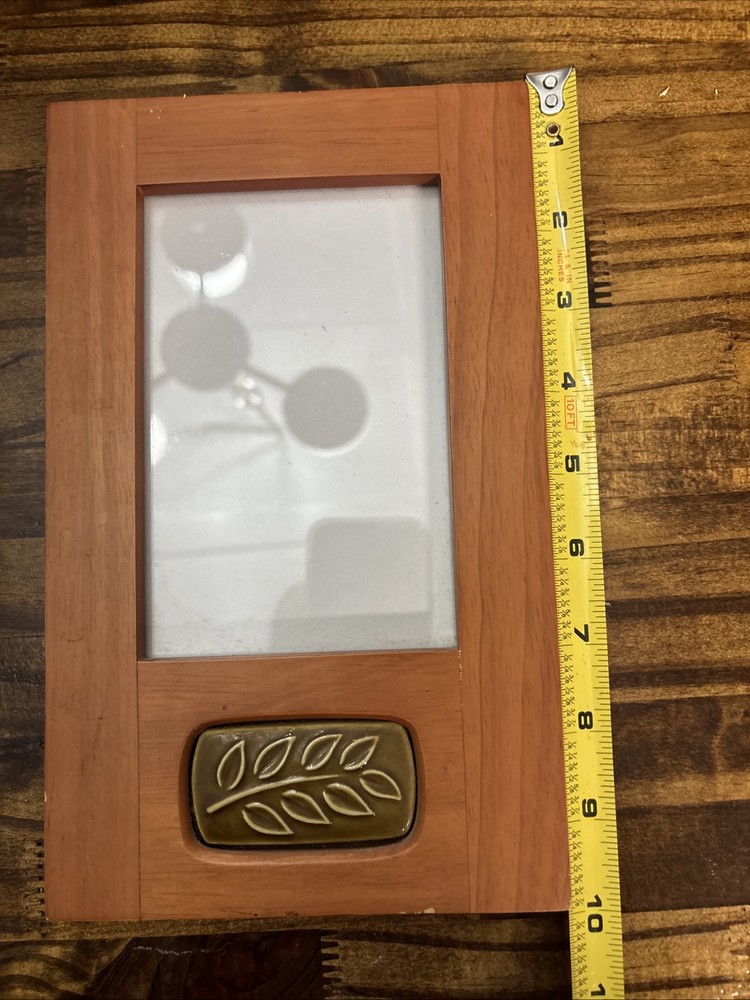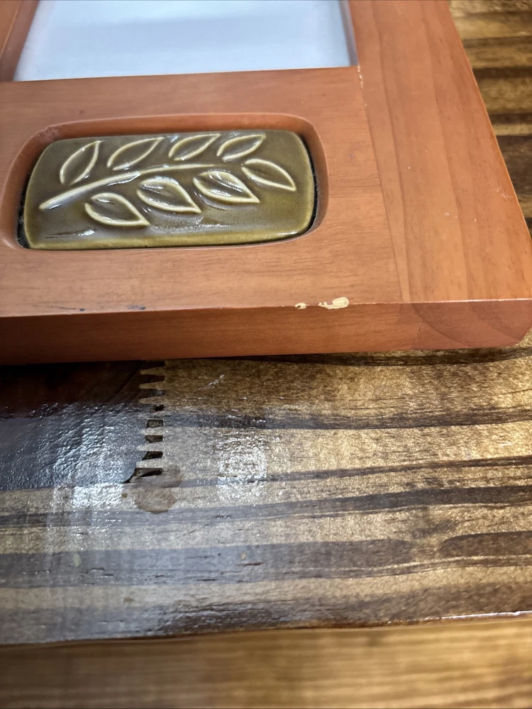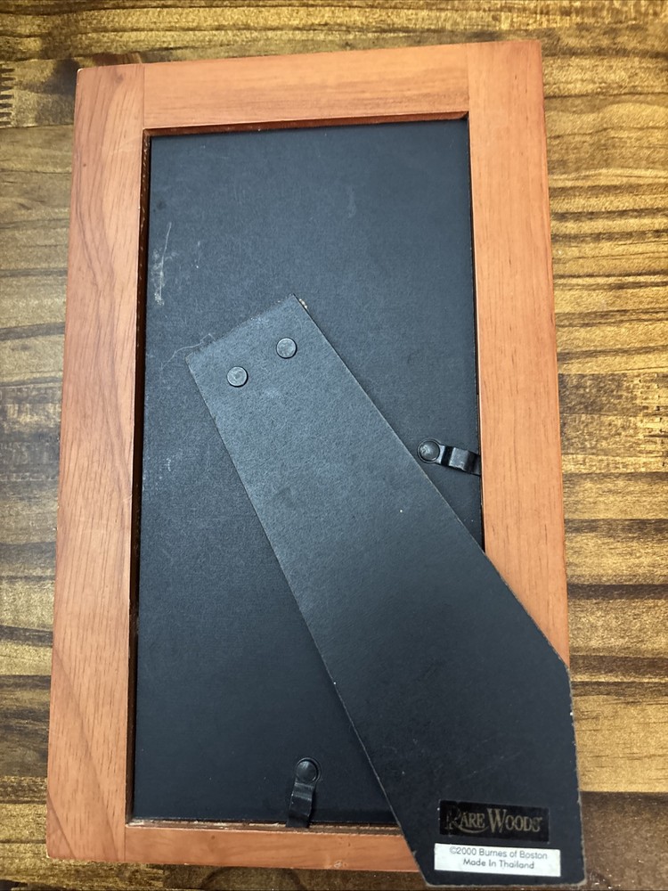 This vintage Burnes of Boston Rare Woods picture frame features an ornate Art Deco style with a ceramic tile insert, suitable for a 4x6 inch photo. Handmade from wood with a brown finish, it has an adjustable viewing angle and can be displayed vertically. The frame also includes intricate foliage patterns and clear glass. This item was manufactured in 2000 in Thailand as part of the Rare Woods 2000 collection.