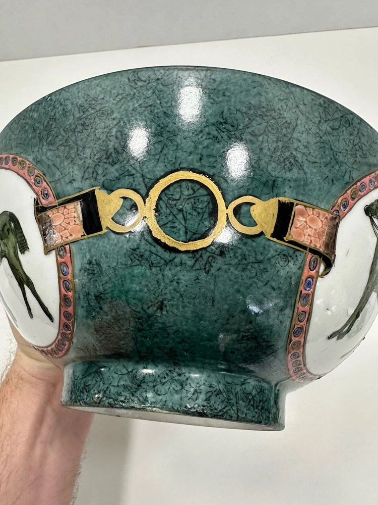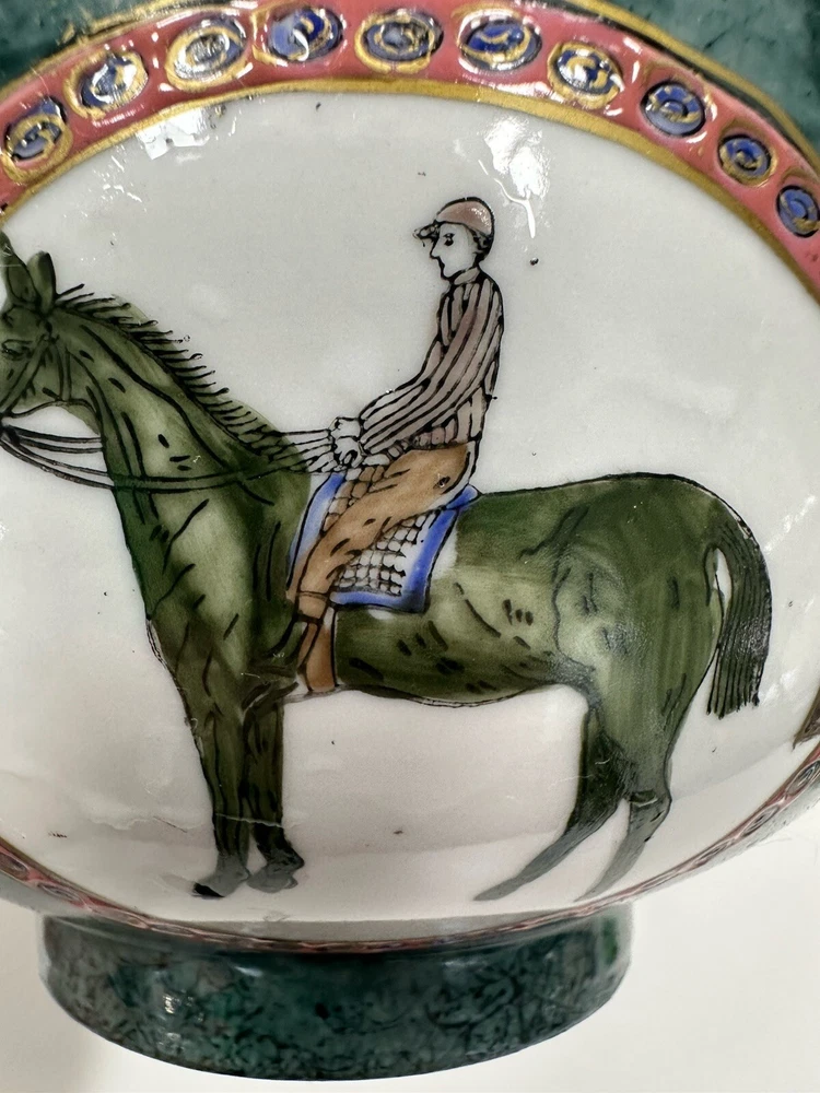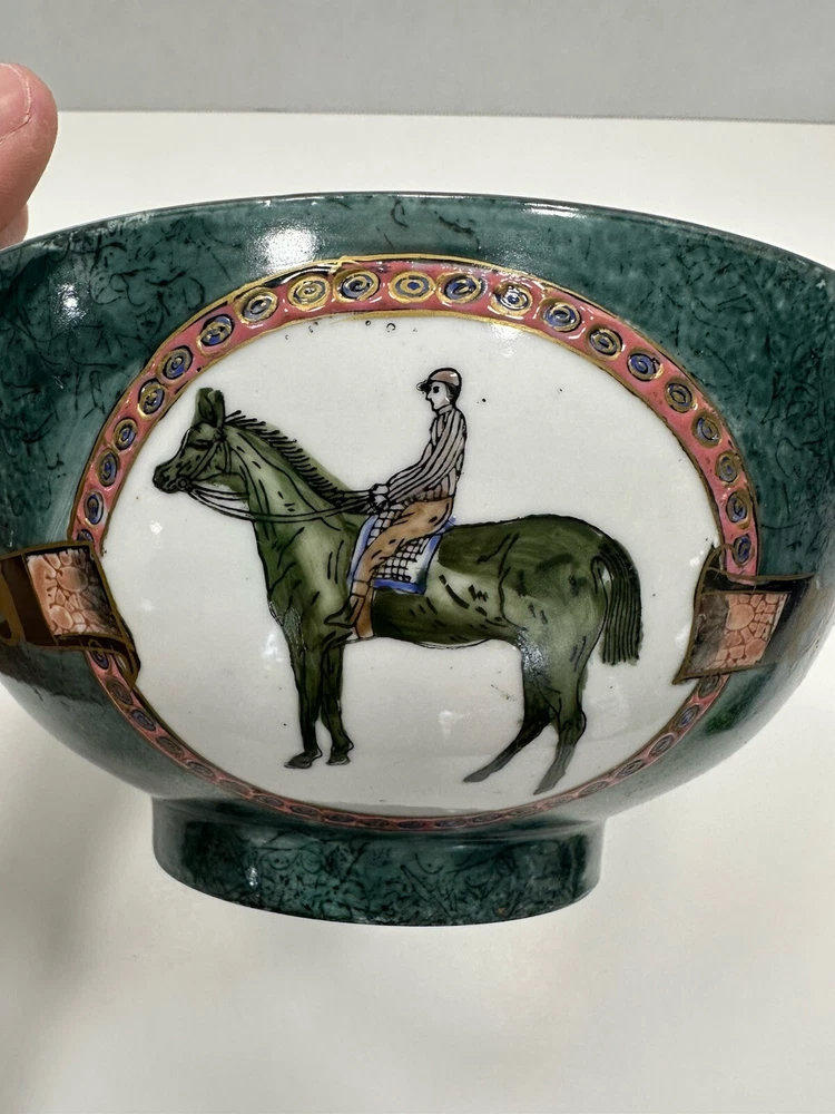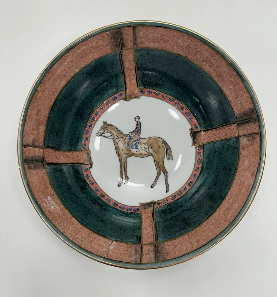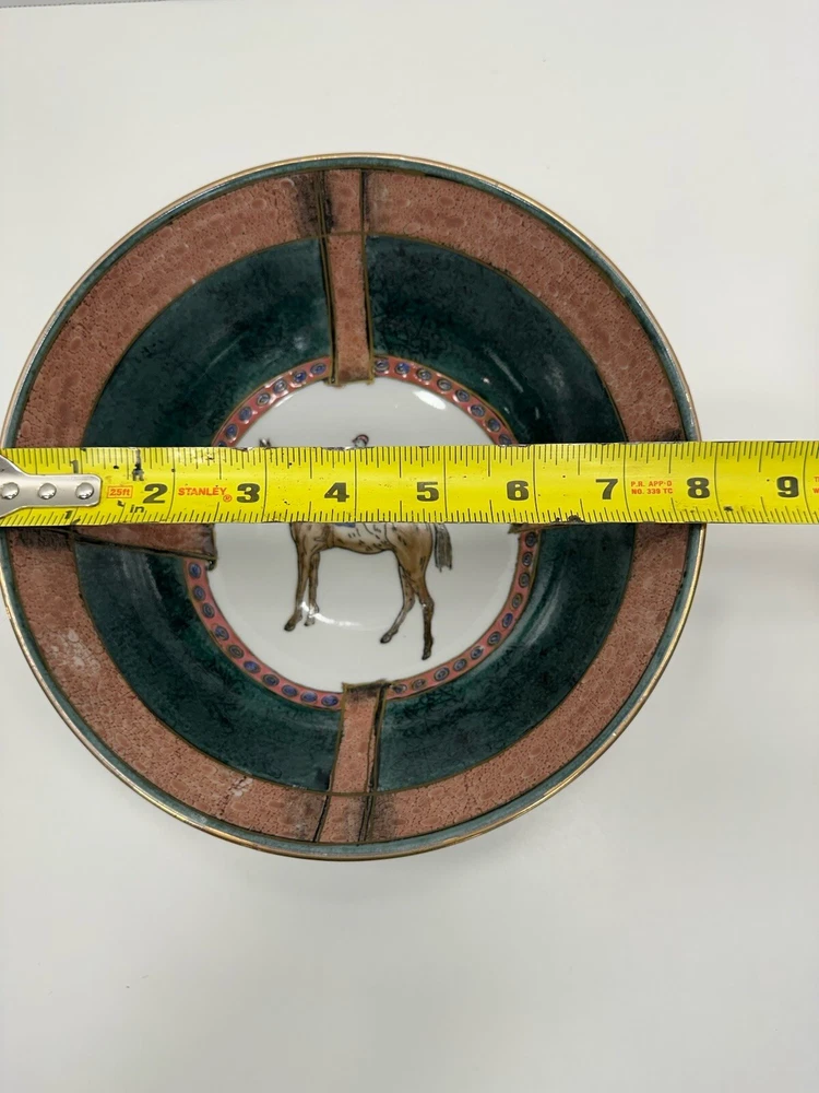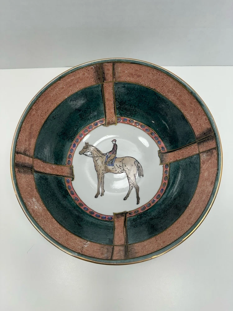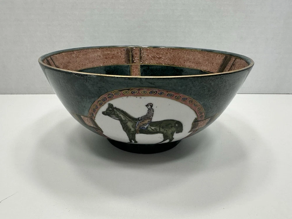 No chips or cracks. This is a vintage ceramic bowl featuring hand-painted polo players and horses. Era: It likely dates back to the 1950s. Origin: Made in China, potentially by the company WBI. Style: Equestrian theme, showcasing polo players on horseback. Material: Ceramic, possibly porcelain VTG Ceramic 1950s Decorative Bowl With Equestrian Theme Polo Player Horse 8”
