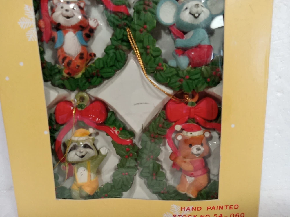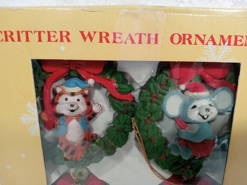 The "VTG Critter Wreath Christmas Ornaments" set includes four vintage animal ornaments made of resin. These hand-painted ornaments feature animals and are part of a collection of ornaments. They come in a box for easy storage and display during the holiday season. Each ornament is designed as an antique-style ornament with a theme of animals, making them a charming addition to any Christmas decor.