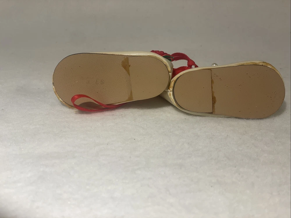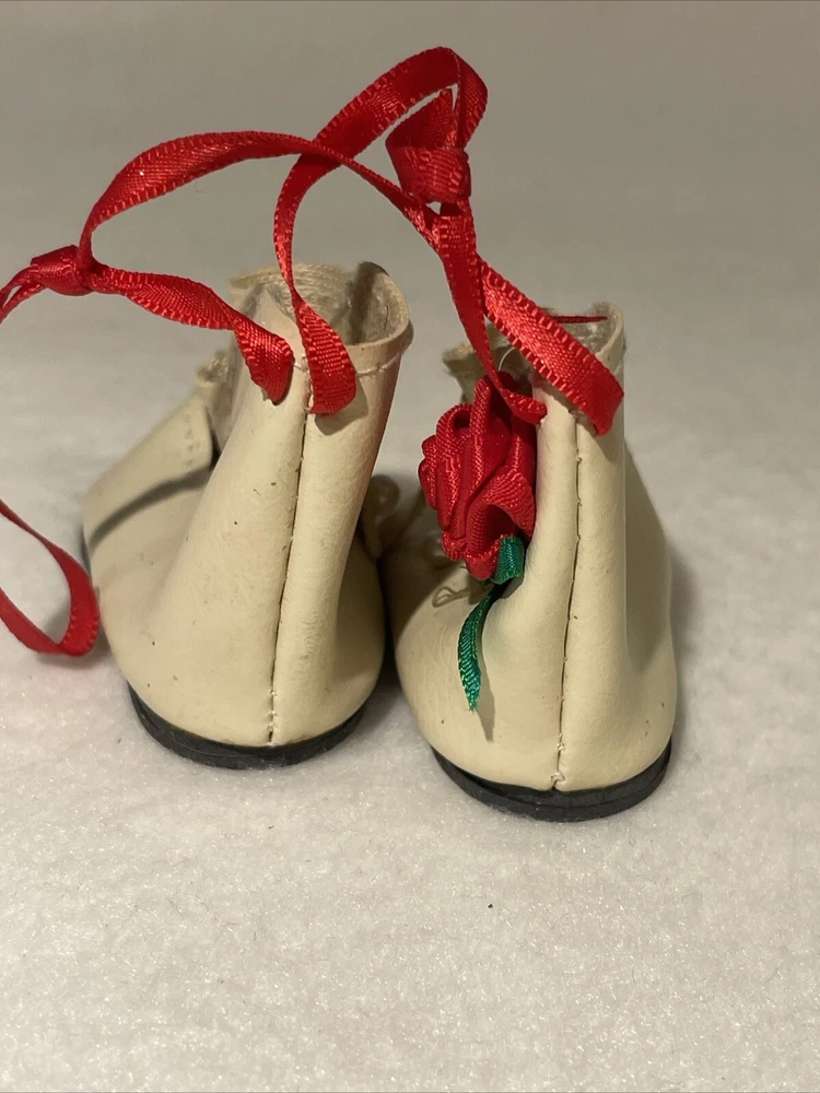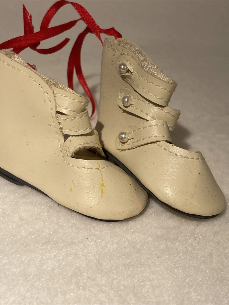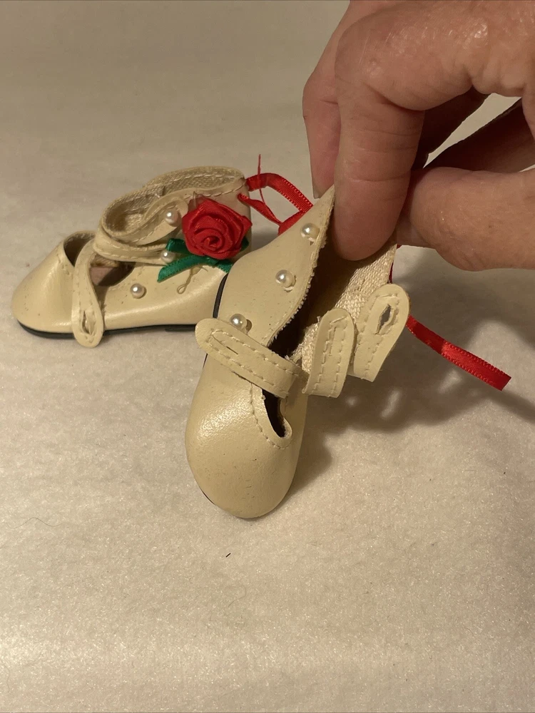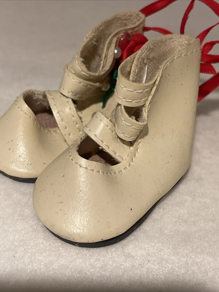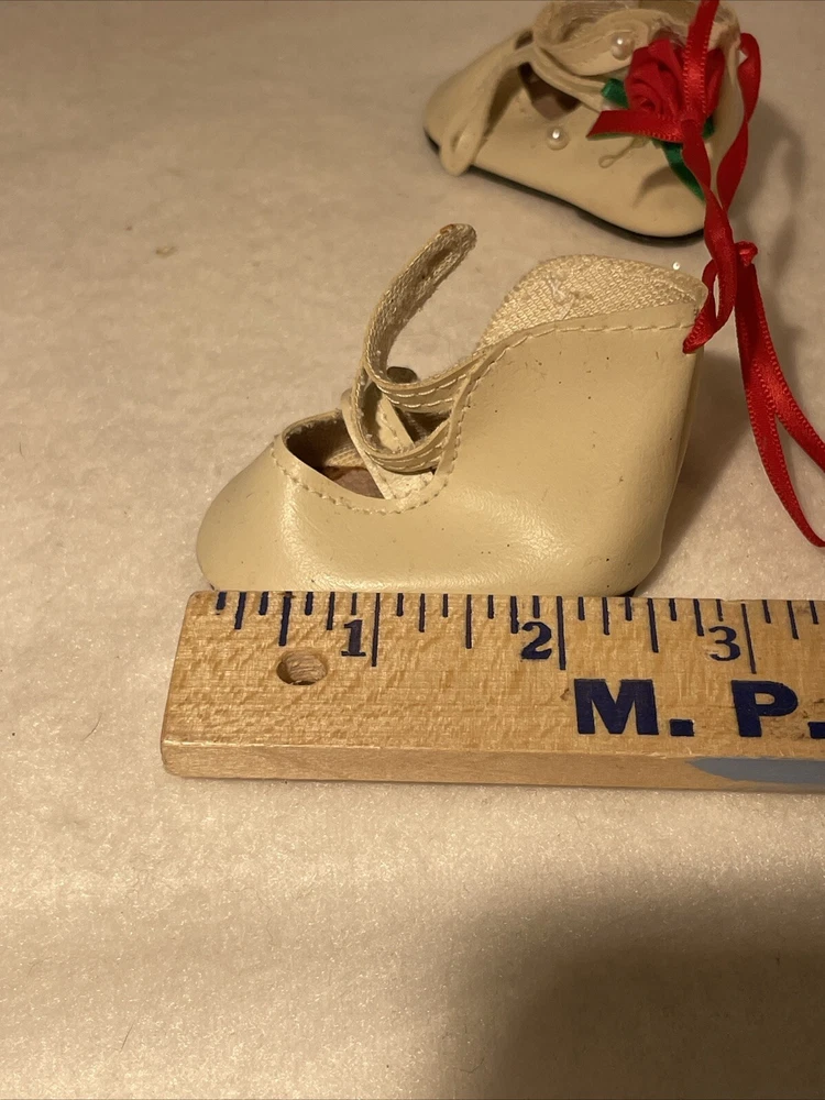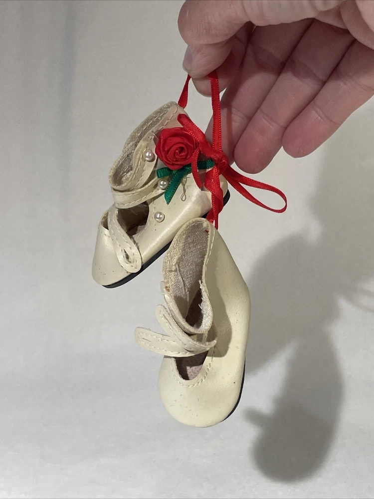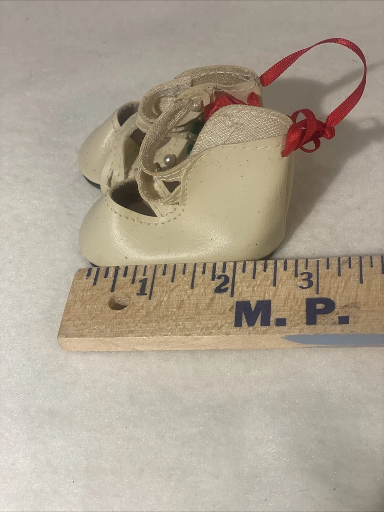 Add a touch of vintage charm to your Christmas ornament collection with these handmade doll shoes ornament. The ivory off white color and pearl like buttons with strap make them a perfect addition to any doll collection. These shoes are small in size, but the length and width can be seen in the pictures provided. The shoes are made with a stitch and glue production technique and are antique with a vintage style. They are suitable for any recipient over 18 years of age and are a unique addition to any collection. These shoes are a perfect gift for anyone who loves collecting vintage ornaments.