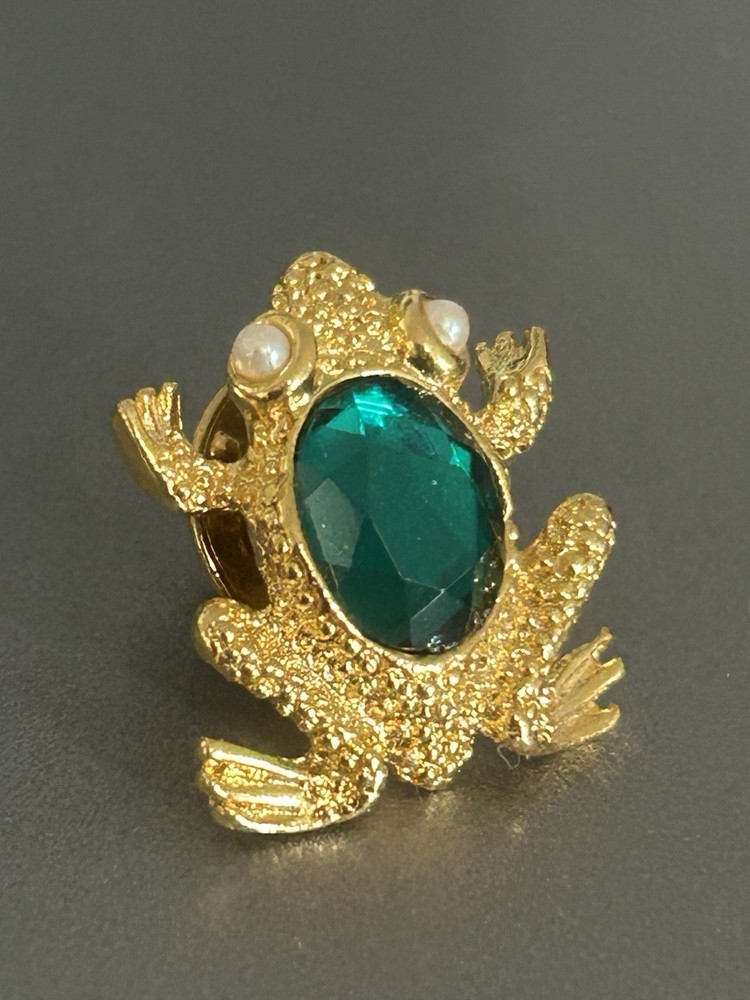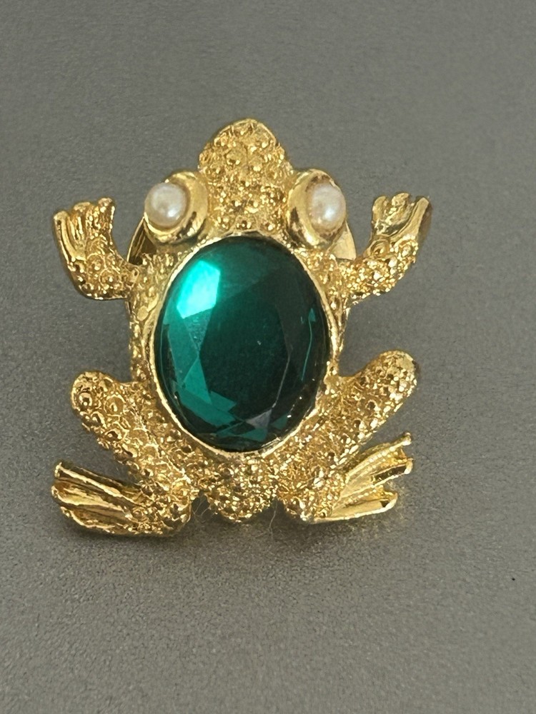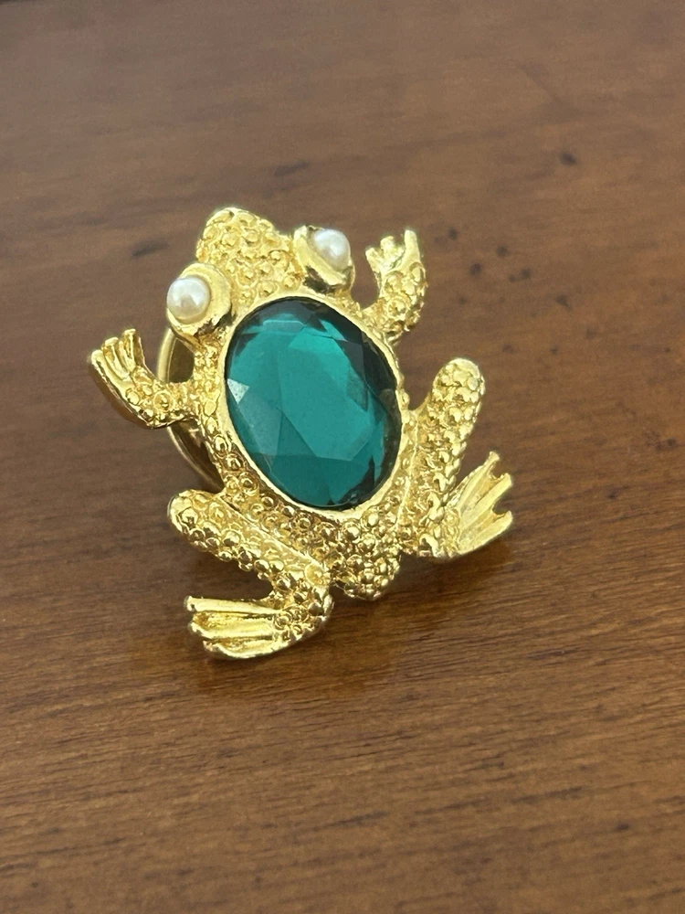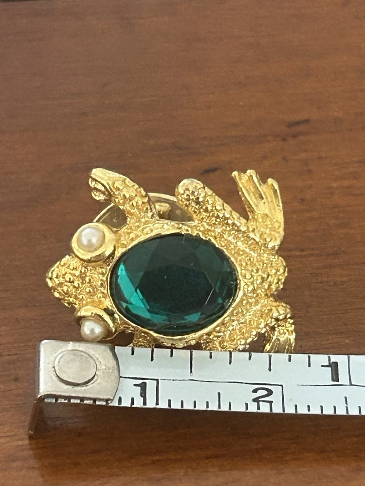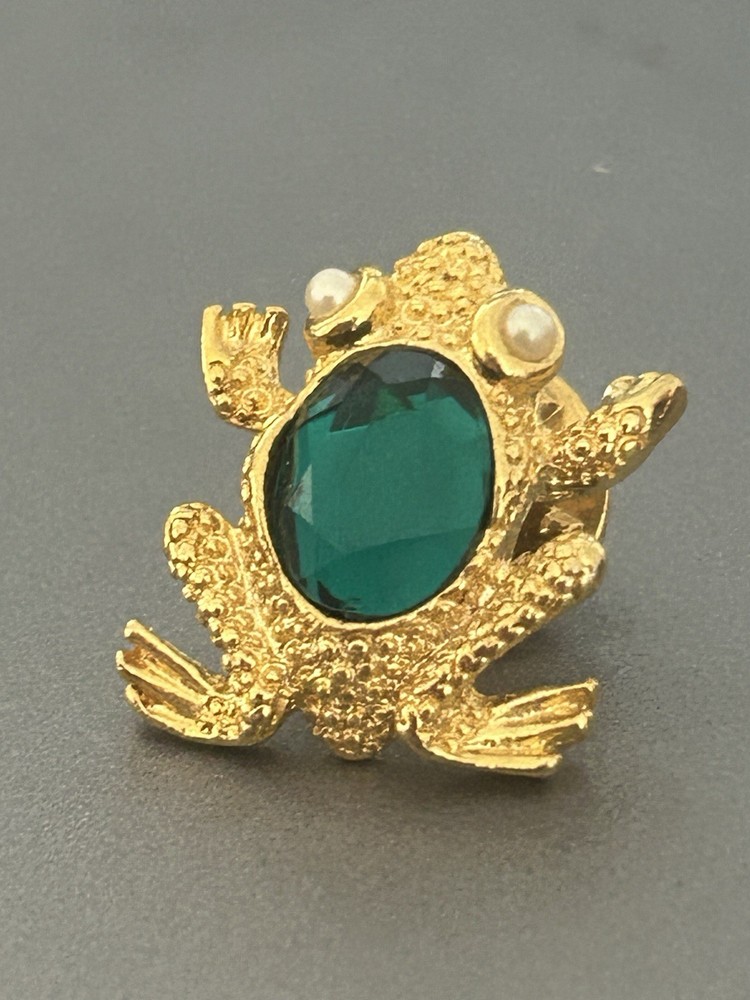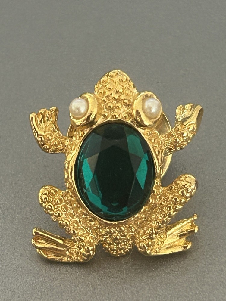 Vintage Frog with Green Oval Stone Faux Pearl Eyes Pin Brooch Goldtone Stamped SCO Good vintage condition- refer to pics
