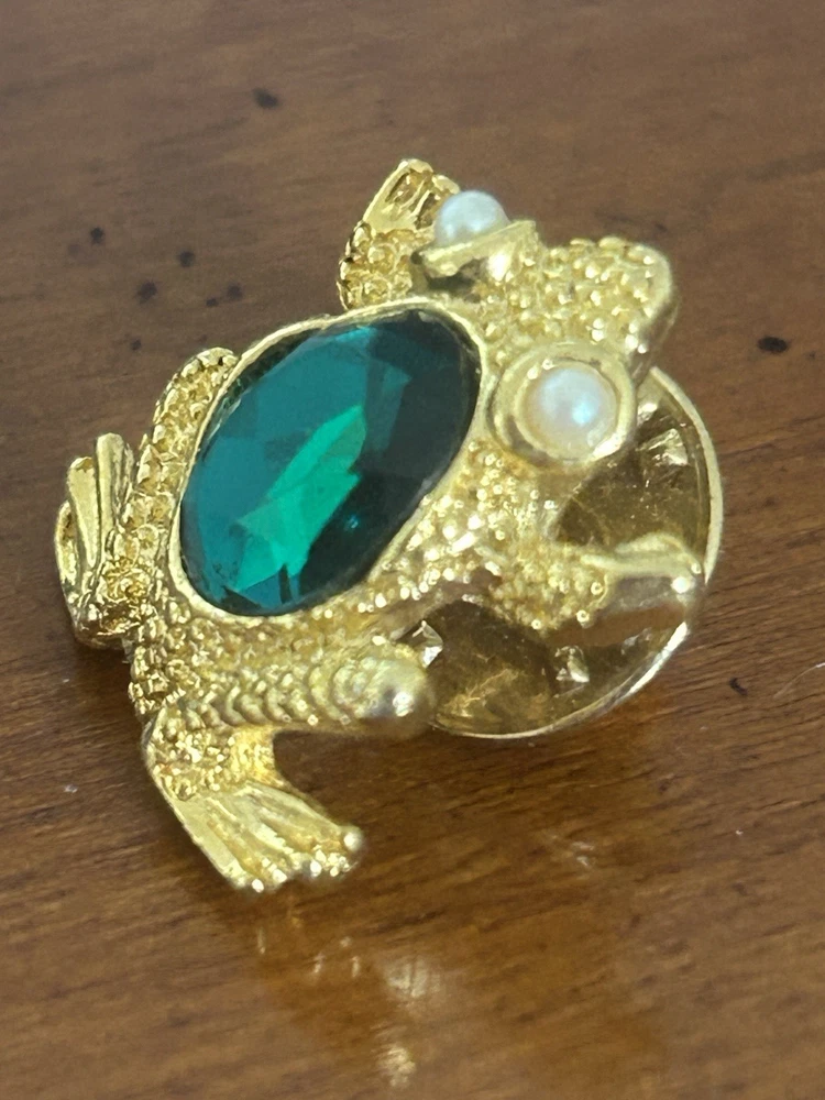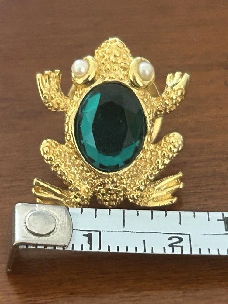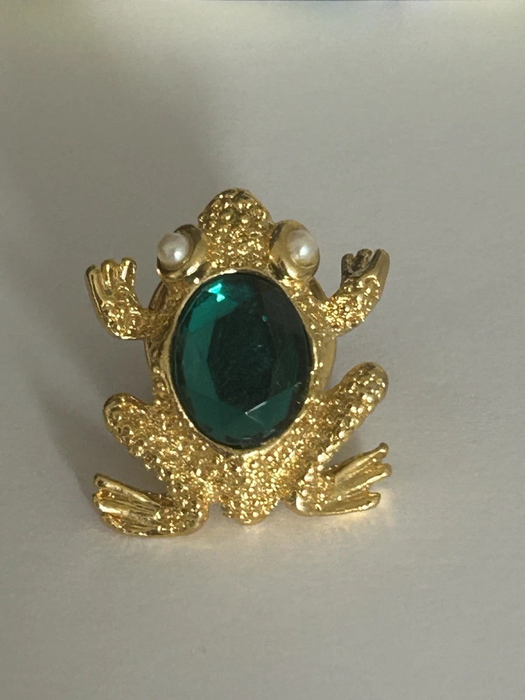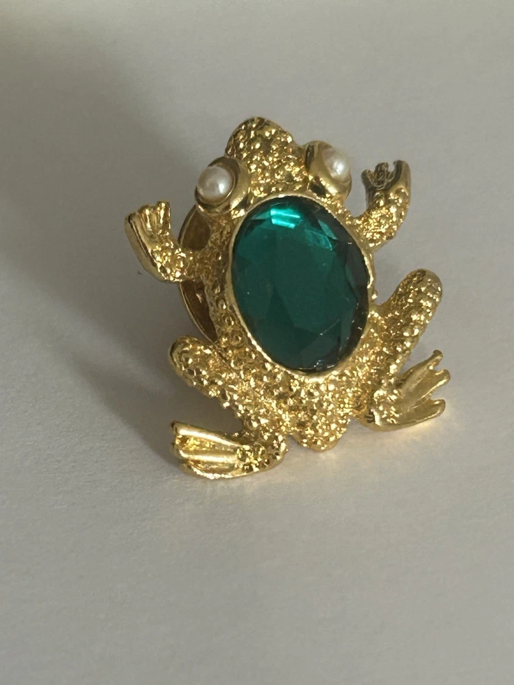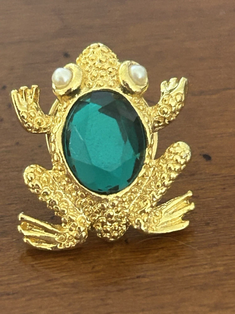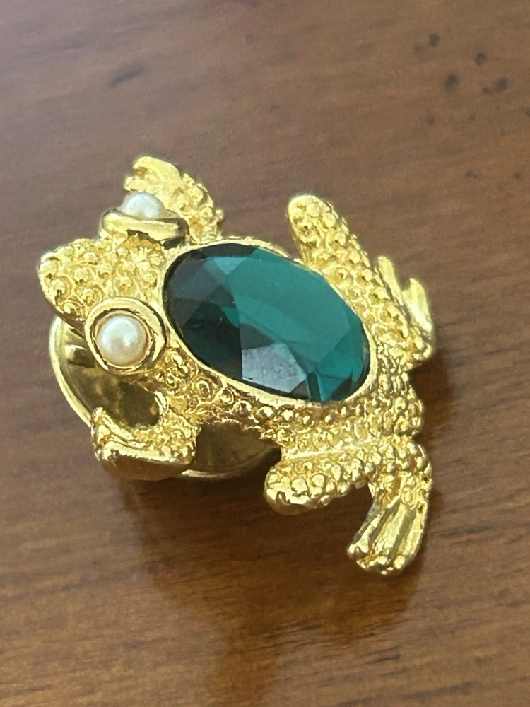 Vintage Frog with Green Oval Stone Faux Pearl Eyes Pin Brooch Goldtone Stamped SCO Good vintage condition- refer to pics