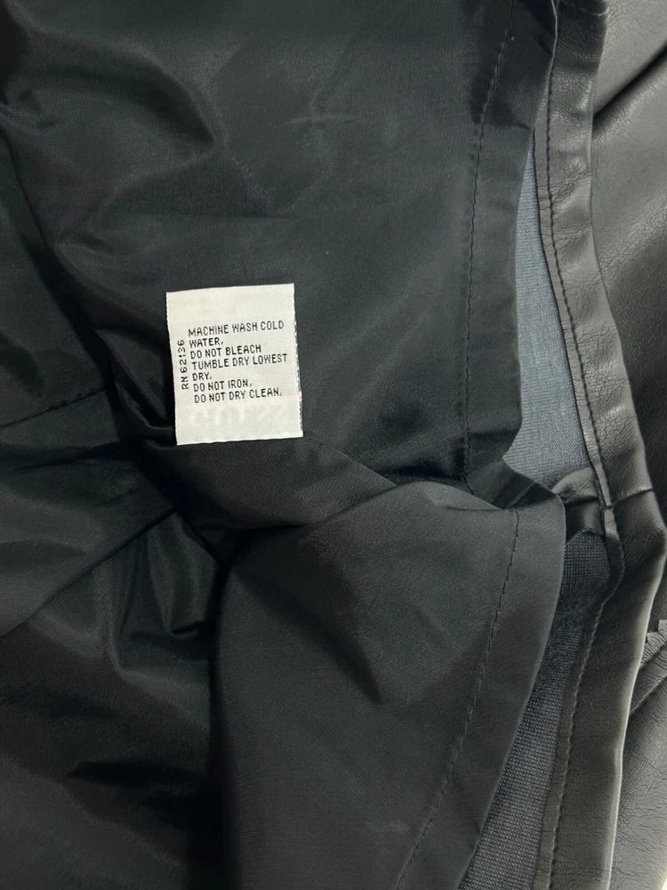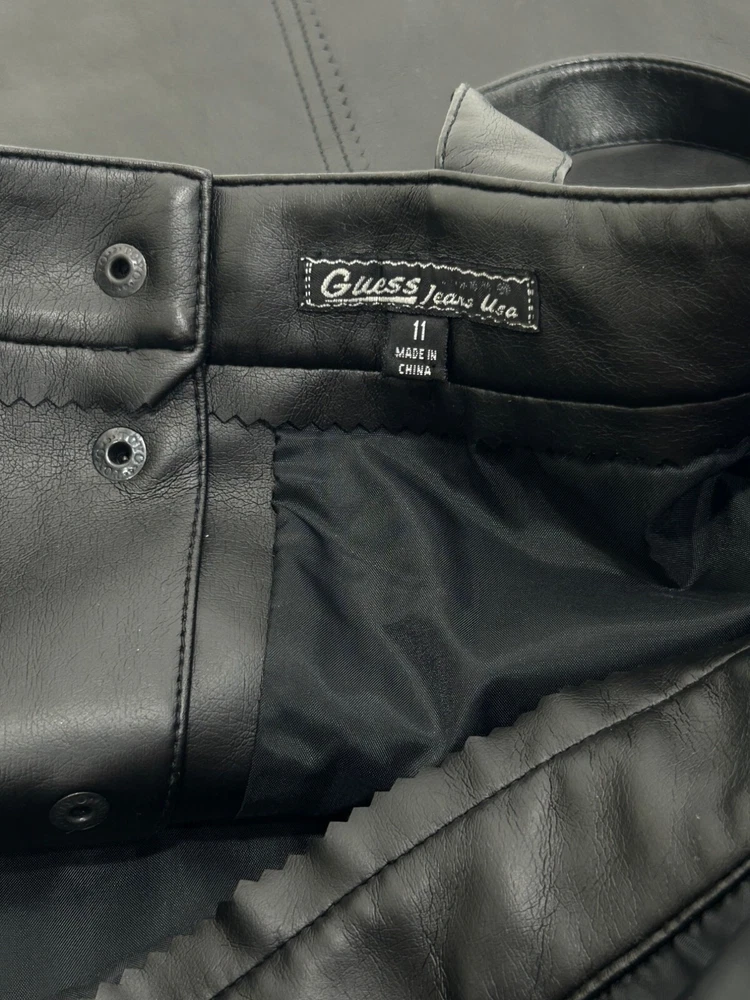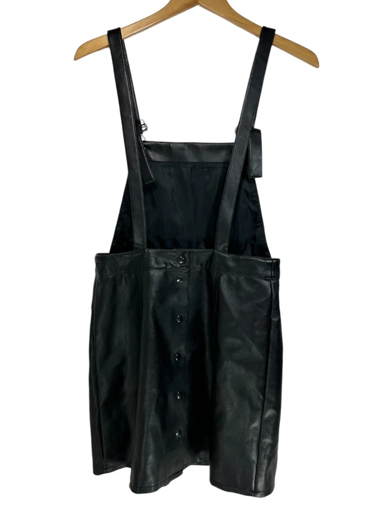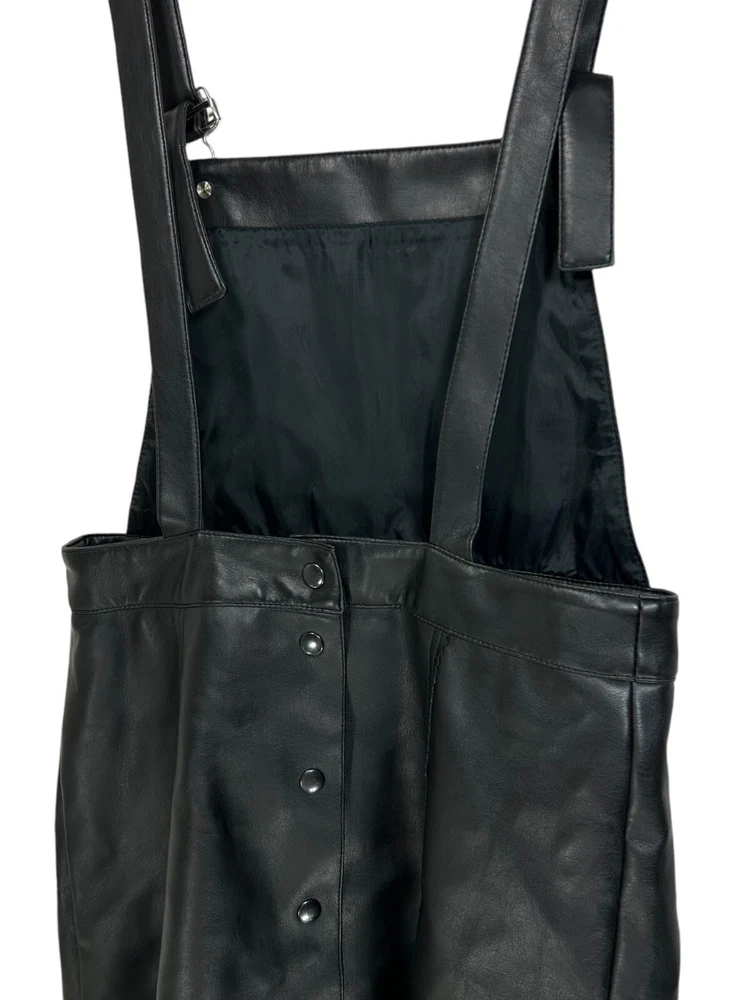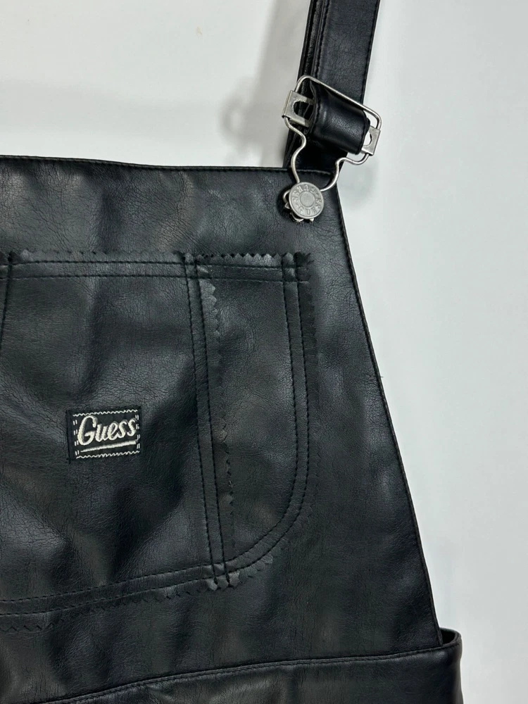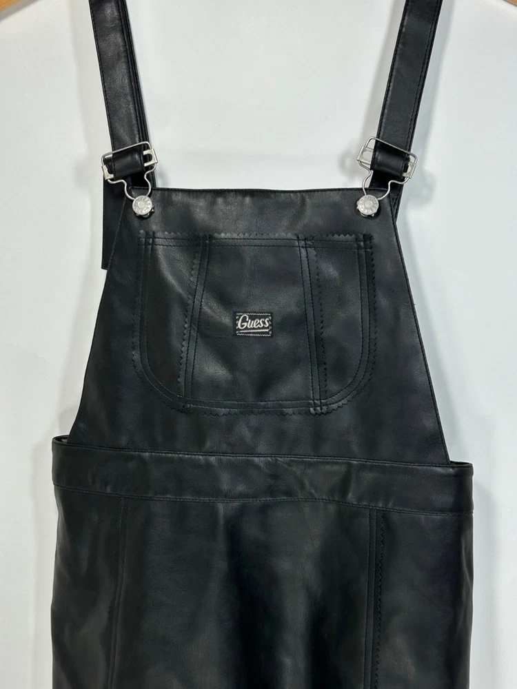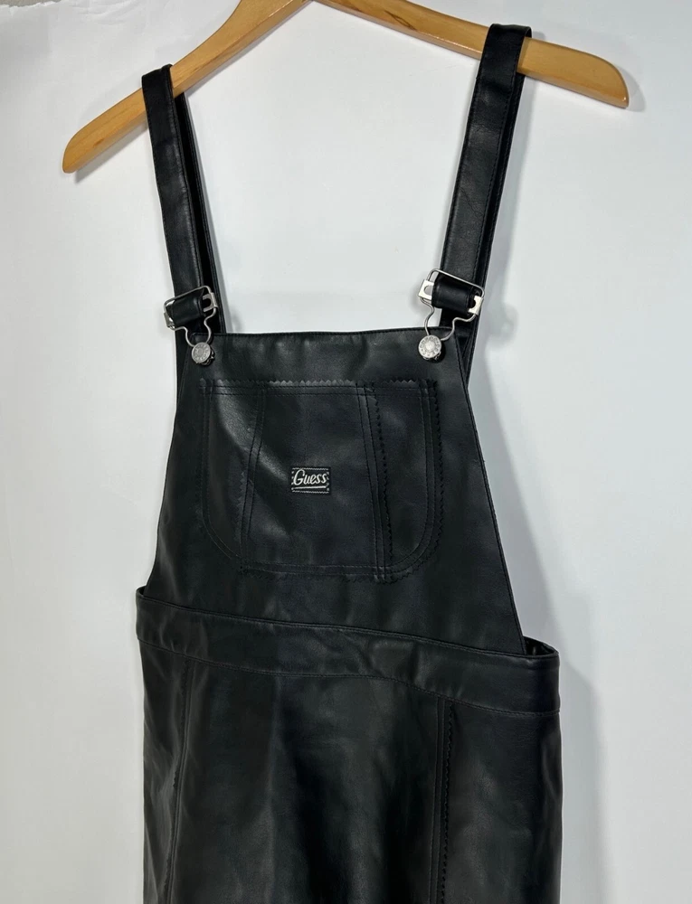 In mint used condition with no flaws to note! Vintage Guess Overalls Mini Dress in Black Vegan Leather Overalls style with a mini dress length Button snap closure in back Baggy/loose fitting through torso 1 pocket in front with Guess logo Ideal to layer overtop an outfit Straps are adjustable Made with vegan leather/polyurethane/nylon Length top to bottom: 34" - adjustable Pit to pit/chest-line: 15" #vintageguess #guessdress #overallsdress #veganleatherdress #guessminidress #veganleather #overalls #overallsminidress