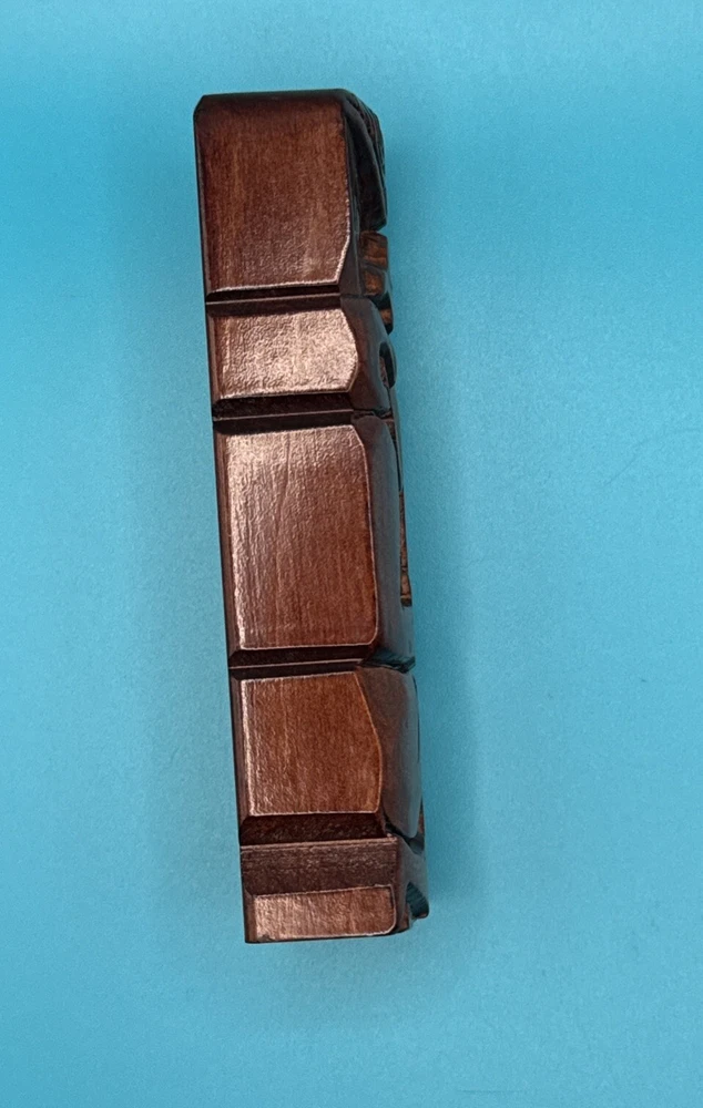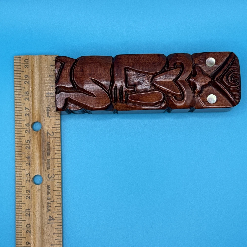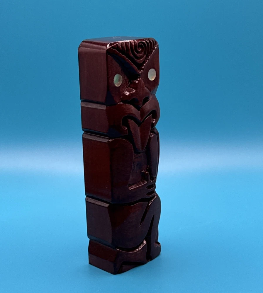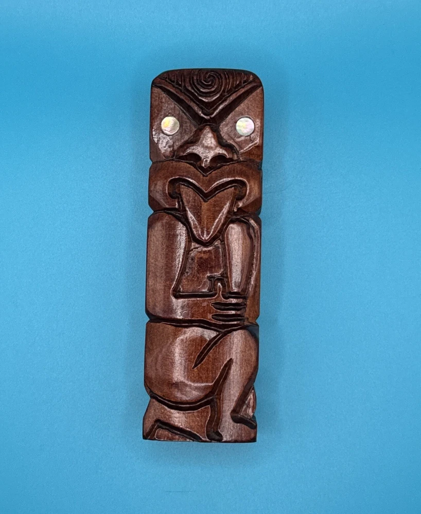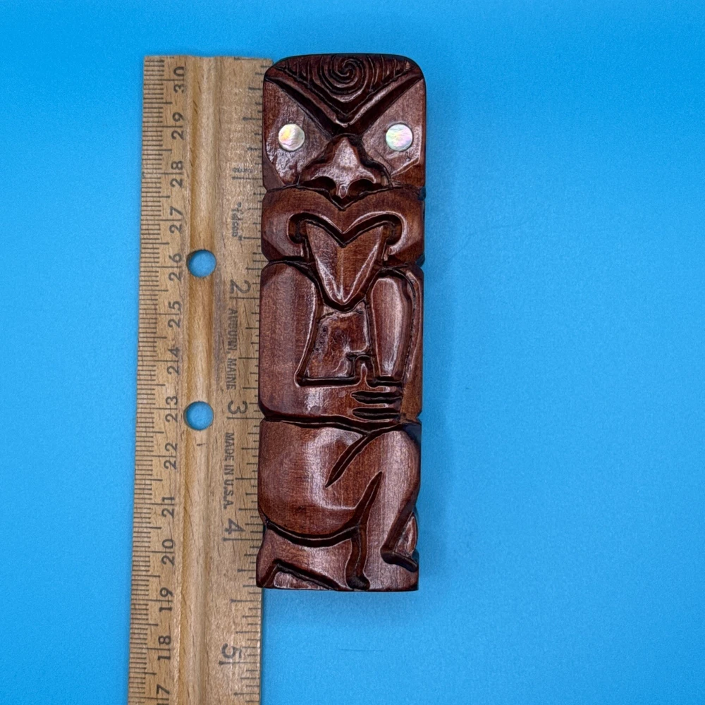 This hand-carved wooden figurine is a unique addition to any collection. The Tiki Island person figure features a totem pole design with intricate carvings and a wooden finish. Measuring 4.25 inches in height and 1.5 inches in width, this small figurine is perfect for any room and occasion. The figure depicts a person kneeling, thumbs up, sticking tongue out with brown wood tone. The carvings on the figurine are detailed and include a tongue and opal shell eyes. This original piece from the late 20th century is a must-have for collectors of Tiki and island-themed items. Carved in Rotorua, New Zealand