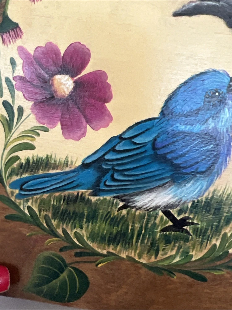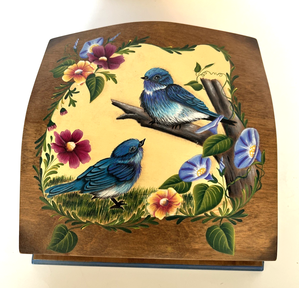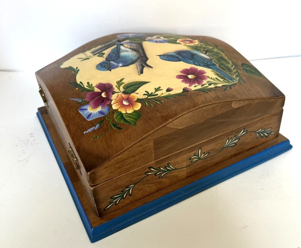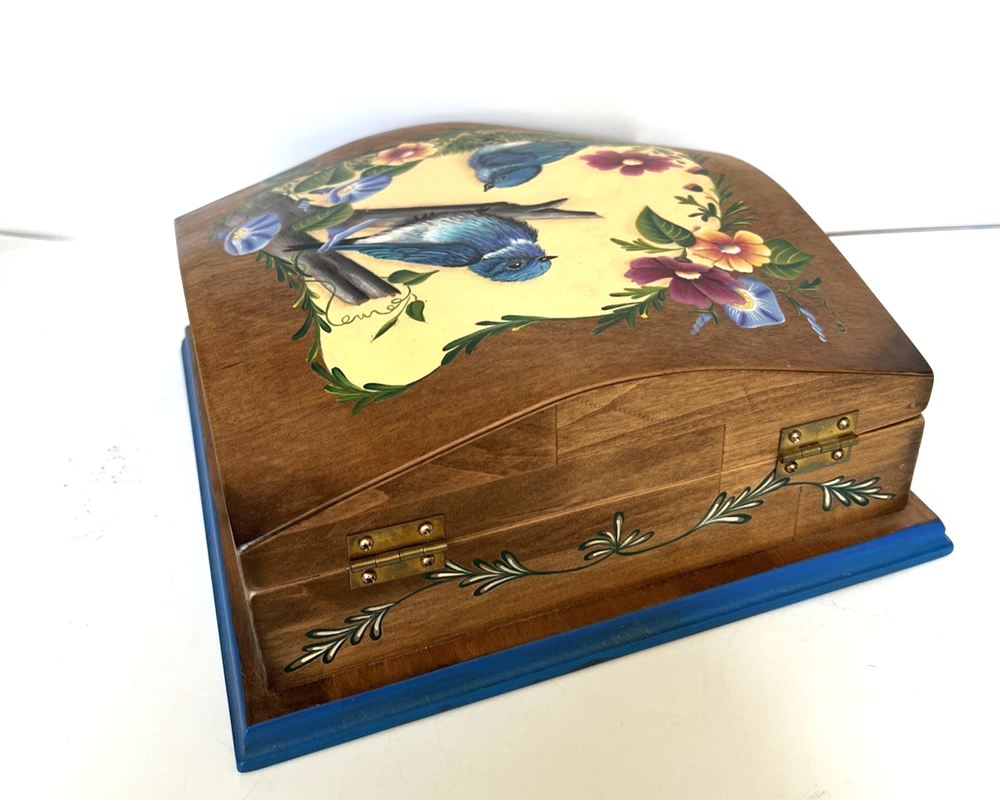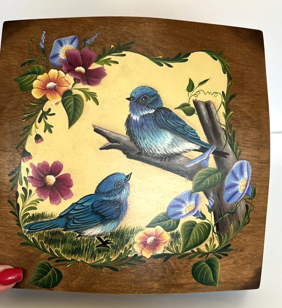 VTG Hand Made Wooden Box Signed & Painted Colorful Bird Floral Hinged Box 9X9 " I will pack with care and get it to you ASAP Thanks for looking !
