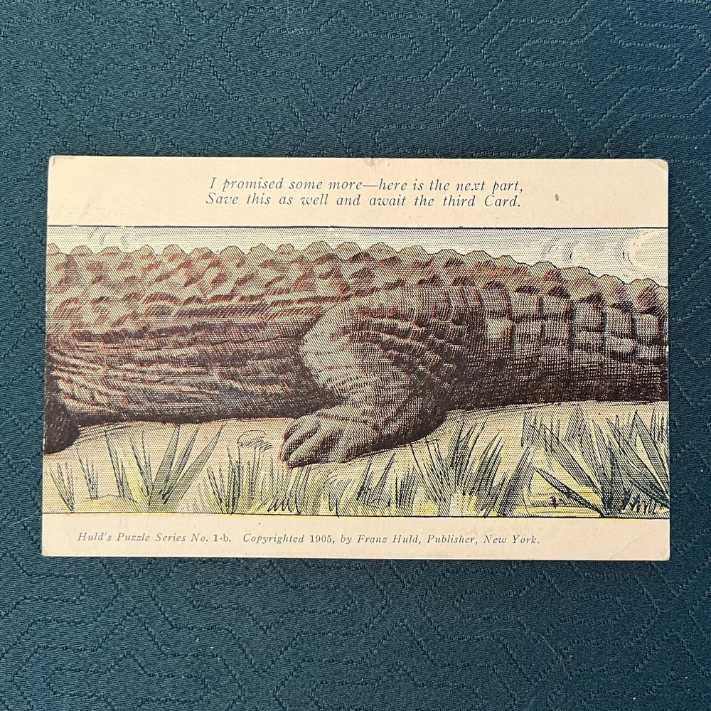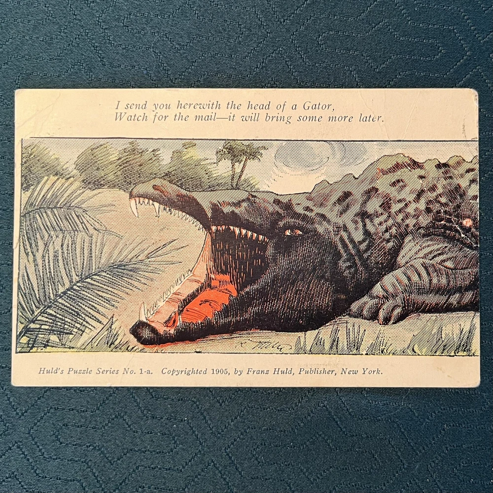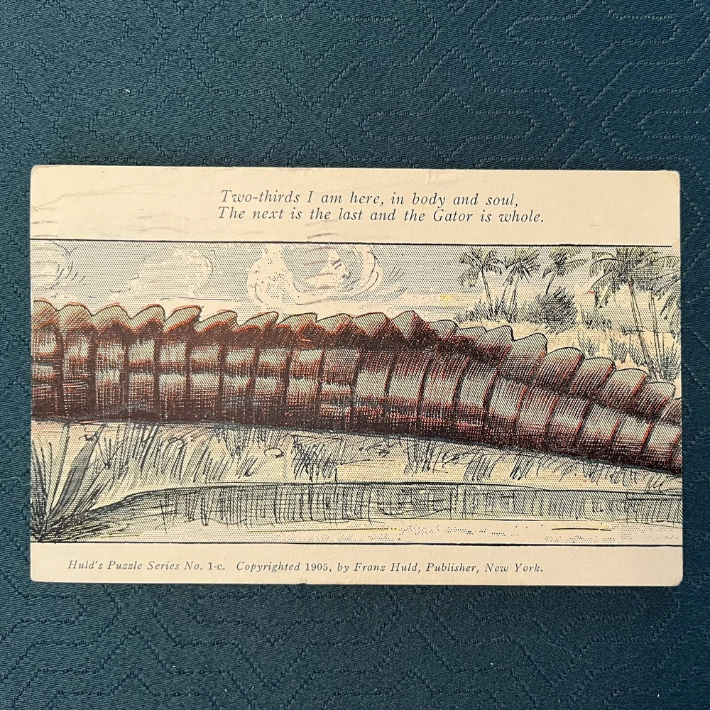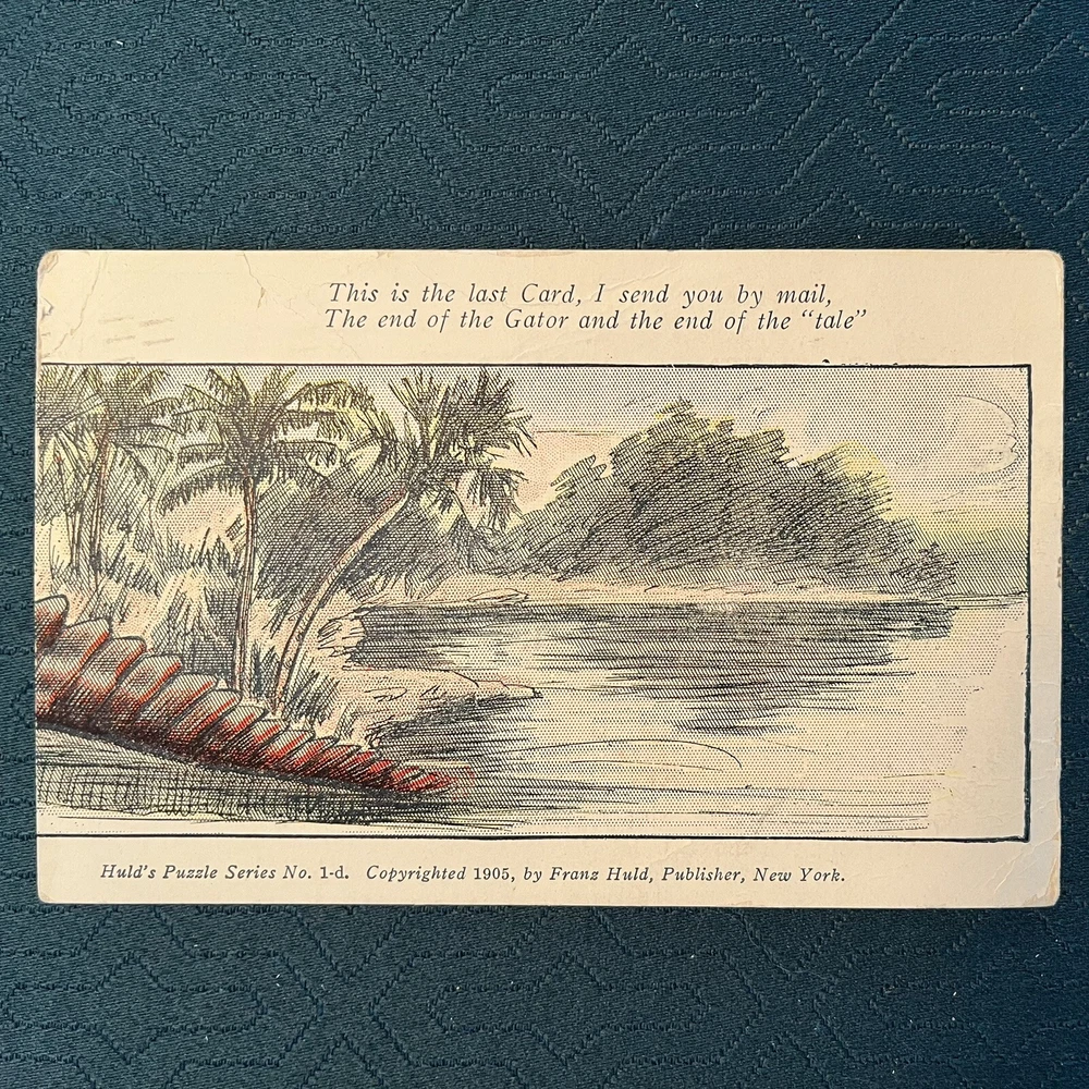 Complete set of four Huld's Puzzle Series No. 1 postcards, copyrighted 1905 by Franz Huld, Publisher, New York. This series features an alligator in four installments along with a poem on the front. They were mailed to Mr Donald Carter in OOctober and November 1912 to Blair Academy in Blairstown, New Jersey. Please see all photos for condition. The reverse side to each is immediately after the corresponding front in the photo slideshow. Each card has some creasing and corner wear. Some light bleedthrough postal marks to the front. Ships your choice of USPS Ground Advantage or Priority Mail.