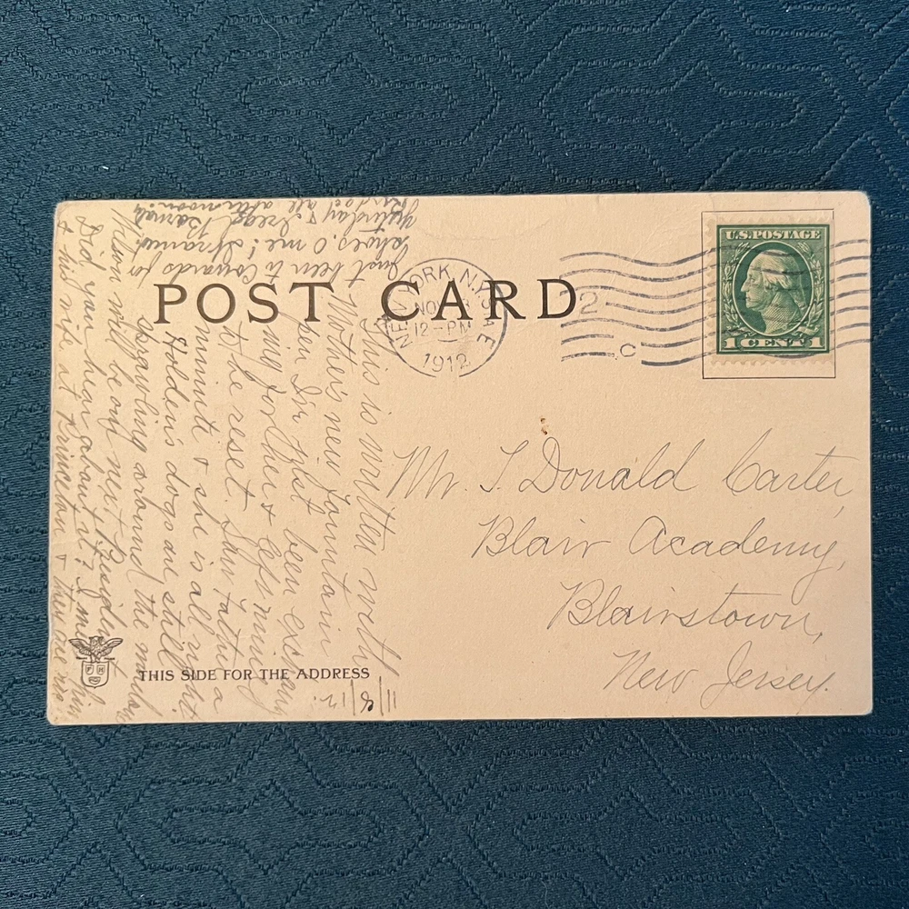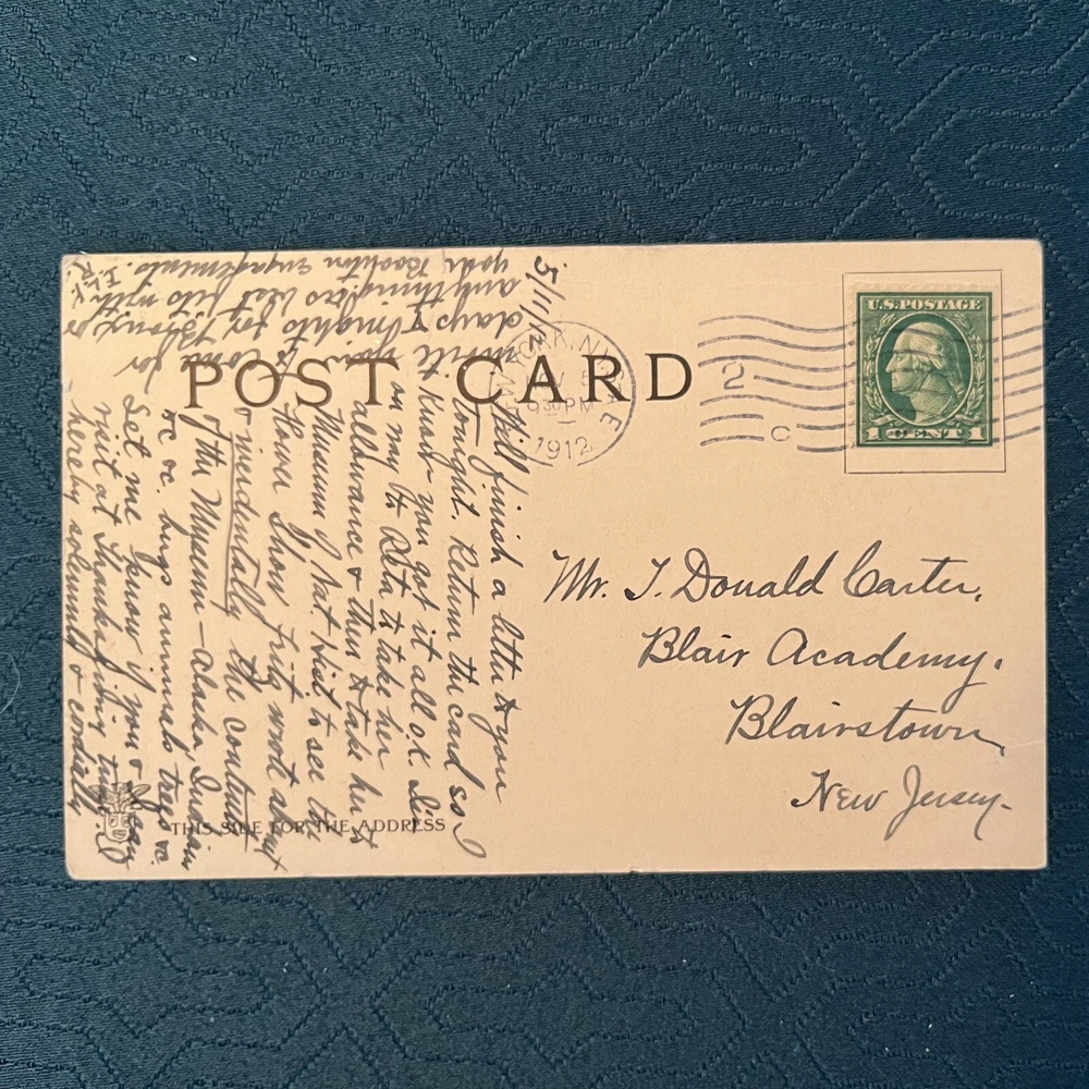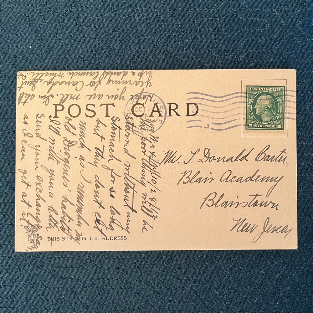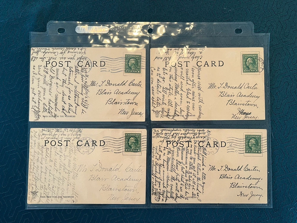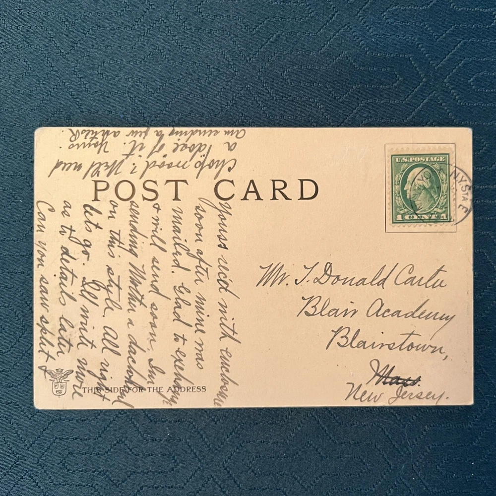 Complete set of four Huld's Puzzle Series No. 1 postcards, copyrighted 1905 by Franz Huld, Publisher, New York. This series features an alligator in four installments along with a poem on the front. They were mailed to Mr Donald Carter in OOctober and November 1912 to Blair Academy in Blairstown, New Jersey. Please see all photos for condition. The reverse side to each is immediately after the corresponding front in the photo slideshow. Each card has some creasing and corner wear. Some light bleedthrough postal marks to the front. Ships your choice of USPS Ground Advantage or Priority Mail.