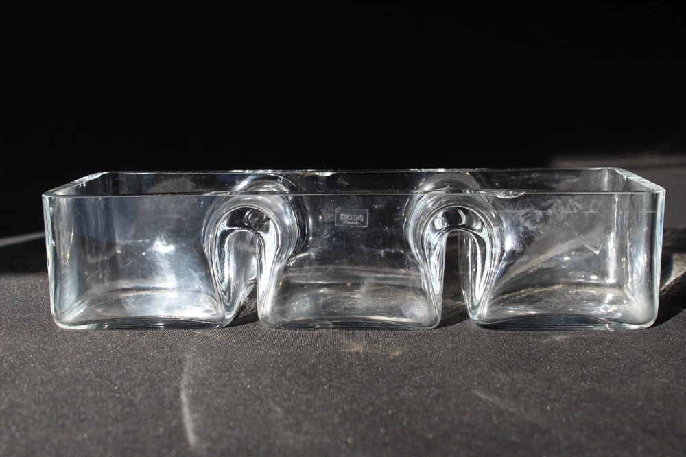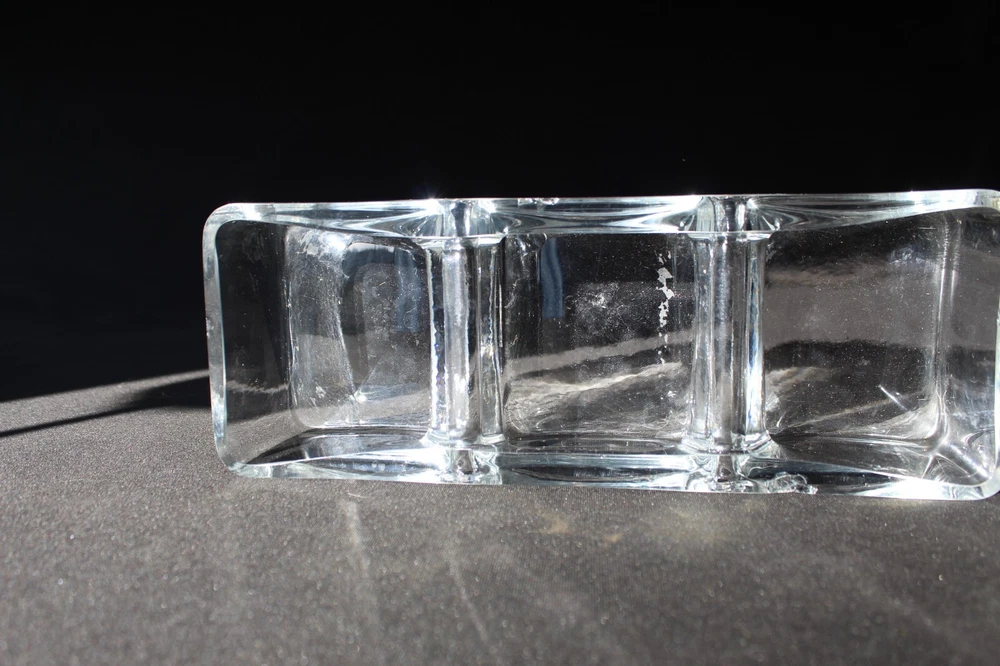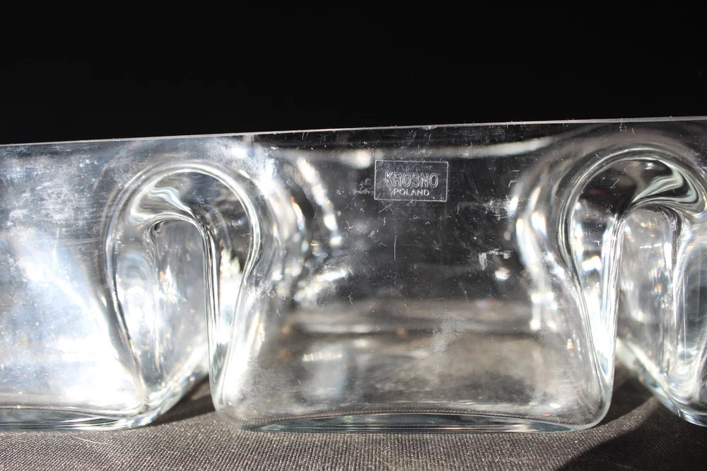 This vintage Krosno candy dish from Poland is a beautiful example of mid-century modern art glass. Made of clear glass, it features a rectangular shape with three compartments, perfect for serving candies, nuts, or relishes. The dish measures approximately 12 inches in length, 4.5 inches in depth, and 2.5 inches in height, with a glossy finish and a weight of 4.2 lbs. The Krosno brand is known for its high-quality glassware, making this elegant and functional dish a stylish addition to any home decor.