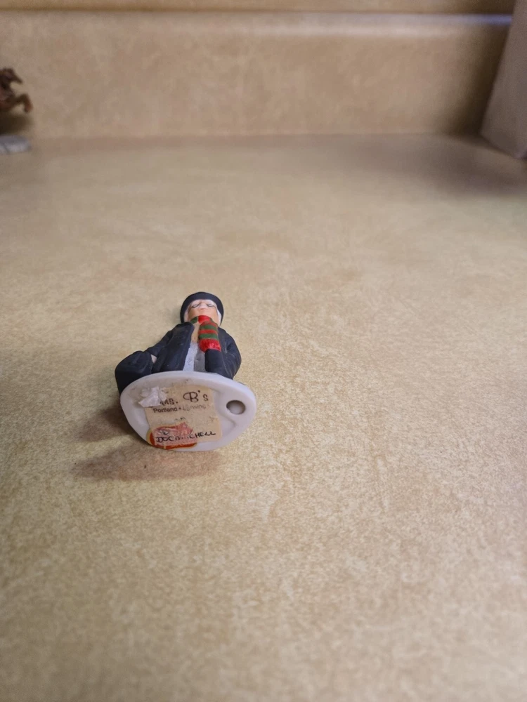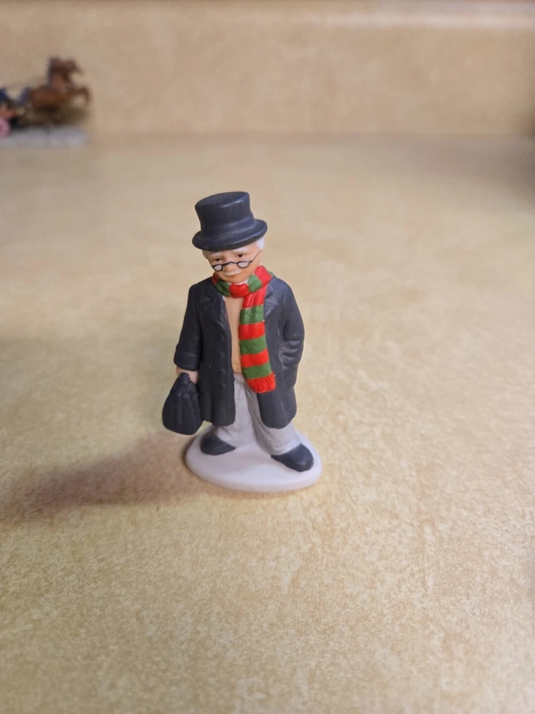 This is a vintage Lefton collectible figurine from the Snow Village collection, manufactured in 1990. It features Doc Mitchell, a doctor, in a Colonial style. The figurine is multicolored, made of ceramic & porcelain, hand-painted, and suitable for Christmas village collections. It measures 1 1/2 x 1 x 2 3/4 inches. The brand is Lefton, and it is an original piece from the 1990s. Perfect condition