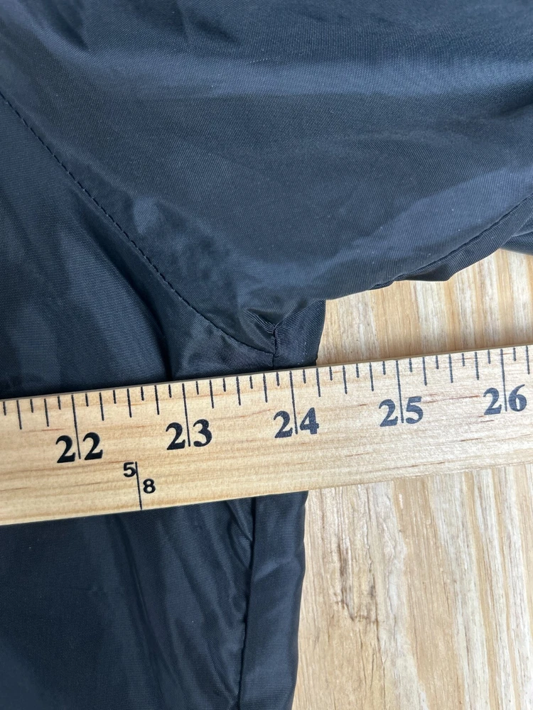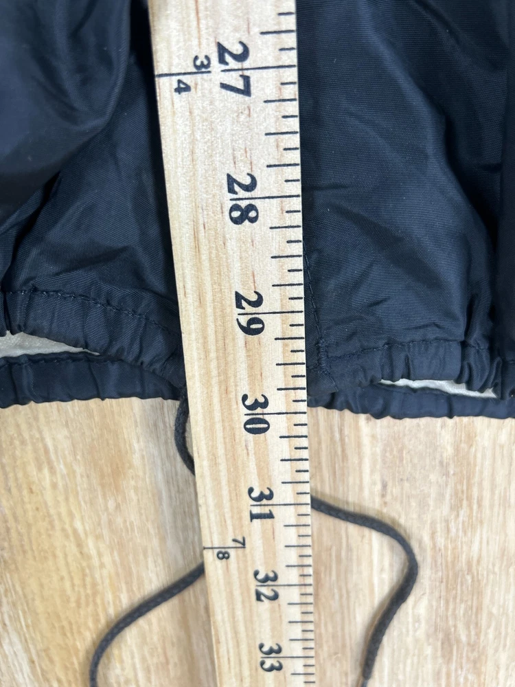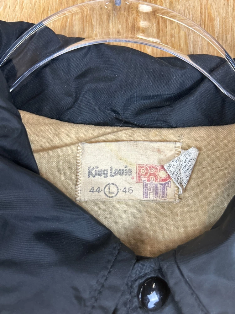 Stay warm and stylish with this vintage King Louie Pro Fit jacket. Made with nylon outer shell material and satin fabric type, this windbreaker features a spread collar, two front pockets, and snap closure. The black jacket is perfect for travel or casual occasions and is adorned with button accents and a patriotic army theme. The midweight jacket is machine washable and has a full zip feature. It is suitable for winter and fall seasons and is ideal for cycling, baseball, hiking, and running and jogging. The jacket has a regular fit and is available in size large. The lining material is nylon, and the insulation material is polyester. This King Louie Pro Fit jacket is a perfect addition to your wardrobe, and it is a must-have for any patriotic occasion. SKU: 150010