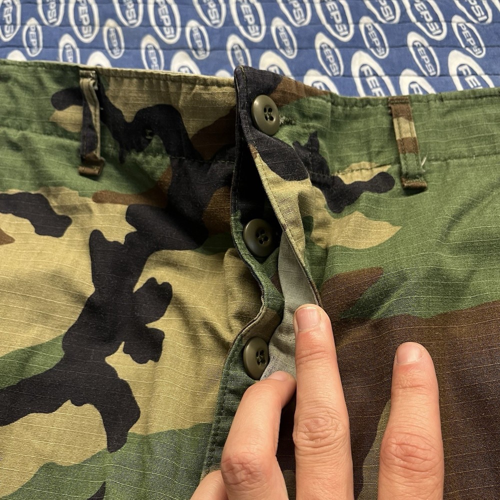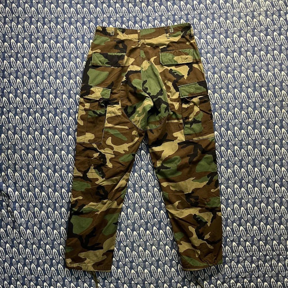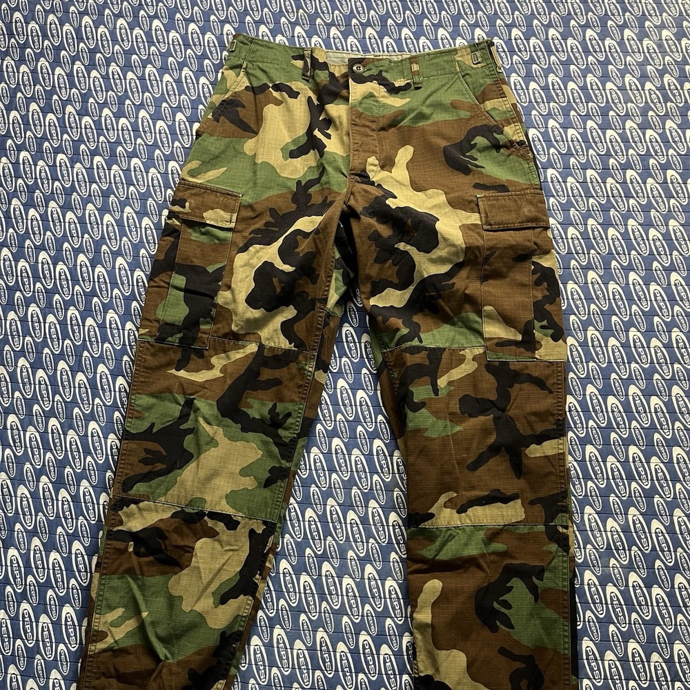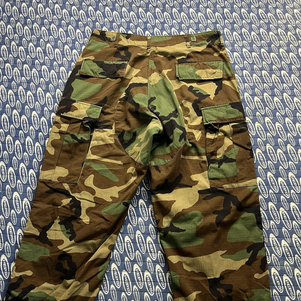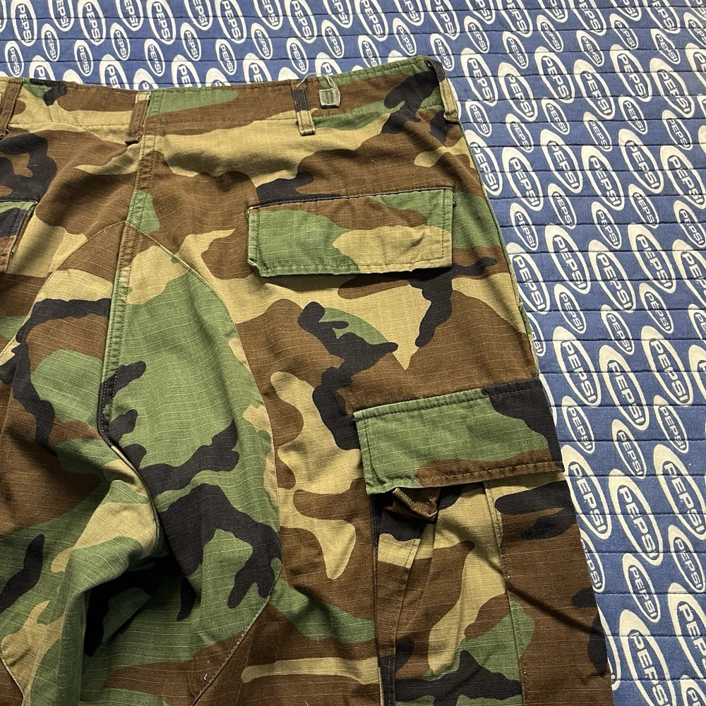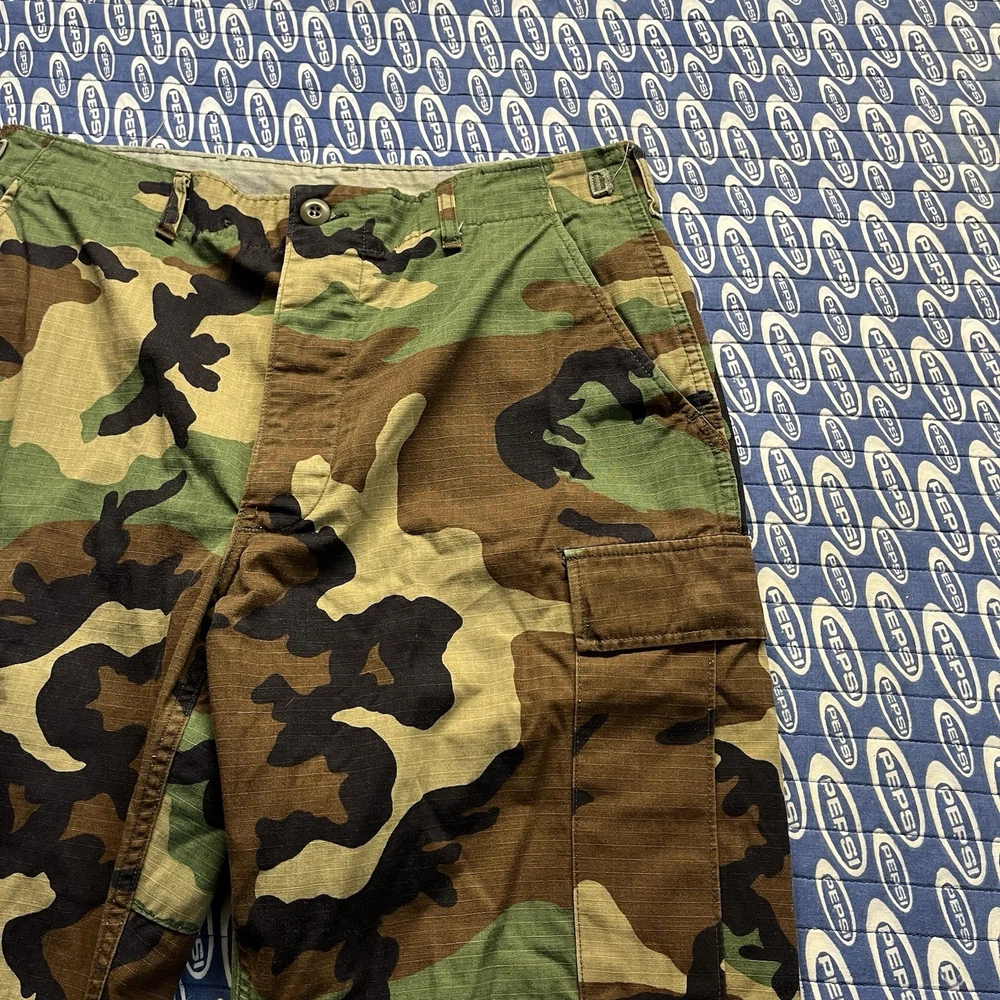 The product is a pair of men's medium regular size woodland camo pants, featuring a button fly and cargo style design. Made in the USA, these high-rise pants have a 31-inch inseam and 34-inch waist size, with a multicolor camo design that is perfect for outdoor activities or military-inspired fashion. With the brand being Camo, the pants are ideal for those looking for a rugged and versatile addition to their wardrobe.