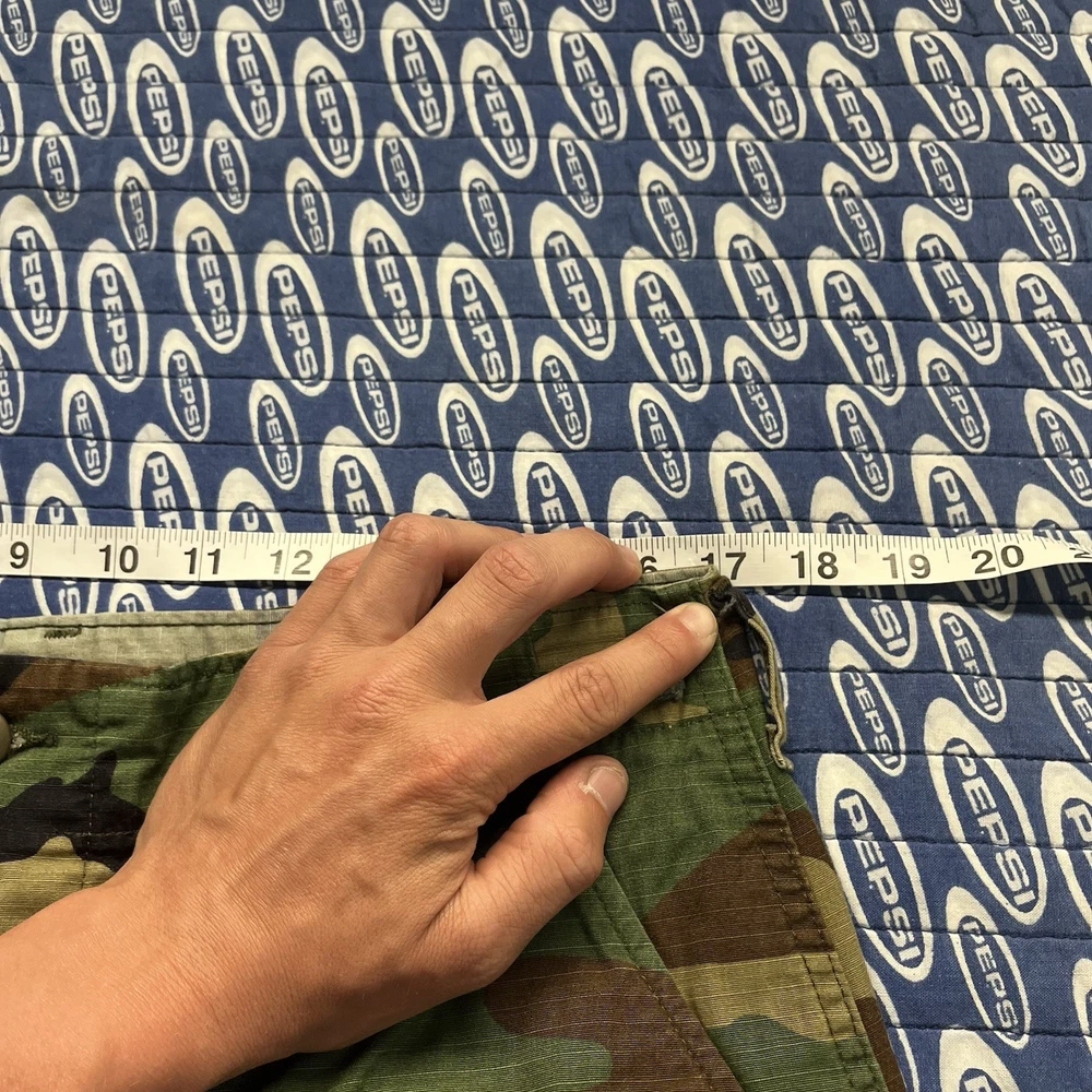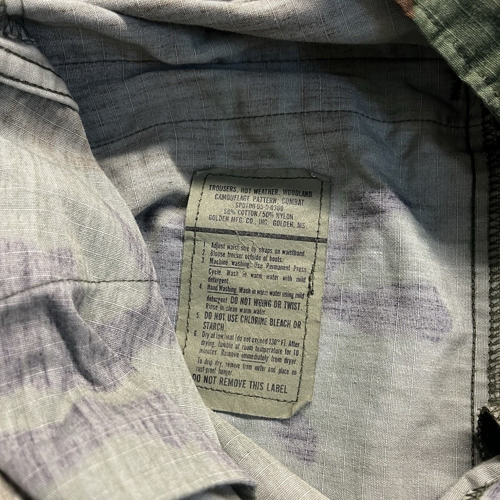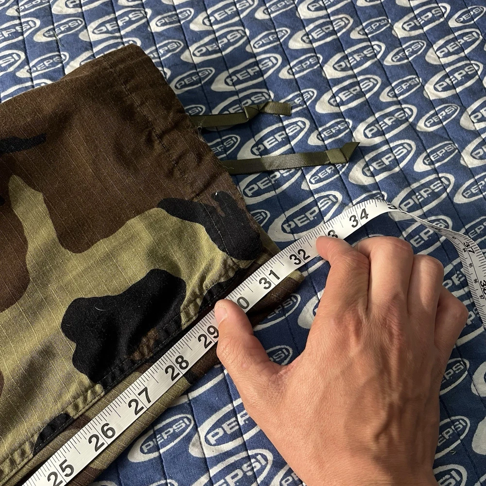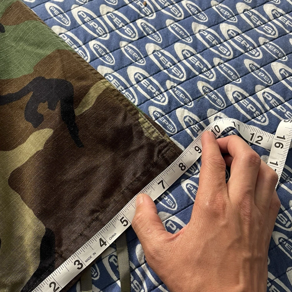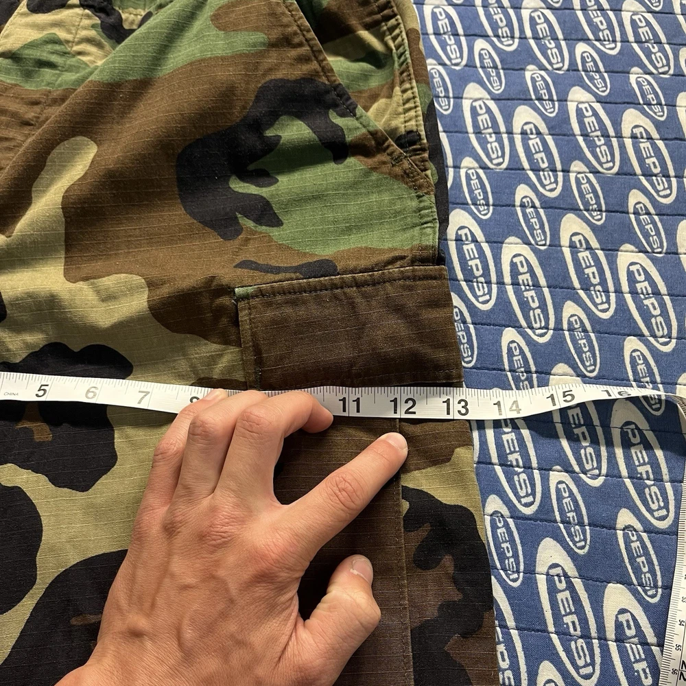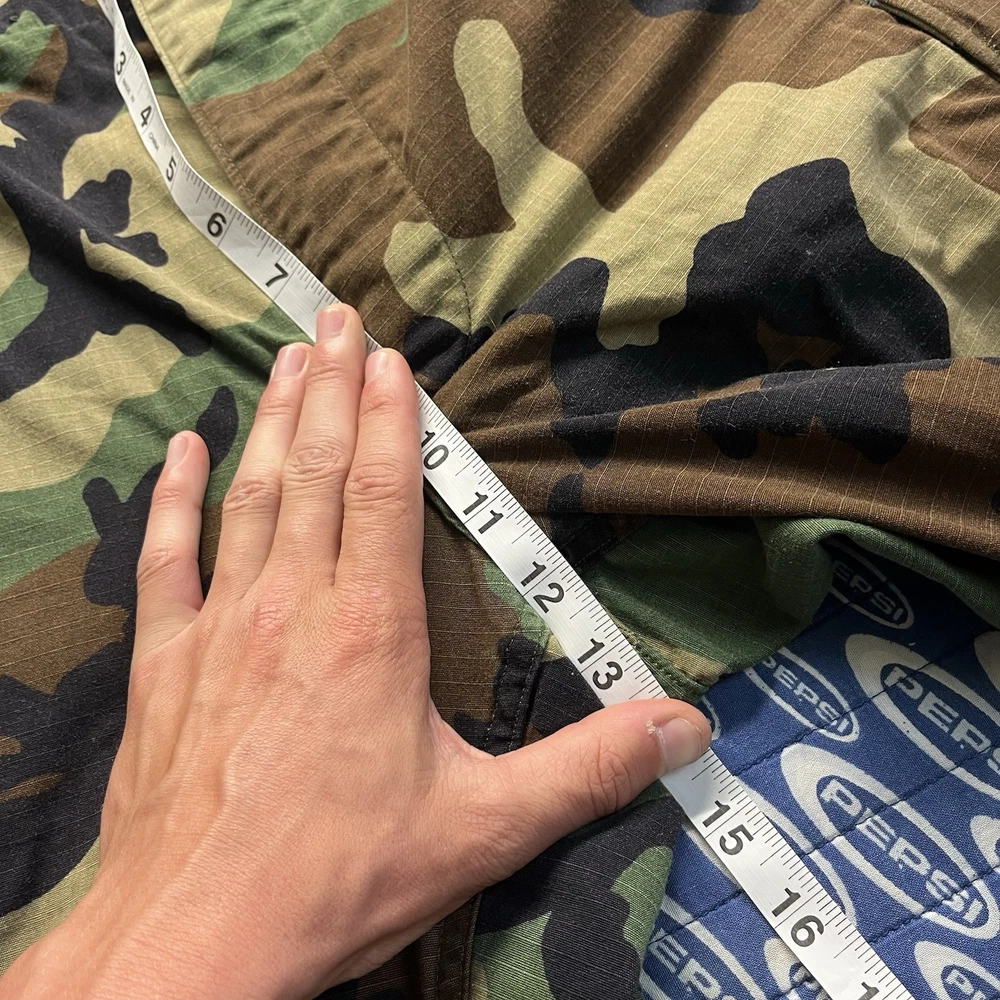 The product is a pair of men's medium regular size woodland camo pants, featuring a button fly and cargo style design. Made in the USA, these high-rise pants have a 31-inch inseam and 34-inch waist size, with a multicolor camo design that is perfect for outdoor activities or military-inspired fashion. With the brand being Camo, the pants are ideal for those looking for a rugged and versatile addition to their wardrobe.