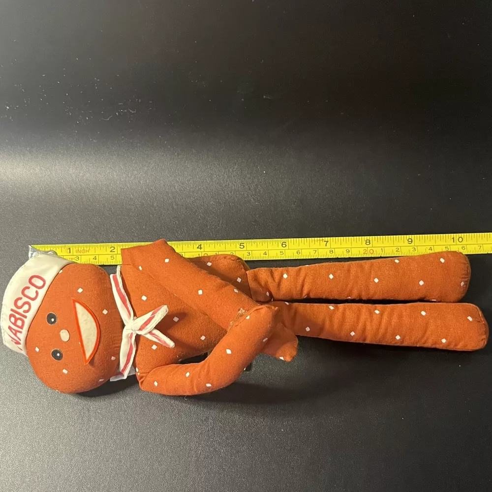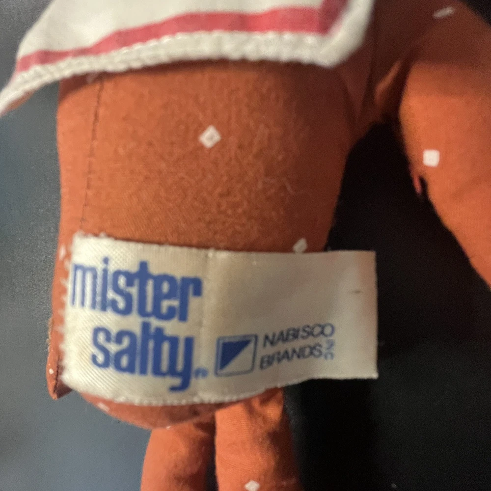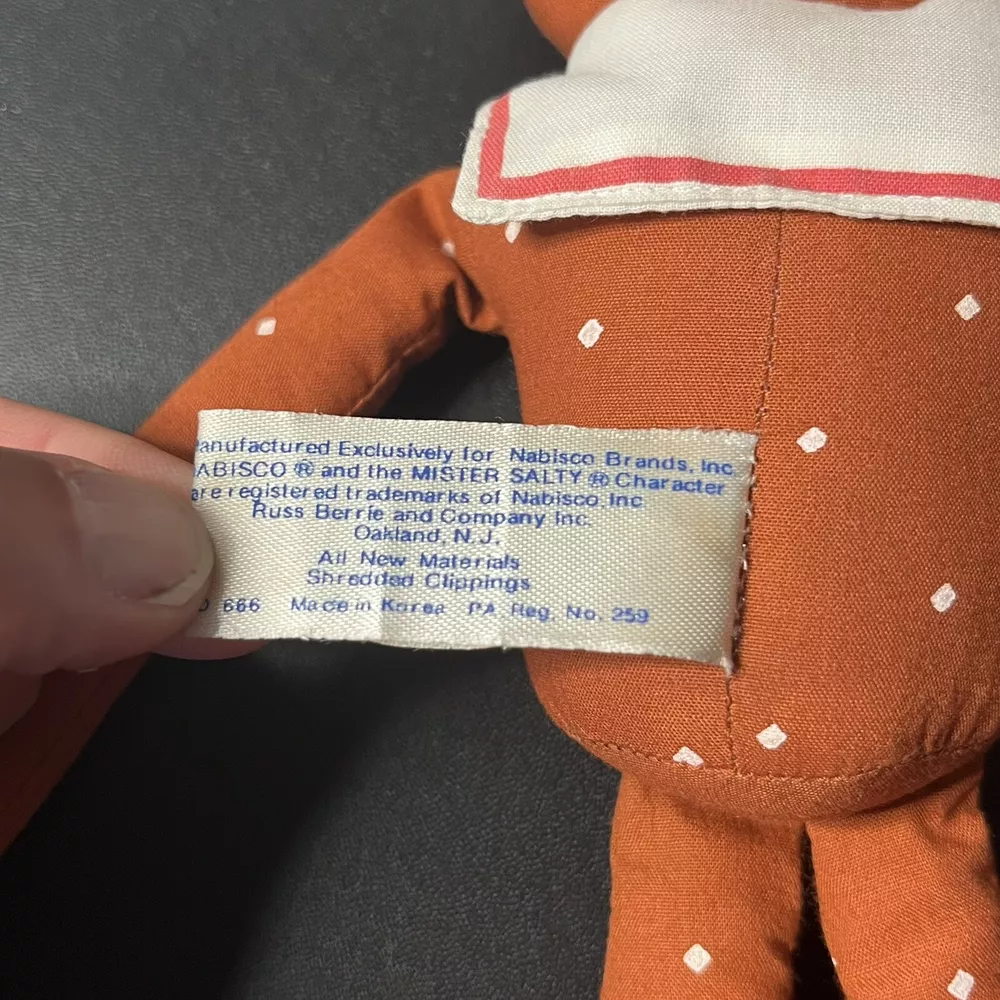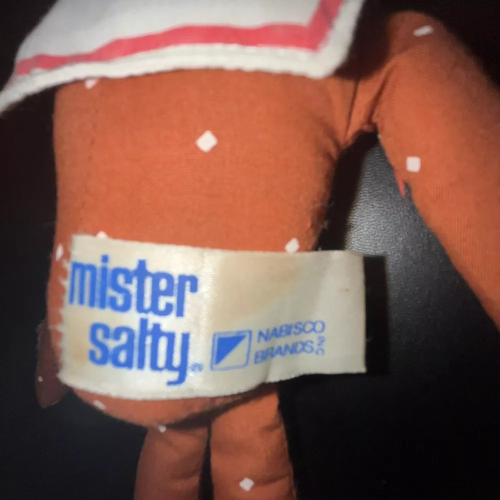 VTG Nabisco MISTER MR SALTY Promo Pretzel Doll Hang Hook Loop Plush Russ Berrie Some Discoloration / Stains from age. No cleaning was attempted. All cleaning is being left to buyer. See photos for details.