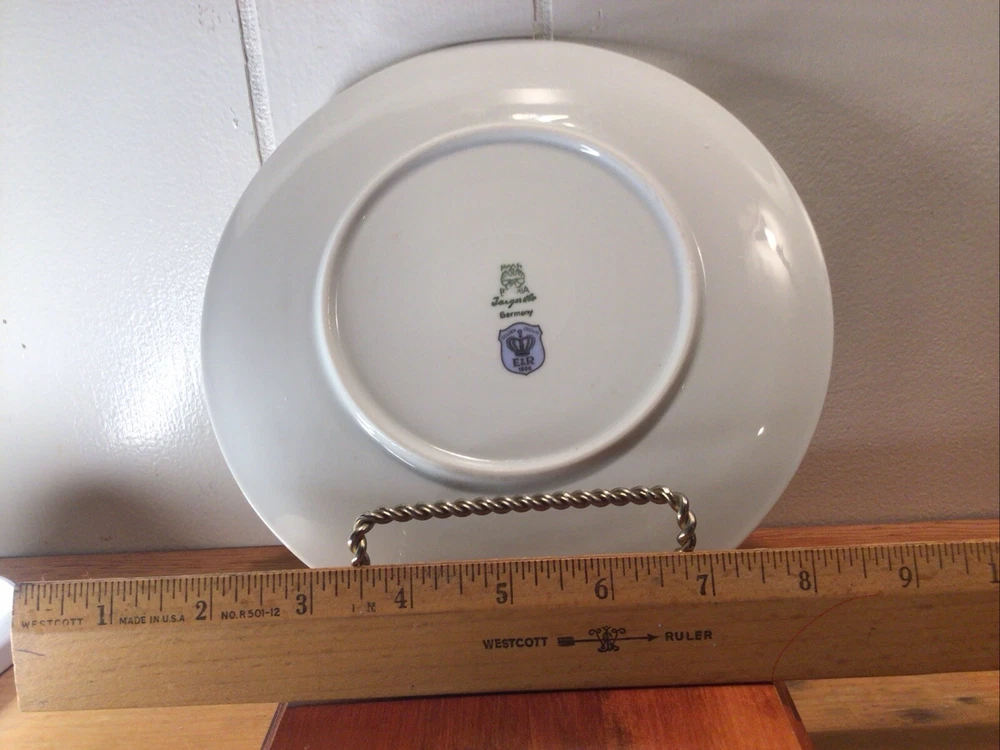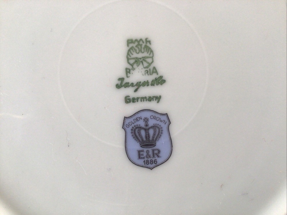 This vintage salad/lunch plate from Crown Bavaria is a beautiful addition to any collection. The round plate features a glossy finish and is made of porcelain with a Berries pattern in white. The plate was manufactured in Germany in 1886 and is an original piece from the American Empire style. The plate is suitable for all occasions and is perfect for serving salad or lunch. It is recommended to hand wash only for care instructions. The set includes one salad plate and one regular plate. The backstamp is printed and the production technique is pottery. This plate is a great representation of the mid-20th century (1941-1969) era and is sure to impress any collector.