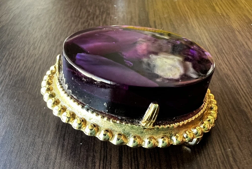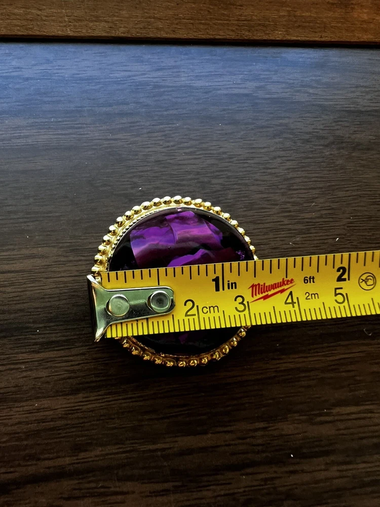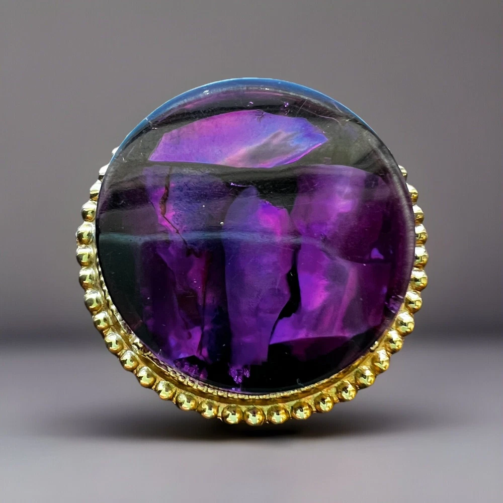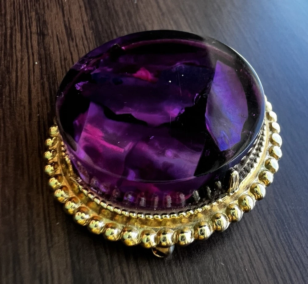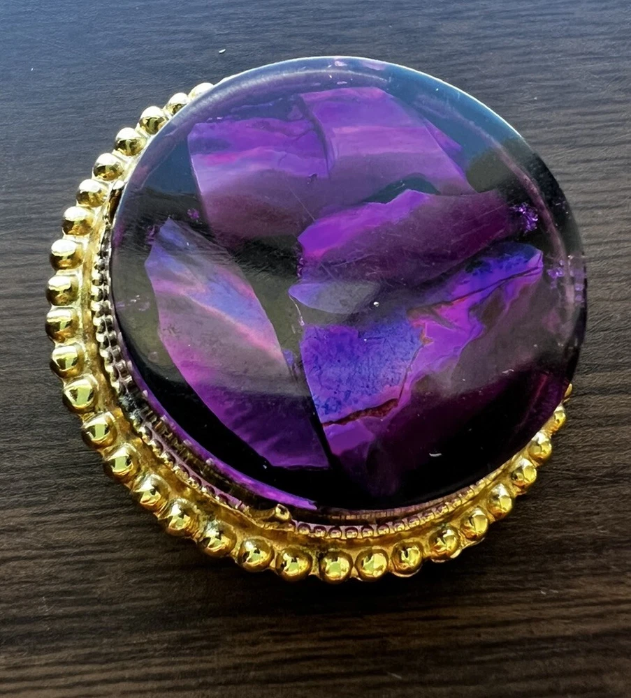 This vintage brooch features a round faux amethyst glass/acrylic stone set in a chunky gold tone metal. The purple faceted stone gives it a statement look, perfect for various occasions like Mother's Day, Christmas, or birthdays. Handmade with intricate pavé setting, this unique piece measures 1.5 inches in length and width, making it a bold and stylish accessory for both men and women.