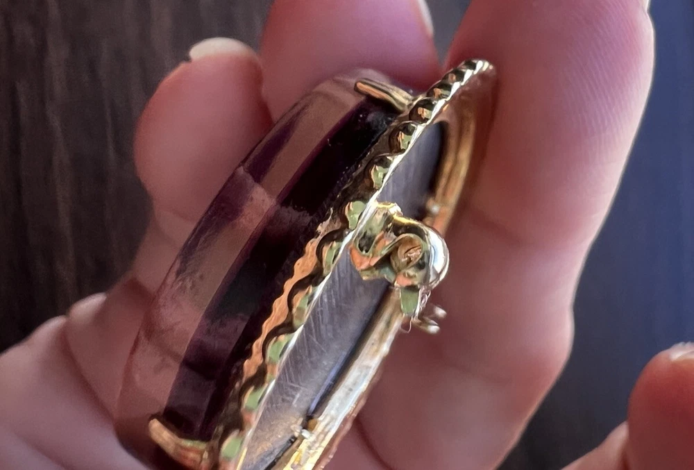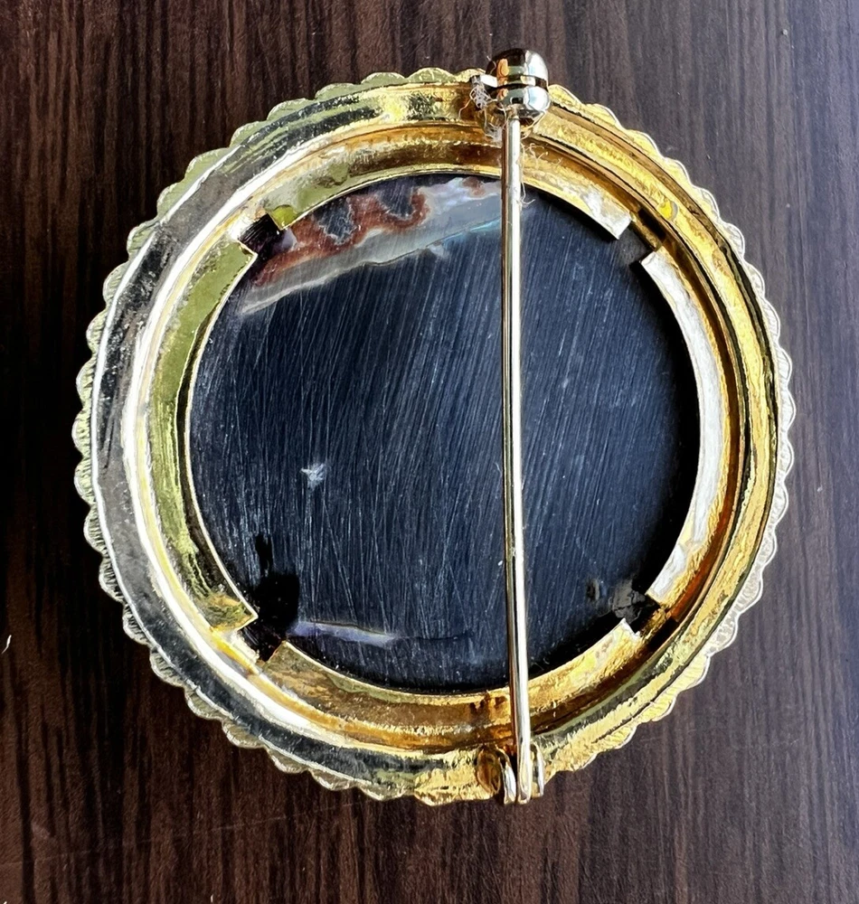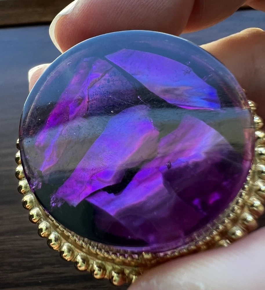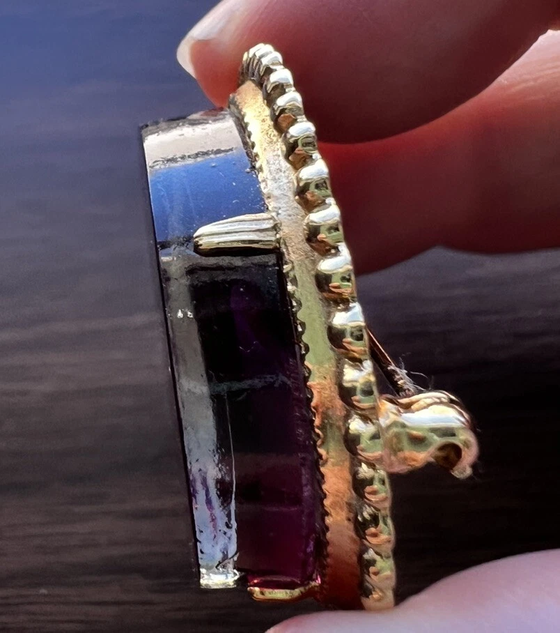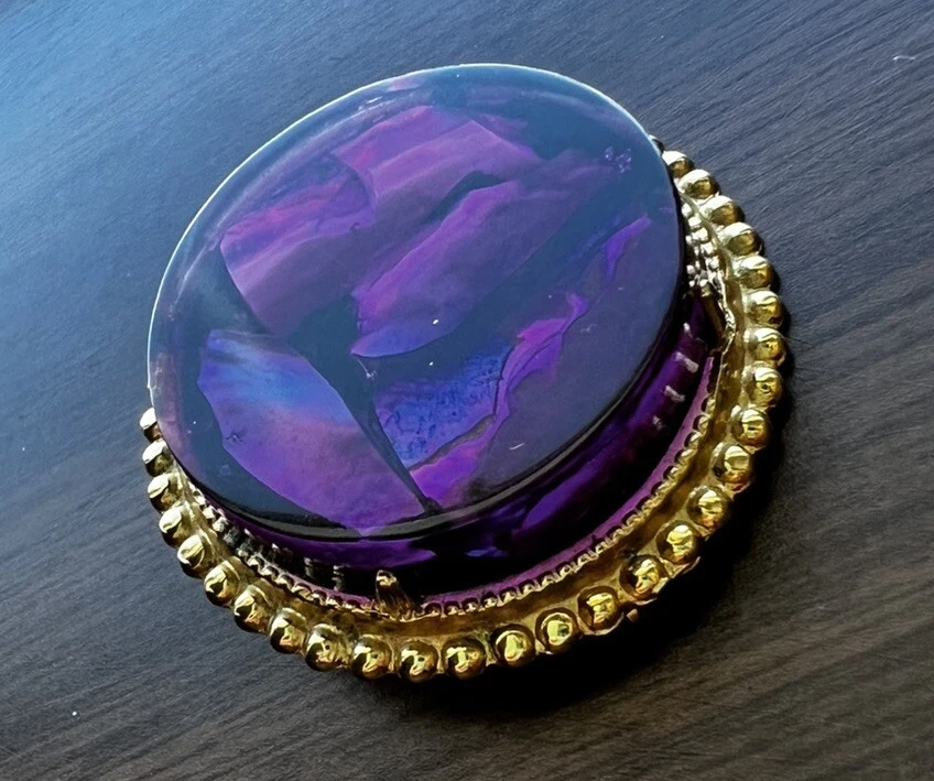 This vintage brooch features a round faux amethyst glass/acrylic stone set in a chunky gold tone metal. The purple faceted stone gives it a statement look, perfect for various occasions like Mother's Day, Christmas, or birthdays. Handmade with intricate pavé setting, this unique piece measures 1.5 inches in length and width, making it a bold and stylish accessory for both men and women.