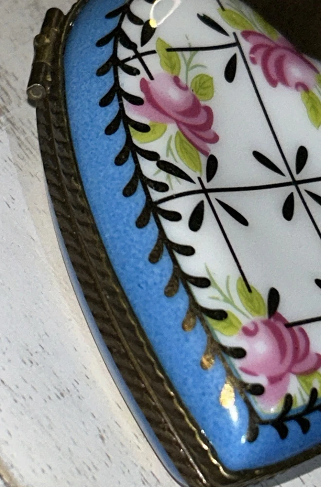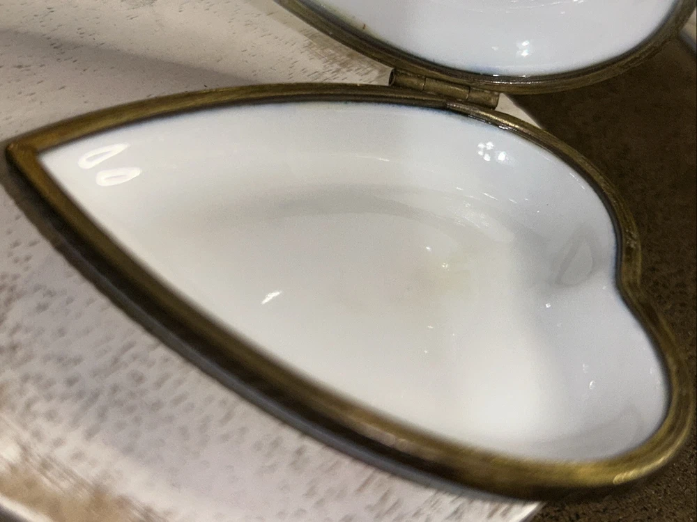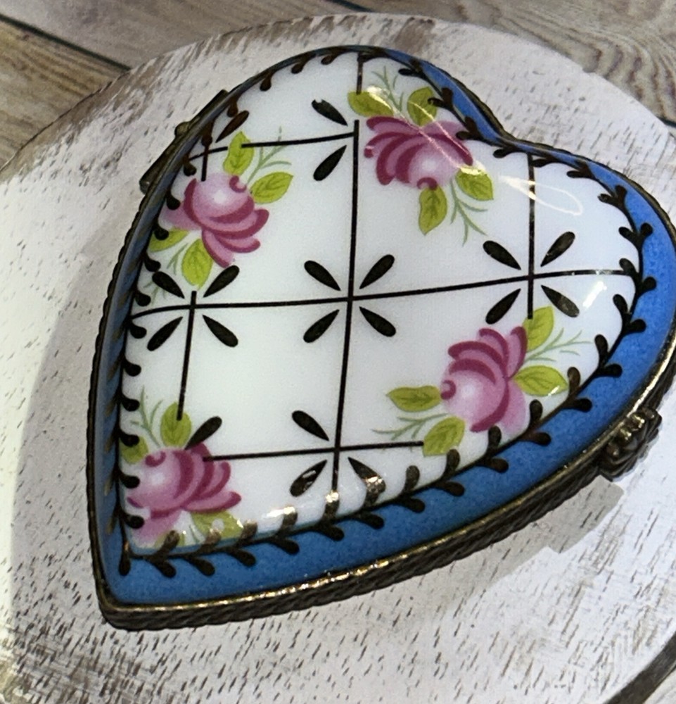VTG Porcelain Je t'aime Love Heart Shaped Trinket Pill Box Limoges Style Hand Painted Pink Flowers With Gold Accents On Baby Blue And White Porcelain 3” Long 2.5” Wide Beautiful Item Very Good Condition See All Pics As Part Of Full Description