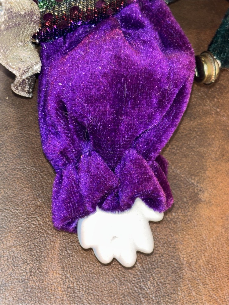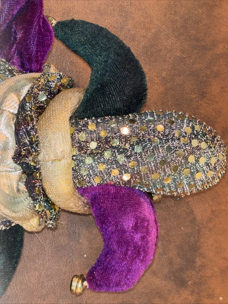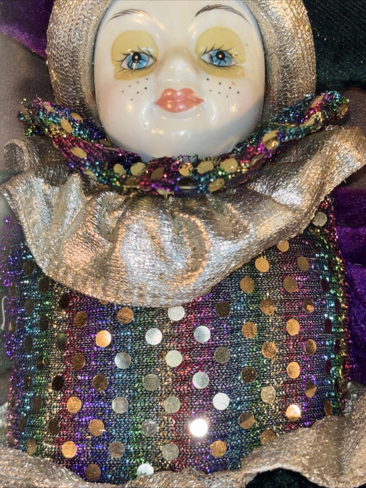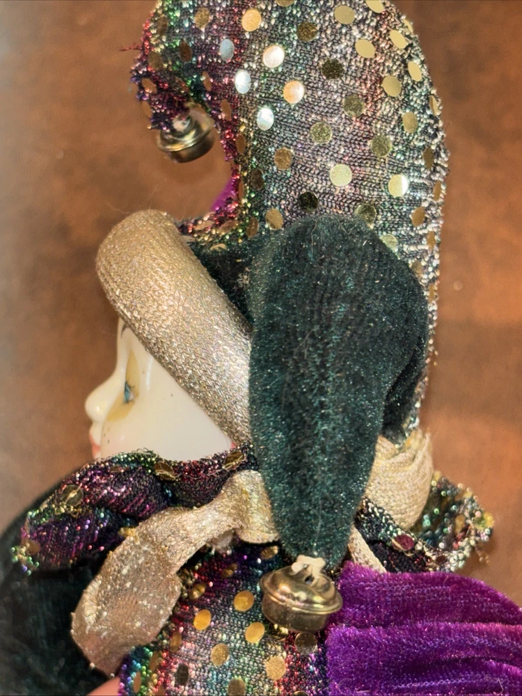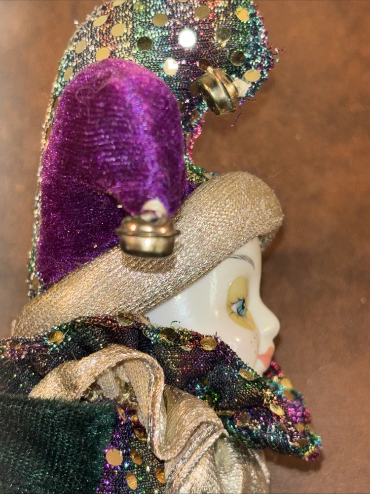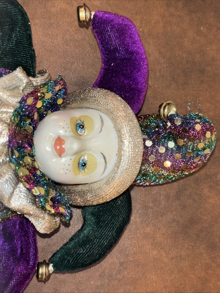 In pre owned very good condition. With a light gray to the center bell of the dolls hat. (Pictured). With the glittery outfit the glitter tends to stick the fabric portions of the outfit making it look dirty. No other signs of damage or ware to the clothes of the doll or to the porcelain hands and face. Sold as is as pictured. The VTG Harlequin Jester Mardi Gras Porcelain Doll Ledge Sitter in Purple and Green is a unique collectible featuring a jester doll designed for Mardi Gras celebrations. The doll is made of porcelain and showcases the signature colors of Mardi Gras - purple, green, and gold. As a ledge sitter, this doll is perfect for display on a shelf or as a decorative accent during the holiday season, adding a touch of whimsy and charm to any space.