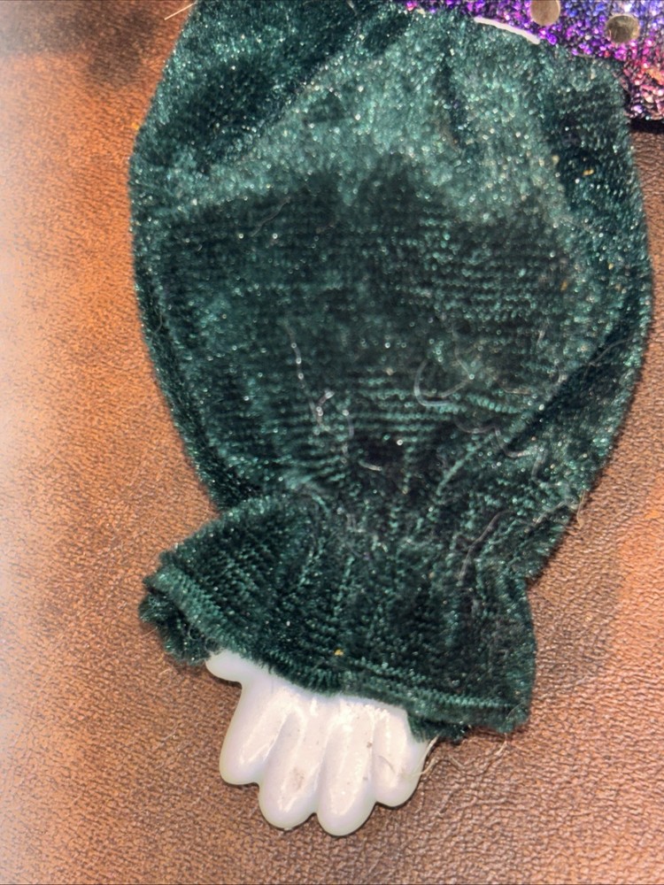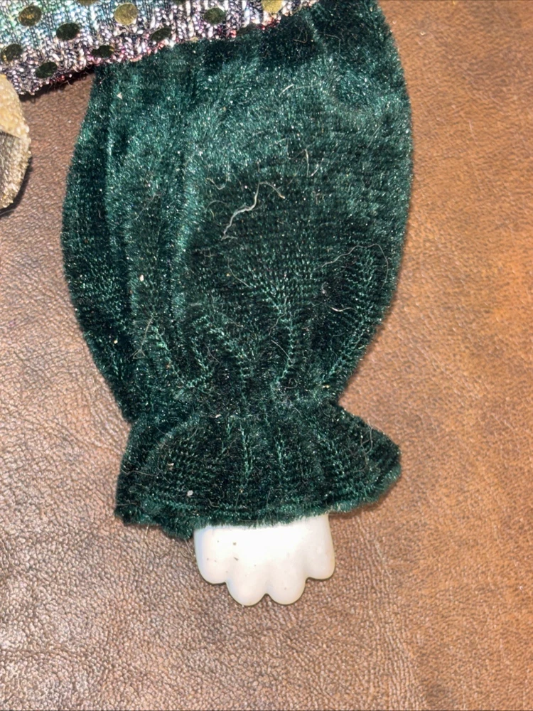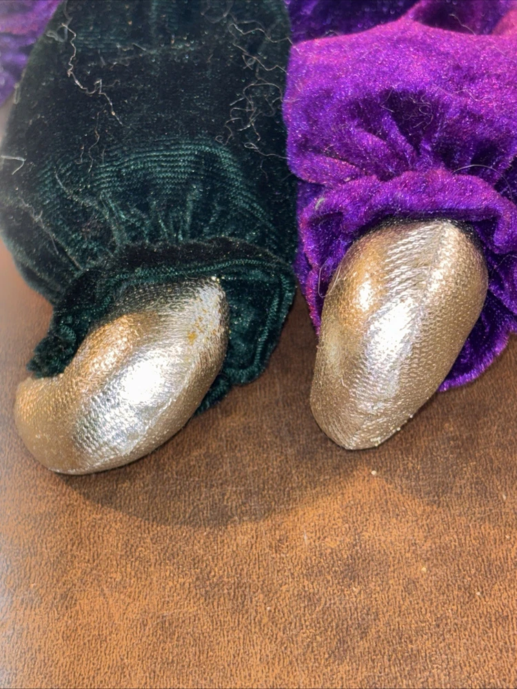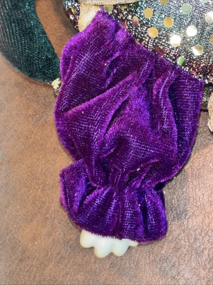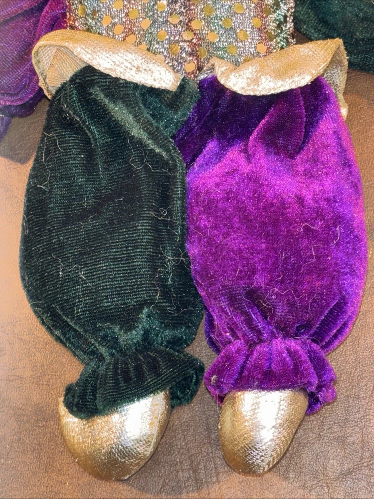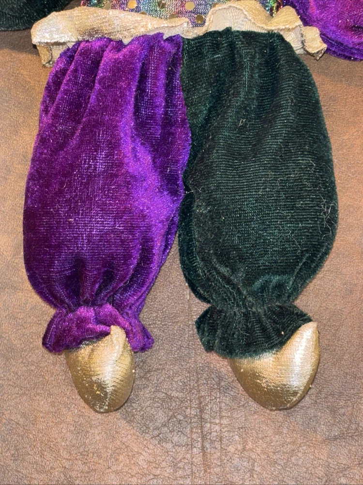 In pre owned very good condition. With a light gray to the center bell of the dolls hat. (Pictured). With the glittery outfit the glitter tends to stick the fabric portions of the outfit making it look dirty. No other signs of damage or ware to the clothes of the doll or to the porcelain hands and face. Sold as is as pictured. The VTG Harlequin Jester Mardi Gras Porcelain Doll Ledge Sitter in Purple and Green is a unique collectible featuring a jester doll designed for Mardi Gras celebrations. The doll is made of porcelain and showcases the signature colors of Mardi Gras - purple, green, and gold. As a ledge sitter, this doll is perfect for display on a shelf or as a decorative accent during the holiday season, adding a touch of whimsy and charm to any space.