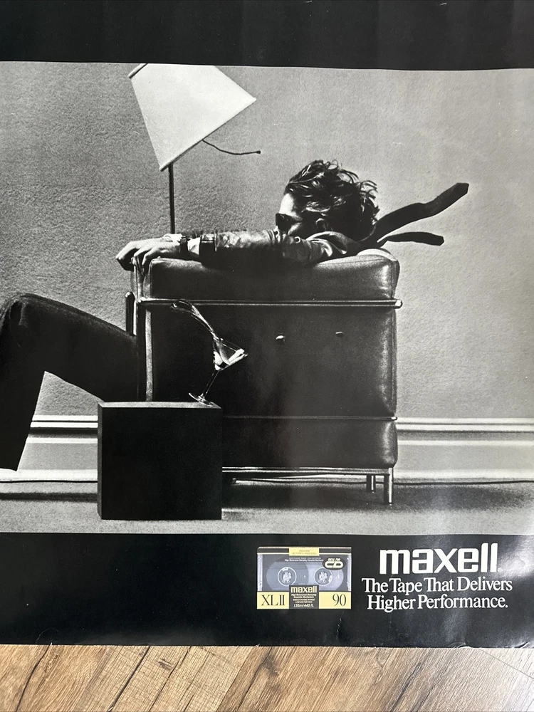 This is an original 1990 poster. It’s an ad for Maxell Cassette Tapes. Blown Away Guy. “Maxell the Tape that Delivers Higher Performance” in bottom right corner. Good condition, but has a minor tear on upper right edge and some minor white wrinkles around edges. See photos for close-up. Could be custom-matted to exclude these minor white marks and tiny corner pinholes, if framing, as they are just around the 1”edge of poster. See photos. The central artwork/photo part is in very good condition. It’s been rolled up for 34 years and will ship rolled in a tube. Measures. 20” x 39.5”.