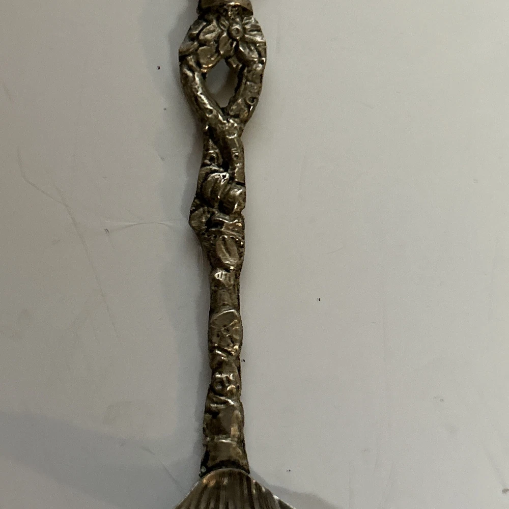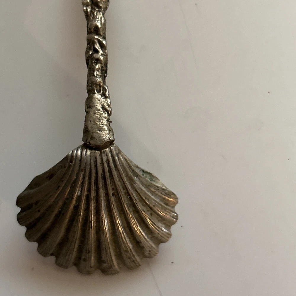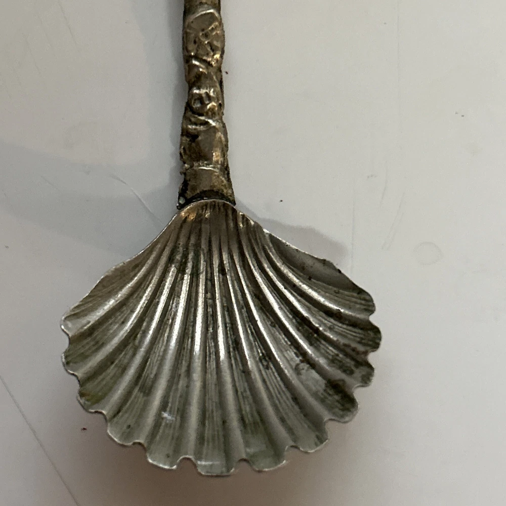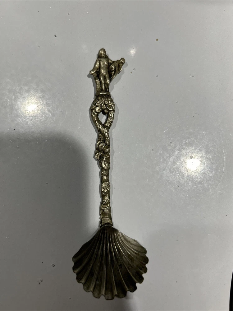 Vintage Scalloped Sugar Spoon Silver Plate Decorative Roman Figure Motif Italy. Has some patina from age (photos) Great condition 4”