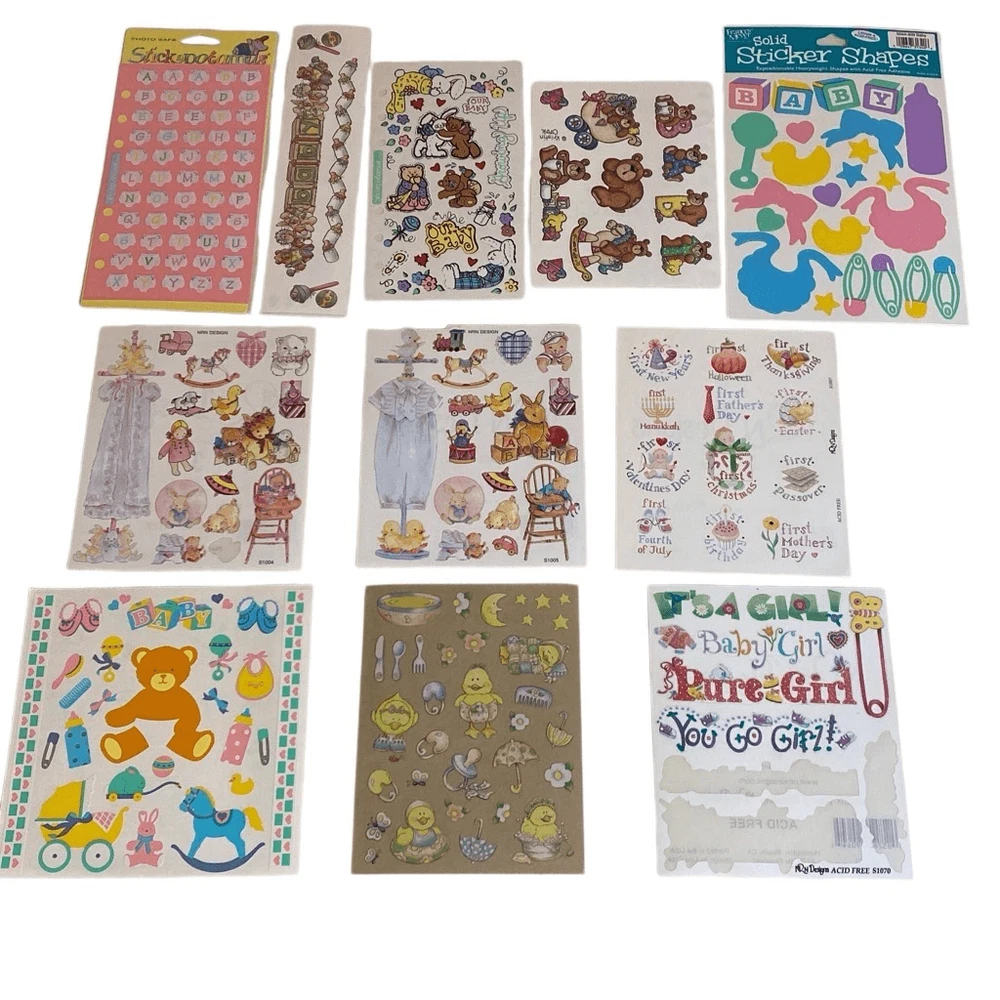VTG Stickers Mix Lot 24 Sheets Baby Girl Boy Toys Scrapbooking Variety READ 24 sheets vintage baby theme stickers. Variety of brands and images. only 1 sheet is partial. Please see pictures.
