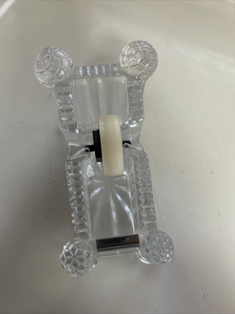 This vintage tape dispenser is a beautiful addition to any desktop. Made of lead crystal and glass, it exudes elegance and sophistication. The ornate design adds a touch of glamour to your workspace. Crafted with care, this tape dispenser is a unique collectible item. It is perfect for those who appreciate vintage pieces or those who are looking for a conversation starter. The country/region of manufacture is unknown, but the quality of this piece speaks for itself. Add a touch of charm to your desk with this stunning piece. Excellent condition!