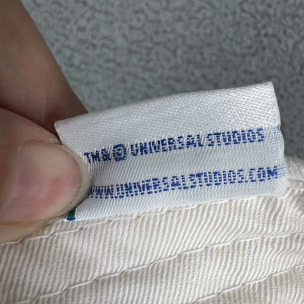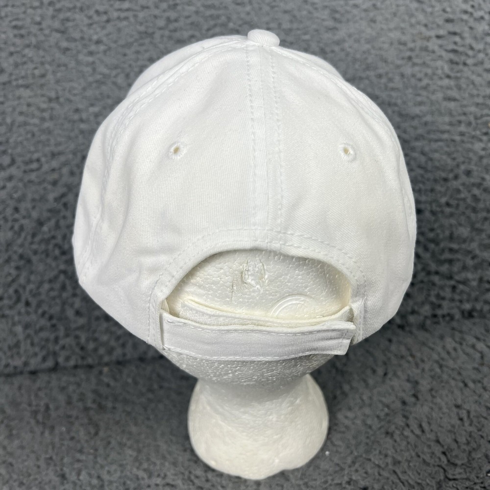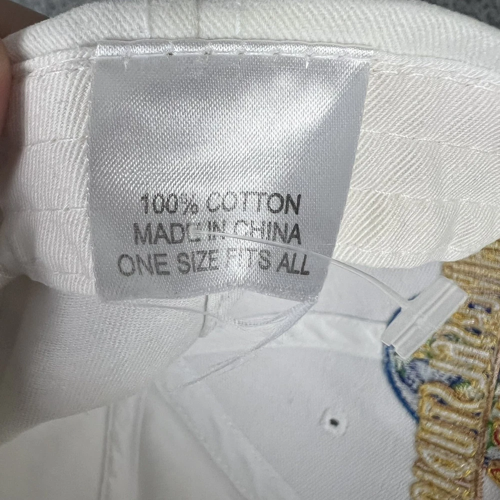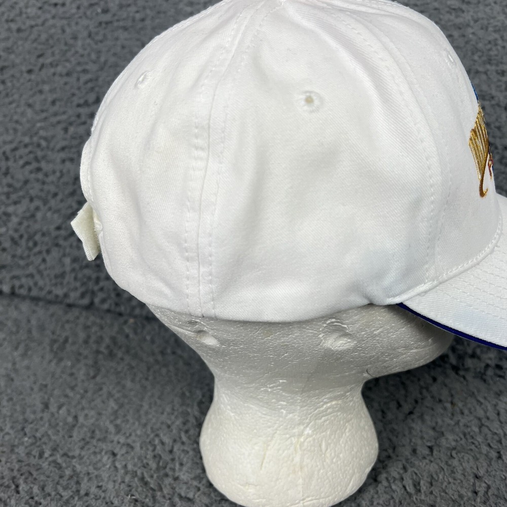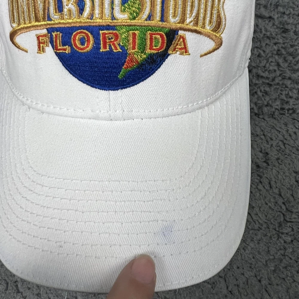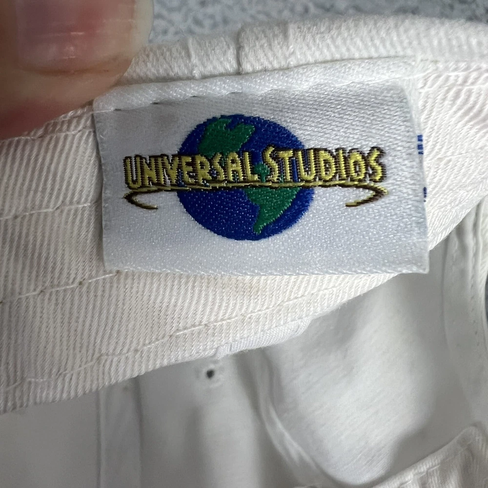 This vintage Universal Studios Florida cap is a must-have for any fan of the amusement park. With its adjustable strapback and unisex design, it's perfect for casual occasions like sportswear or a day at the beach. The cap is made of comfortable cotton material and features the iconic Universal Studios logo on the front. The cap is an original piece from the 1990s and was manufactured in China. Its white color and sporty style make it a great addition to any collection of vintage accessories. Whether you're a dad or just a fan of Universal Studios, this cap is sure to be a conversation starter. NOTE: there is a small blue smudge on the top of the cap.. shown in last pic