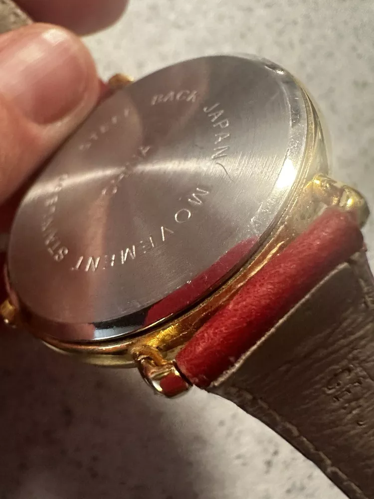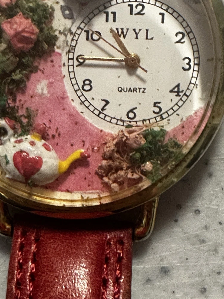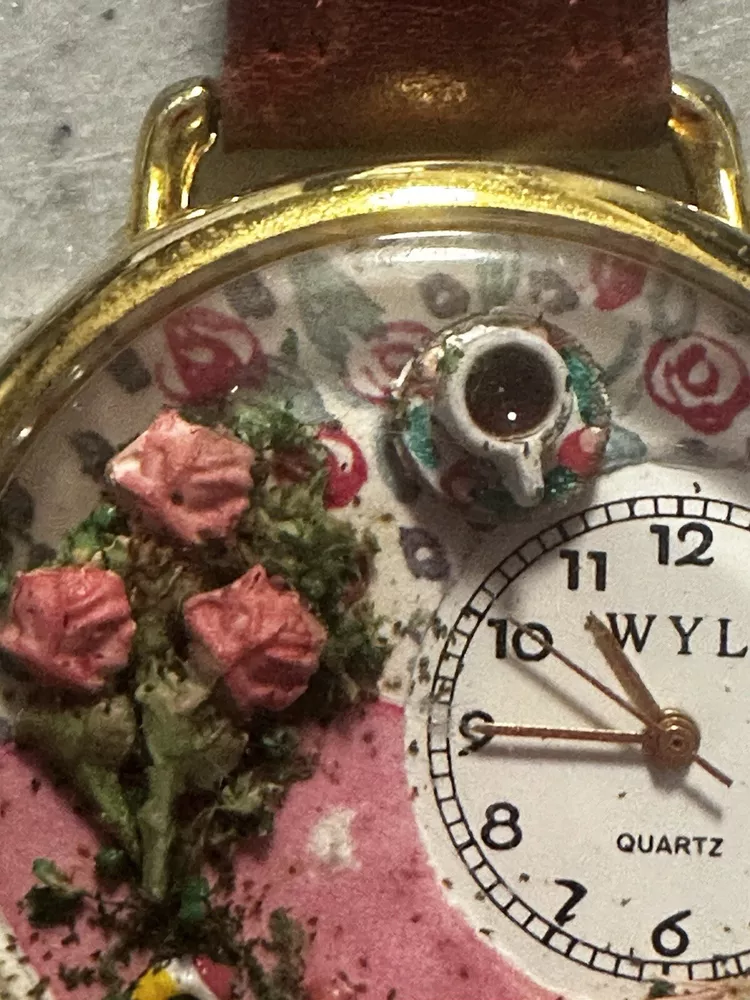 This vintage Whimsical Watches teapot and cup set is a unique addition to any watch collection. The silver case color and pink band material make it a stylish accessory for women. It features a Japanese quartz movement, buckle closure, and a round watch shape. The watch is water-resistant, has acrylic crystal, and a seconds hand, along with a 12-hour dial. The push/pull crown allows for easy adjustment, and it comes with features like a food & drink theme, handmade design, and no papers or service records. This casual wristwatch is perfect for everyday wear and is a must-have for watch enthusiasts.