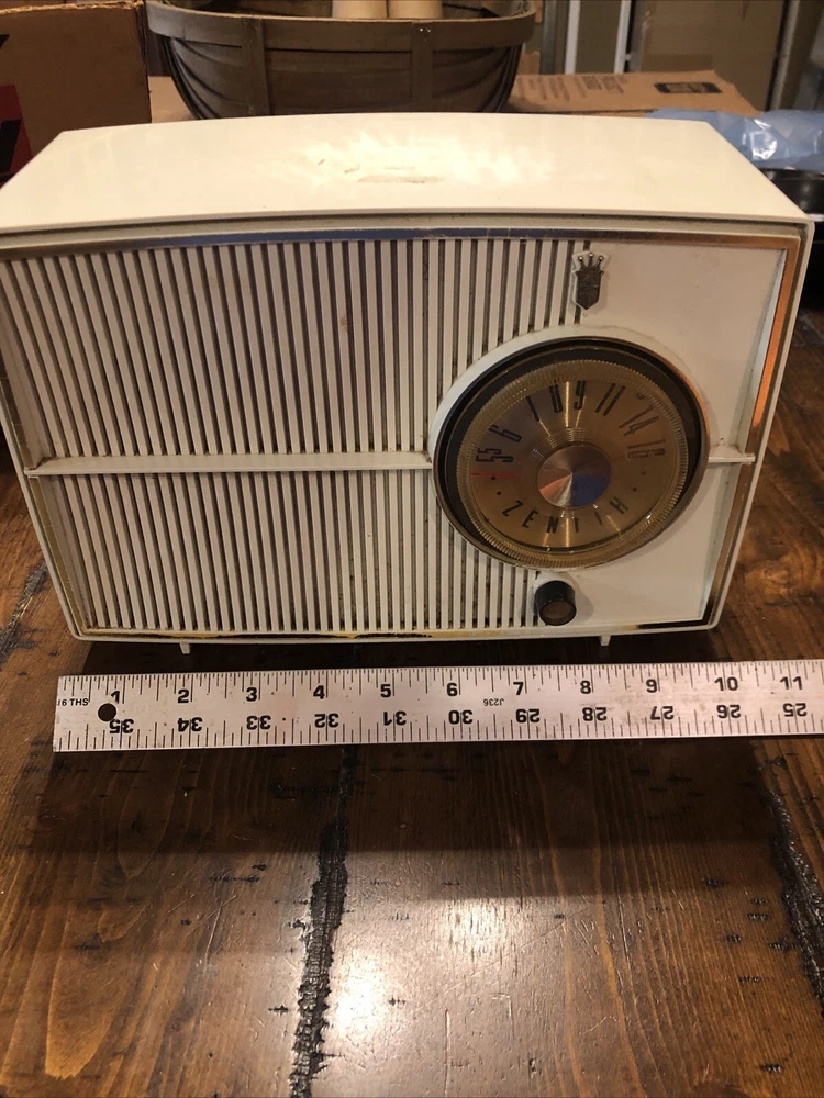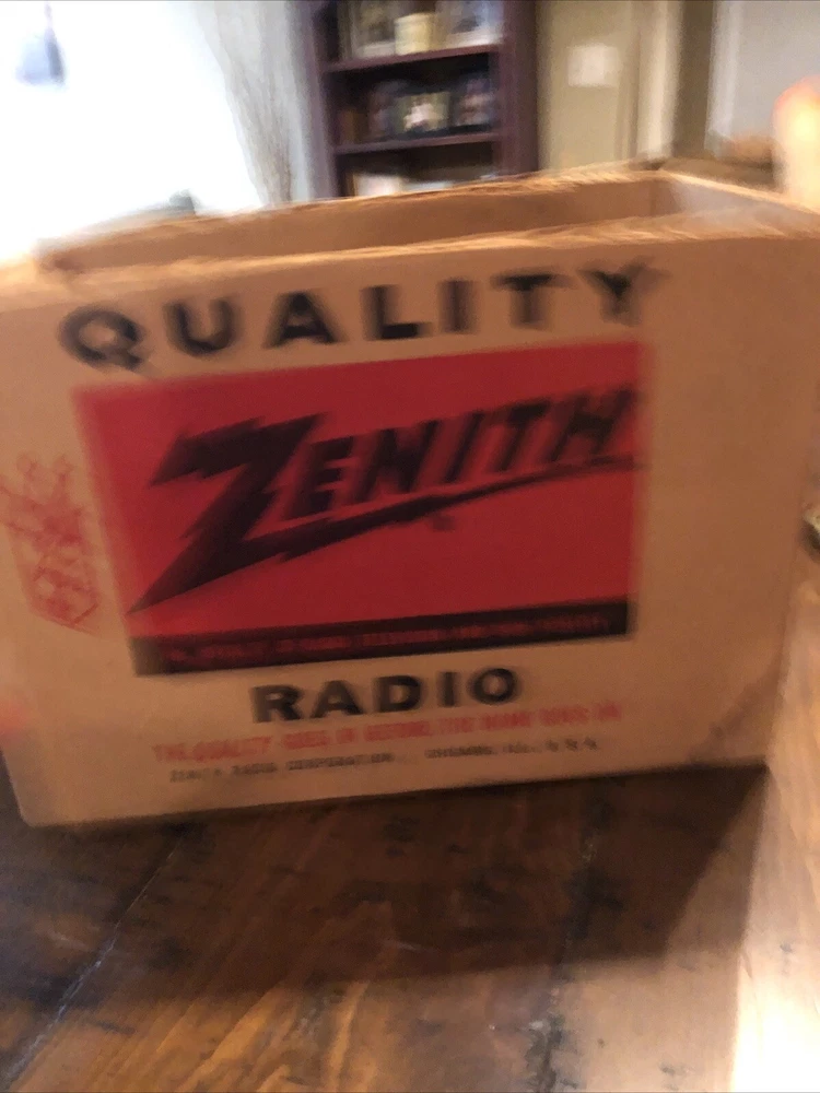 This is a zenith radio in the original box. This is in really good condition. I see no damage. Has some sticky something on top., should clean up. I have not tried to clean this. This does power up when turned on but only hums. Please view the pictures for item description. I will ship after payment five days a week.
