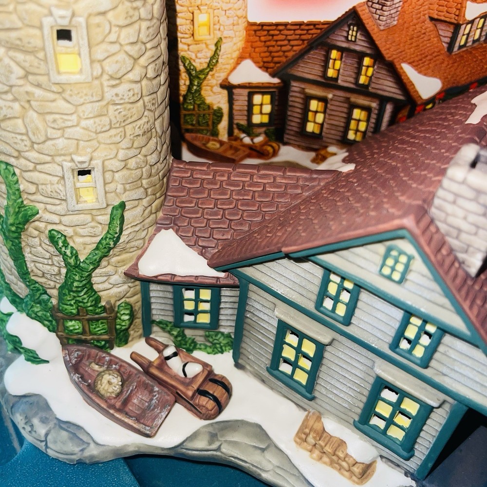 Elevate your festive display with the Santa's Workbench Collection Victorian Series' Cape Christiana Lighthouse. A charming addition to any Christmas village setup, this medium-sized porcelain piece boasts intricate detailing and a cozy nautical theme, complete with a lighthouse design that captures the spirit of the season. Measuring at 11.5 inches in height, 8.25 inches in length, and 4 inches in width, this asymmetrical ornament fits seamlessly in any room, creating a warm and inviting atmosphere. Crafted in 2000, this retired collectible comes packaged in a box and foam for safekeeping, making it a timeless treasure for holiday enthusiasts and collectors alike.