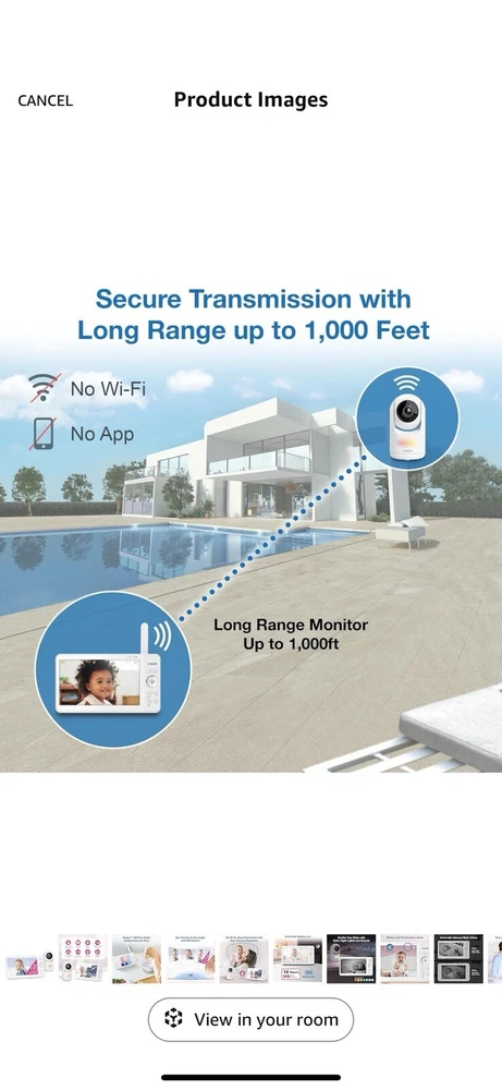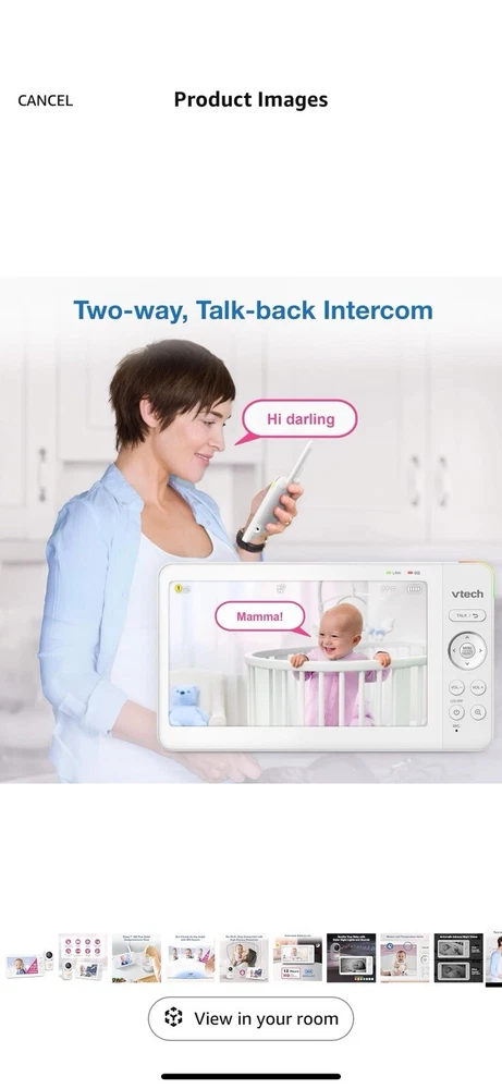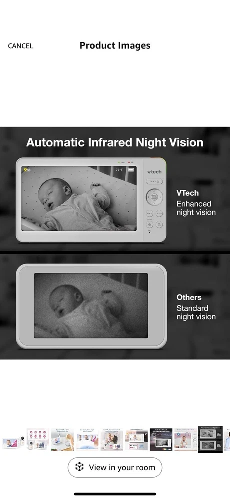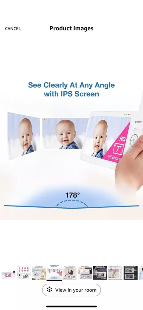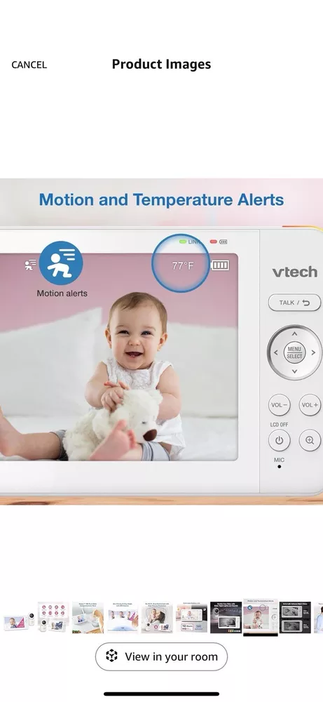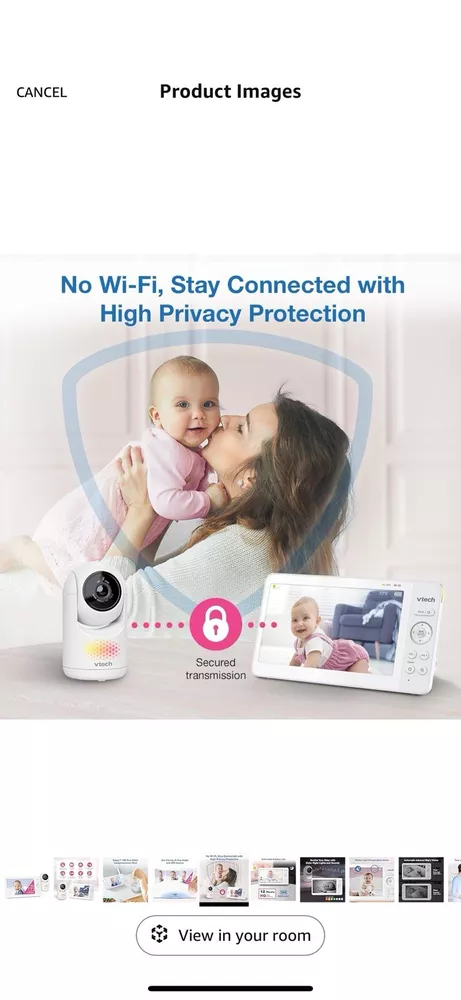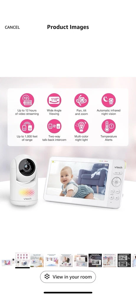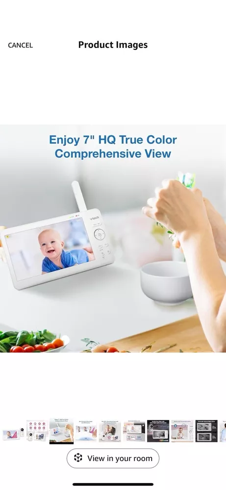 VTech Advanced HQ Max 7" Digital Video Baby Monitor with Pan Tilt Zoom, Long Battery Life 5000mAh, IPS Screen, Touch Control Multi-Color Night Light, 2-Way Talk, HQ Display, Lullabies, No WiFi, White Recommended Uses For Product Pet Monitoring, Baby Monitoring Brand VTech Model Name Advanced HQ Max Connectivity Technology Wireless Special Feature Night Vision, 2-Way Audio, PTZ Technology, Soothing Sounds & Lullabies, Motion Sensor Indoor/Outdoor Usage Indoor 7" True-Color HQ IPS LCD Screen】 Advanced HQ Max baby monitor boasts a high-quality 7-inch color LCD screen that provides a clear, detailed view of your baby. With its 178° view of IPS Screen, it ensures you can easily see every little movement and expression with crystal clear images at any angle. Remote Pan, Tilt & Zoom with wide angle view 110 degree】 The Advanced HQ Max baby camera can be remotely panned with 360° panoramic view and tilted up and down for 122°, up to 4X zoom from the parent unit. This HQ video baby monitor is equipped with HQ camera with SPLIT-SCREEN option (when more than 1 camera is paired), allowing to see both cameras or babies side by side on the same screen. Touch control Adaptive Night Light】 The built-in night light on the baby monitor automatically adjusts its brightness based on the ambient lighting in the nursery. This creates a soothing, calming atmosphere that helps lull your little one into a peaceful sleep without disrupting their natural circadian rhythms. You can choose 7 different colors from the parent unit. Comfort with Soothing Sounds and Temp sensor】 5 calming melodies and 5 soft ambient sounds, including a trickling stream and white noise, create a comforting environment to soothe baby. Temperature sensor with indicator helps parents know the comfort level of the nursery. Long-Lasting Battery Life】 5000mAh rechargeable battery in baby monitor, provides up to 12 hours of continuous video streaming, ensuring you can monitor your little one throughout the day without constant recharging. See less Product specifications Night Vision Night Vision Night Color Power Wattage 15 Watt-hours Battery Power 5000 Are Batteries Required Yes Video Video Capture Format MJPEG Video Quality Video Capture Resolution 720p