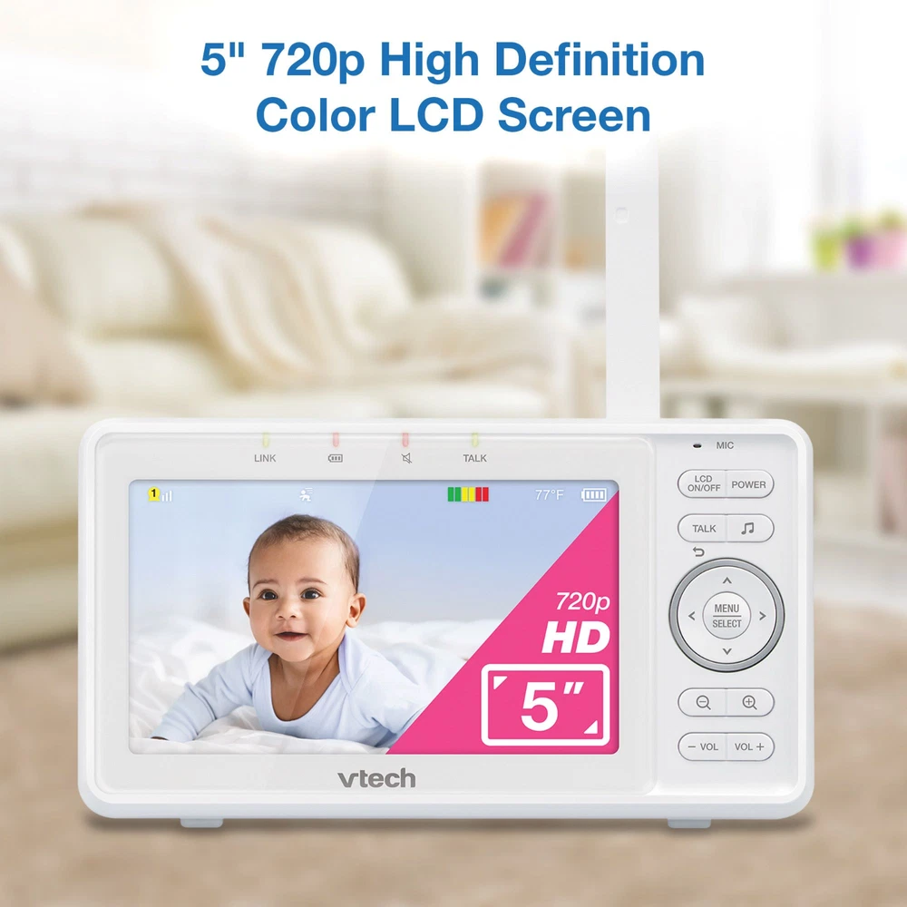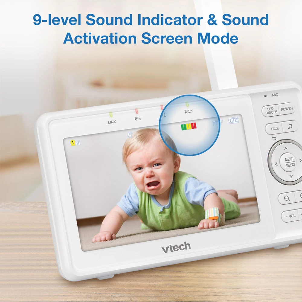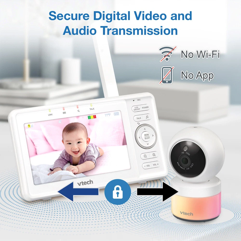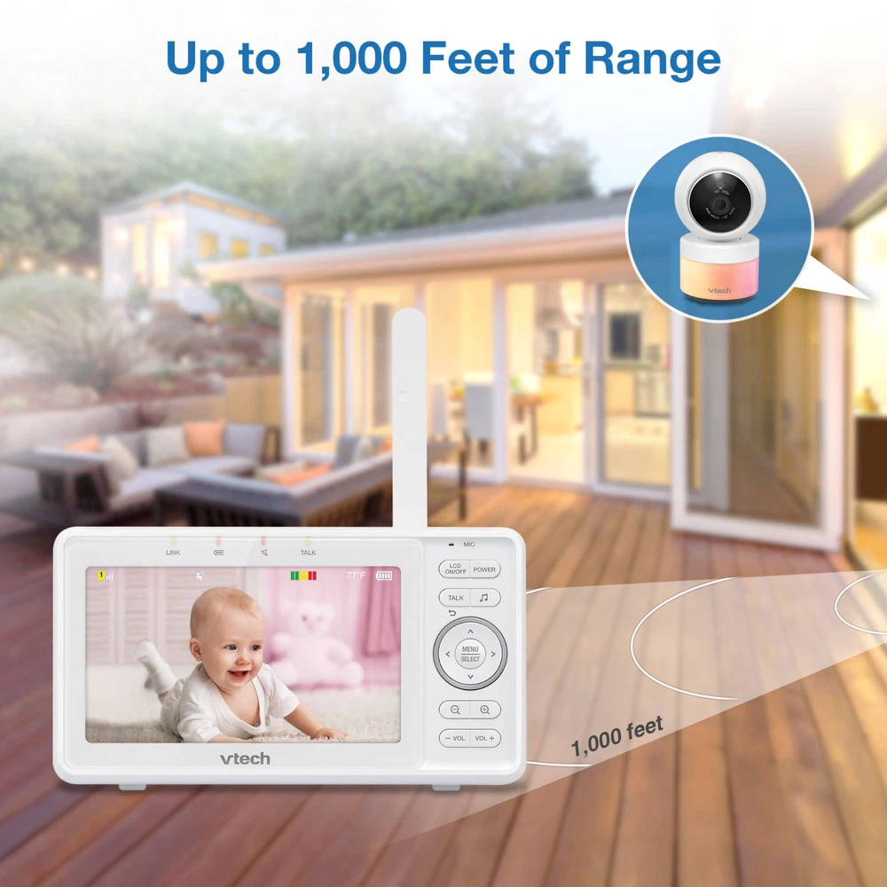 Video Baby Monitor with Pan and Tilt and Night Light Check in on your little one with a large, 5-inch LCD screen on the VTech VM5263 Digital Video Pan Scan Baby Monitor with Night Light. This video monitor lets you pan and tilt to get a better look at every angle in the nursery using the long-range parent unit. Soothe your baby using the adaptive multicolor night light that adjusts to the lighting of the nursery and lullabies and soft sounds that play right from the baby unit. Plus, you can make sure your infant is cozy by monitoring the nursery temperature that’s displayed right on the large 5” LCD screen. Best of all, you can check in during nap time or after dark thanks to automatic infrared night vision. Key Features High-resolution, 5-inch color LCD screen Clearly see your baby's every little move while doing dishes or from your bed. When you check in on your baby, it'll feel like you've never left their room. Pan, tilt and zoom the camera from the parent unit Watch as your little one moves about. The camera pans up to 270 degrees side-to-side and tilts as many as 25 degrees up and down. Need more details? The camera zooms up to 2 times. Adaptive night light on baby unit A soothing light on the baby unit gently illuminates a dark nursery. This adaptive night light automatically adjusts to the brightness of your nursery to ensure the optimum light in daytime and nighttime that creates the best sleeping environment. Choose from seven different colors. Soothing sounds and lullabies Choose from five calming melodies and four soft ambient sounds, to help your baby slip into a sweet slumber. Two-way, talk-back intercom Sometimes all your baby needs is to hear the sound of your voice. Comfort your infant from any room with the built-in intercom on the portable parent unit. Temperature sensor Keep your little one in a cozy environment. The temperature indicator on the parent unit lets you know about when to adjust the thermostat. Automatic infrared night vision The camera automatically detects dim light, so you can see your baby stretch and yawn even in dark rooms. Additional Features and Information High-resolution, 5-inch color LCD screen Adaptive night light on baby unit Pan, tilt and zoom the camera from the parent unit Soothing sounds and lullabies Sound activated soothing - turns on the night light or projection when sound is detected. Two-way, talk-back intercom Up to 1,000 feet of range Temperature sensor Up to 12 hours of battery life 9-level sound indicator Automatic infrared night vision Wall-mountable Secure digital video and audio transmission Sound activation screen mode Volume control IMPORTANT INFO While we do our best to describe the item and take utmost care to package it but as humans we are capable of making mistakes. We sell a lot of open box items and that is why you always get the best prices in our store but expectations could vary for every buyer. If there is ANY issue with the product you have received, please contact us and we will rectify the issue. After any transaction ebay gives you a chance to leave feedback and DSR ratings for the seller. We strive for a 100% positive feedback and 5 Star EBAY DSR ratings. Please contact us if you plan to leave any less than a 5 star rating for us. We will do our best. This is our promise. If you are unhappy and would like to return the item, we will do that gladly. We will get the item back and will issue a full refund. You can buy from us with complete confidence. Warranty We offer a warranty period of 30 days for all our products, during which we will be happy to replace the item, if we are unable to provide a replacement or repair the item, we will issue a full refund. Contact us We can be contacted at any time through eBay messages if you have any questions, comments or product requests. We will respond to you within 48 hours and do our best to help you out! We encourage our customers to contact us with any questions or concerns! We'd like to be sure you are completely satisfied with your purchase. Why Buy From Us While there are tons of open box products being sold on ebay, We are different in their approach towards consumer satisfaction. We stand behind our sales & hold full responsibility towards what we sell. Our items are fully tested and functional and ship with all required peripherals and manuals (electronic manuals are provided where paper manual is not available), packaged nicely.