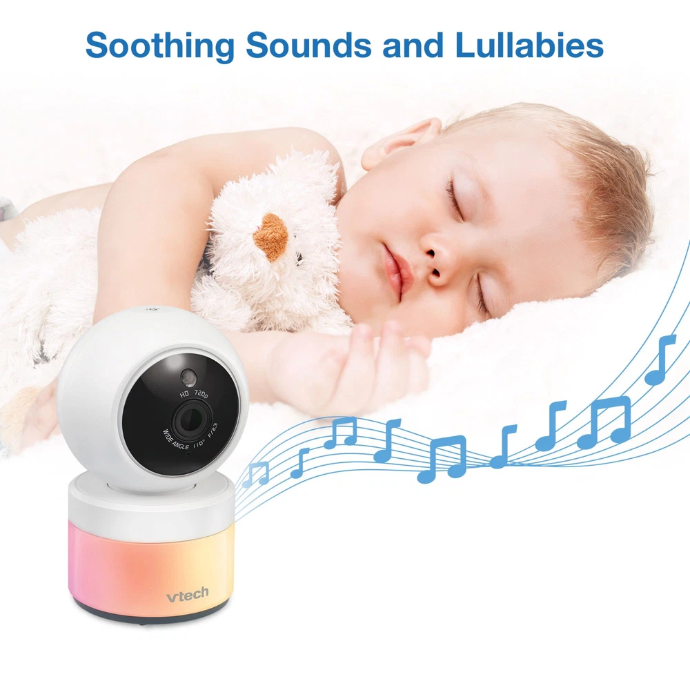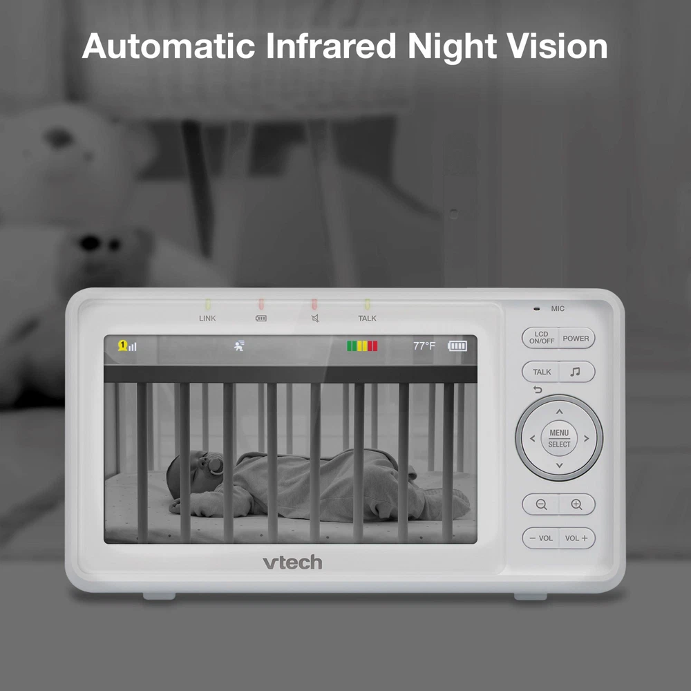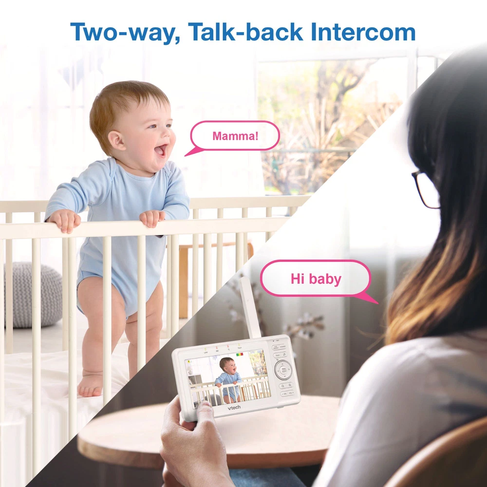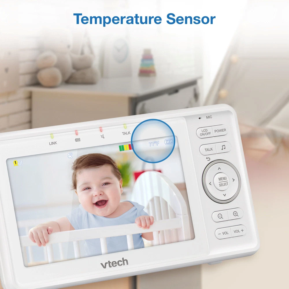 Video Baby Monitor with Pan and Tilt and Night Light Check in on your little one with a large, 5-inch LCD screen on the VTech VM5263 Digital Video Pan Scan Baby Monitor with Night Light. This video monitor lets you pan and tilt to get a better look at every angle in the nursery using the long-range parent unit. Soothe your baby using the adaptive multicolor night light that adjusts to the lighting of the nursery and lullabies and soft sounds that play right from the baby unit. Plus, you can make sure your infant is cozy by monitoring the nursery temperature that’s displayed right on the large 5” LCD screen. Best of all, you can check in during nap time or after dark thanks to automatic infrared night vision. Key Features High-resolution, 5-inch color LCD screen Clearly see your baby's every little move while doing dishes or from your bed. When you check in on your baby, it'll feel like you've never left their room. Pan, tilt and zoom the camera from the parent unit Watch as your little one moves about. The camera pans up to 270 degrees side-to-side and tilts as many as 25 degrees up and down. Need more details? The camera zooms up to 2 times. Adaptive night light on baby unit A soothing light on the baby unit gently illuminates a dark nursery. This adaptive night light automatically adjusts to the brightness of your nursery to ensure the optimum light in daytime and nighttime that creates the best sleeping environment. Choose from seven different colors. Soothing sounds and lullabies Choose from five calming melodies and four soft ambient sounds, to help your baby slip into a sweet slumber. Two-way, talk-back intercom Sometimes all your baby needs is to hear the sound of your voice. Comfort your infant from any room with the built-in intercom on the portable parent unit. Temperature sensor Keep your little one in a cozy environment. The temperature indicator on the parent unit lets you know about when to adjust the thermostat. Automatic infrared night vision The camera automatically detects dim light, so you can see your baby stretch and yawn even in dark rooms. Additional Features and Information High-resolution, 5-inch color LCD screen Adaptive night light on baby unit Pan, tilt and zoom the camera from the parent unit Soothing sounds and lullabies Sound activated soothing - turns on the night light or projection when sound is detected. Two-way, talk-back intercom Up to 1,000 feet of range Temperature sensor Up to 12 hours of battery life 9-level sound indicator Automatic infrared night vision Wall-mountable Secure digital video and audio transmission Sound activation screen mode Volume control IMPORTANT INFO While we do our best to describe the item and take utmost care to package it but as humans we are capable of making mistakes. We sell a lot of open box items and that is why you always get the best prices in our store but expectations could vary for every buyer. If there is ANY issue with the product you have received, please contact us and we will rectify the issue. After any transaction ebay gives you a chance to leave feedback and DSR ratings for the seller. We strive for a 100% positive feedback and 5 Star EBAY DSR ratings. Please contact us if you plan to leave any less than a 5 star rating for us. We will do our best. This is our promise. If you are unhappy and would like to return the item, we will do that gladly. We will get the item back and will issue a full refund. You can buy from us with complete confidence. Warranty We offer a warranty period of 30 days for all our products, during which we will be happy to replace the item, if we are unable to provide a replacement or repair the item, we will issue a full refund. Contact us We can be contacted at any time through eBay messages if you have any questions, comments or product requests. We will respond to you within 48 hours and do our best to help you out! We encourage our customers to contact us with any questions or concerns! We'd like to be sure you are completely satisfied with your purchase. Why Buy From Us While there are tons of open box products being sold on ebay, We are different in their approach towards consumer satisfaction. We stand behind our sales & hold full responsibility towards what we sell. Our items are fully tested and functional and ship with all required peripherals and manuals (electronic manuals are provided where paper manual is not available), packaged nicely.